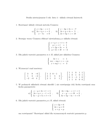 Studia niestacjonarne I rok: lista 4 - uklady równań liniowych 1. Rozwiazać uklady równań metoda, Cramera: , x + 2y − z = 1 a) 3x + y + z = 2 , x − 5z = 0 x − 2y + 3z = −7 b) 3x + y + 4z = 5 , 2x + 5y + z = 18 2. Stosujac , wzory Cramera obliczyć niewiadoma, y z ukladu równań: x+y+z+t= 0 y+z+t = 1 x + 2y + 3z = 2 y + 2z + 3t = −2 3. Dla jakich wartości parametru m ∈ R, uklad jest ukladem Cramera: 3x + z = 1 mx − my + z = −m x + my + z = 3 4. Wyznaczyć rzad , macierzy: 3 9 −6 3 −2 1 , −2 −6 4 1 2 0−1 5 2 3 1 , 2 1 3 1 1 1 0 1 1 0 1 0 1 0 1 −1 1 1 0 0 1 1 0 0 . 5. W podanych ukladach równań określić ( nie rozwiazuj ac oraz , , ich) liczbe, rozwiazań , liczbe, parametrów: x − y + 2z + t = 1 3x + y + z − t = 2 , a) 5x − y + 5z + t = 4 2x + 2y − z + t = 1 x − y − z + 3t = 2 , b) 3x + 5y − 4z − t = 0 6. Dla jakich wartości parametru p ∈ R, uklad równań: x + 2y = 6 2x + y = 9 x+y =p ma rozwiazanie? Rozwiazać uklad dla wyznaczonych wartości parametru p. , , 7. Podać liczbe, rozwiazań w zależności od parametru p i q: , 6x + 4z − 2 = 0 x + py + z−3 =0 , a) px − py + z + p = 0 x − 2y − z 2x + y + pz c) qx + 2y − z 3x − 2y + z 6x + py + 4z = 4p b) 3x + y + 2z = p , 6px + y + 4z = 4 =1 =2 . =0 =1 8. Rozwiazać uklady równań dowolna, metoda:, , x + 2y − z = 0 a) x − y + z = 2 , 3x +z =4 d) x−y+z x+y−z x + 3y − 3z y−z x+y+z =0 =0 =0 , =0 =0 x−y−z+t=0 c) x + y + z − t = 0 , x+y−z+t=0 x + 2y + 3z = 0 −x + y − 2z = 1 , b) x + 5y + 4z = 0 ( e) 2x − y = 1 z+t =2 f) x+y+z x −z y−z x−y x−y−z = 2 = 0 = −1 . = 1 = 0