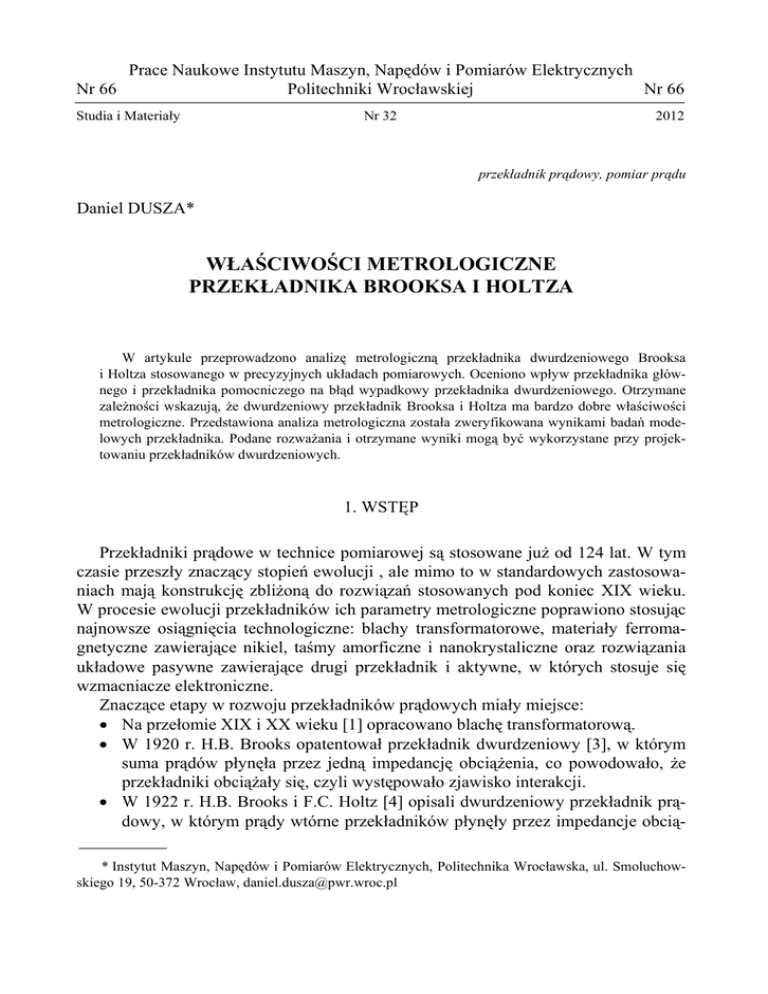 Prace Naukowe Instytutu Maszyn, Napędów i Pomiarów Elektrycznych Nr 66 Politechniki Wrocławskiej Nr 66 Studia i Materiały Nr 32 2012 przekładnik prądowy, pomiar prądu Daniel DUSZA* WŁAŚCIWOŚCI METROLOGICZNE PRZEKŁADNIKA BROOKSA I HOLTZA W artykule przeprowadzono analizę metrologiczną przekładnika dwurdzeniowego Brooksa i Holtza stosowanego w precyzyjnych układach pomiarowych. Oceniono wpływ przekładnika głównego i przekładnika pomocniczego na błąd wypadkowy przekładnika dwurdzeniowego. Otrzymane zależności wskazują, że dwurdzeniowy przekładnik Brooksa i Holtza ma bardzo dobre właściwości metrologiczne. Przedstawiona analiza metrologiczna została zweryfikowana wynikami badań modelowych przekładnika. Podane rozważania i otrzymane wyniki mogą być wykorzystane przy projektowaniu przekładników dwurdzeniowych. 1. WSTĘP Przekładniki prądowe w technice pomiarowej są stosowane już od 124 lat. W tym czasie przeszły znaczący stopień ewolucji , ale mimo to w standardowych zastosowaniach mają konstrukcję zbliżoną do rozwiązań stosowanych pod koniec XIX wieku. W procesie ewolucji przekładników ich parametry metrologiczne poprawiono stosując najnowsze osiągnięcia technologiczne: blachy transformatorowe, materiały ferromagnetyczne zawierające nikiel, taśmy amorficzne i nanokrystaliczne oraz rozwiązania układowe pasywne zawierające drugi przekładnik i aktywne, w których stosuje się wzmacniacze elektroniczne. Znaczące etapy w rozwoju przekładników prądowych miały miejsce: • Na przełomie XIX i XX wieku [1] opracowano blachę transformatorową. • W 1920 r. H.B. Brooks opatentował przekładnik dwurdzeniowy [3], w którym suma prądów płynęła przez jedną impedancję obciążenia, co powodowało, że przekładniki obciążały się, czyli występowało zjawisko interakcji. • W 1922 r. H.B. Brooks i F.C. Holtz [4] opisali dwurdzeniowy przekładnik prądowy, w którym prądy wtórne przekładników płynęły przez impedancje obcią__________ * Instytut Maszyn, Napędów i Pomiarów Elektrycznych, Politechnika Wrocławska, ul. Smoluchowskiego 19, 50-372 Wrocław, [email protected] 361 żenia o tej samej wartości, a wielkością wyjściową była suma napięć. Przekładnik ten mimo zasygnalizowanej wady charakteryzował się bardzo małymi błędami. • W 1923 r. M.A. Ilioviči w publikacji [7] przedstawił przekładnik o dwóch magnetowodach, w którym punkt pracy przekładnika z obszaru magnetycznej przenikalności początkowej został przesunięty do obszaru przenikalności maksymalnej, minimalizując tym samym błąd przekładnika. • W 1929 r. A. Boyajian i W. Skeats [2] przedstawili rozwiązanie układowe z przekładnikiem Brooksa, w którym przekładnik wspomagający eliminował zjawisko interakcji w tym przekładniku. Zastosowane rozwiązanie pozwalało uzyskać błąd przekładnika na poziomie 0,01%. • Na przełomie lat 20. i 30. ubiegłego wieku opracowano materiały ferromagnetyczne, stopy niklu, żelaza, molibdenu i chromu. • Na przełomie lat 70. i 80. opracowano taśmy amorficzne i materiały nanokrystaliczne. Literatura przedmiotu wskazuje, że rozwój przekładników osiągnięto stosując najnowsze zdobycia technologiczne – opracowanie materiałów ferromagnetycznych o bardzo dużej przenikalności zawierających nikiel (permaloj, supermaloj, mumetal), oraz stosując rozwiązania układowe przy wykorzystaniu układów pasywnych. Rozwój ten zakończył się w latach trzydziestych ubiegłego wieku. W następnym etapie rozwoju przekładników prądowych znaczące zmniejszenie błędów przekładników osiągnięto stosując wzmacniacze elektroniczne. Prekursorem był Boyajian, który w 1945 r. do korekcji błędów przekładników zastosował wzmacniacz elektroniczny. Opracowany przekładnik prądowy ze względu na sposób działania należy zaliczyć do klasy komparatorów prądu z indukcyjnym detektorem zera. Według tej zasady działania wielu pomiarowców opracowało przekładniki wspomagane wzmacniaczami elektronicznymi. Błędy przekładników minimalizowano również za pomocą konwerterów ujemnej rezystancji [5]. Należy podkreślić, że od opracowań przekładników przez Brooksa i Holtza, Iliovičiego i Bayaijana upłynęło 70 lat i w tym okresie nie opracowano nowych rozwiązań układowych przekładników. W związku z tym należy podjąć próbę optymalizacji np. przekładnika Brooksa i Holtza. W celu lepszego poznania właściwości metrologicznych przekładnika Brooksa i Holtza w oparciu o zdobyte doświadczenia i przemyślenia opracowano analizę metrologiczną tego przekładnika. Analiza metrologiczna pokazana przez Brooksa i Holtza w [4] jest analizą jakościową i umożliwia wyznaczenie błędu całkowitego przekładnika. W analizie jej stosowali wielkości, które są trudno mierzalne, takie jak: współczynnik przepływów magnetowodów, różnica przepływów w magnetowodach, indukcyjności wzajemne uzwojeń i w związku z tym rozważania te są mało czytelne i uniemożliwiają określenie wpływu przekładnika głównego i pomocniczego na błąd przekładnika dwurdzeniowego. 362 Analiza metrologiczna przeprowadzona przez autora określa wpływ błędów poszczególnych przekładników na błąd wypadkowy. Takie ujęcie błędów pozwala na optymalny dobór klas poszczególnych przekładników w układzie Brooksa i Holtza. 2. WŁAŚCIWOŚCI METROLOGICZNE PRZEKŁADNIKA BROOKSA I HOLTZA Przekładnik Brooksa i Holtza przedstawiony na rysunku 1 jest utworzony z dwóch przekładników: głównego PG i pomocniczego PP. Przekładnik główny i pomocniczy wymuszają w obwodach wtórnych prądy I S 1 i I S 2 , przy czym prąd I S 2 ma wartość zbliżoną do prądu magnesującego przekładnika głównego. IP IS1 PG zP PP zP zS zS RN 1 US1 I S2 zS RN 2 US2 Rys.1. Rozwiązanie układowe przekładnika Brooksa i Holtza Fig. 1. Circuit solution of Brooks and Holtza current transformer Zalet