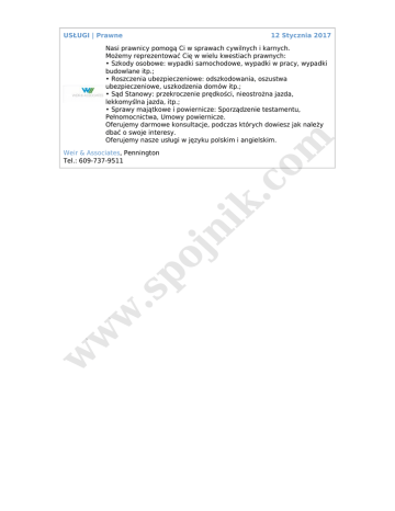 USŁUGI | Prawne 12 Stycznia 2017 m Nasi prawnicy pomogą Ci w sprawach cywilnych i karnych. Możemy reprezentować Cię w wielu kwestiach prawnych: • Szkody osobowe: wypadki samochodowe, wypadki w pracy, wypadki budowlane itp.; • Roszczenia ubezpieczeniowe: odszkodowania, oszustwa ubezpieczeniowe, uszkodzenia domów itp.; • Sąd Stanowy: przekroczenie prędkości, nieostrożna jazda, lekkomyślna jazda, itp.; • Sprawy majątkowe i powiernicze: Sporządzenie testamentu, Pełnomocnictwa, Umowy powiernicze. Oferujemy darmowe konsultacje, podczas których dowiesz jak należy dbać o swoje interesy. Oferujemy nasze usługi w języku polskim i angielskim. w w w .s po jn ik .c o Weir & Associates, Pennington Tel.: 609-737-9511