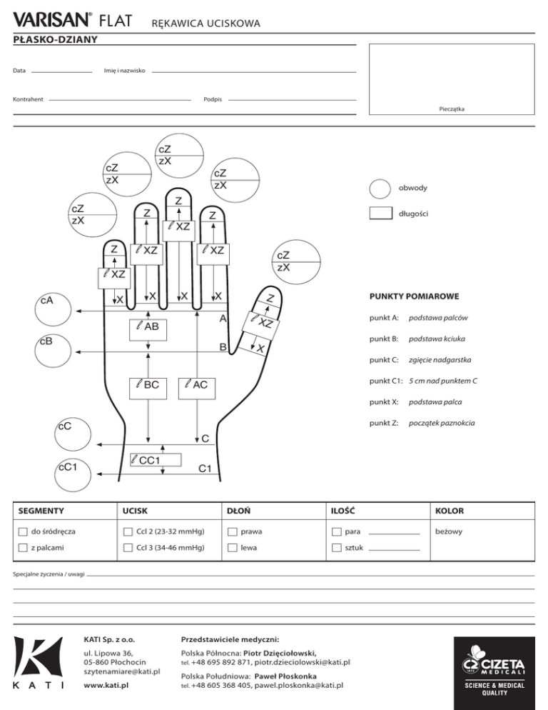FLAT RĘKAWICA UCISKOWA PŁASKO-DZIANY Data Imię i nazwisko Kontrahent Podpis Pieczątka cZ zX cZ zX cZ zX obwody Z cZ zX Z l XZ l XZ Z długości Z l XZ cZ zX l XZ X X cA X X l AB cB l BC PUNKTY POMIAROWE Z A l XZ B X punkt A: podstawa palców punkt B: podstawa kciuka punkt C: zgięcie nadgarstka punkt C1: 5 cm nad punktem C l AC cC punkt X: podstawa palca punkt Z: początek paznokcia C l CC1 cC1 SEGMENTY C1 UCISK DŁOŃ ILOŚĆ do śródręcza Ccl 2 (23-32 mmHg) prawa para z palcami Ccl 3 (34-46 mmHg) lewa sztuk Specjalne życzenia / uwagi KATI Sp. z o.o. Przedstawiciele medyczni: ul. Lipowa 36, 05-860 Płochocin [email protected] Polska Północna: Piotr Dzięciołowski, tel. +48 695 892 871, [email protected] www.kati.pl Polska Południowa: Paweł Płoskonka tel. +48 605 368 405, [email protected] KOLOR beżowy