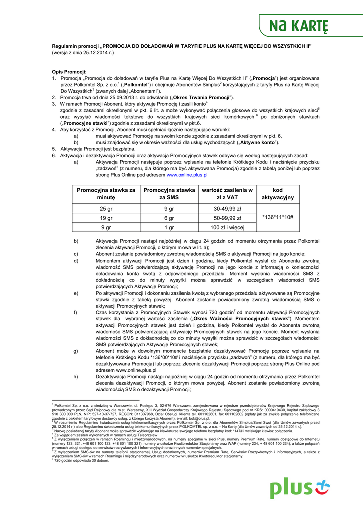 Regulamin promocji „PROMOCJA DO DOŁADOWAŃ W TARYFIE PLUS NA KARTĘ WIĘCEJ DO WSZYSTKICH II” (wersja z dnia 25.12.2014 r.) Opis Promocji: 1. Promocja „Promocja do doładowań w taryfie Plus na Kartę Więcej Do Wszystkich II” („Promocja”) jest organizowana przez Polkomtel Sp. z o.o.1 („Polkomtel”) i obejmuje Abonentów Simplus2 korzystających z taryfy Plus na Kartę Więcej Do Wszystkich3 (zwanych dalej „Abonentami”). 2. Promocja trwa od dnia 25.09.2013 r. do odwołania („Okres Trwania Promocji”). 3. W ramach Promocji Abonent, który aktywuje Promocję i zasili konto4 zgodnie z zasadami określonymi w pkt. 6 lit. a może wykonywać połączenia głosowe do wszystkich krajowych sieci5 oraz wysyłać wiadomości tekstowe do wszystkich krajowych sieci komórkowych 6 po obniżonych stawkach („Promocyjne stawki”) zgodnie z zasadami określonymi w pkt.6. 4. Aby korzystać z Promocji, Abonent musi spełniać łącznie następujące warunki: a) musi aktywować Promocję na swoim koncie zgodnie z zasadami określonymi w pkt. 6, b) musi znajdować się w okresie ważności dla usług wychodzących („Aktywne konto”). 5. Aktywacja Promocji jest bezpłatna. 6. Aktywacja i dezaktywacja Promocji oraz aktywacja Promocyjnych stawek odbywa się według następujących zasad: a) Aktywacja Promocji następuje poprzez wpisanie na telefonie Krótkiego Kodu i naciśnięcie przycisku „zadzwoń” (z numeru, dla którego ma być aktywowana Promocja) zgodnie z tabelą poniżej lub poprzez stronę Plus Online pod adresem www.online.plus.pl Promocyjna stawka za minutę Promocyjna stawka za SMS wartość zasilenia w zł z VAT 25 gr 9 gr 30-49,99 zł 19 gr 6 gr 50-99,99 zł 9 gr 1 gr 100 zł i więcej b) c) d) e) f) g) h) 1 kod aktywacyjny *136*11*10# Aktywacja Promocji nastąpi najpóźniej w ciągu 24 godzin od momentu otrzymania przez Polkomtel zlecenia aktywacji Promocji, o którym mowa w lit. a); Abonent zostanie powiadomiony zwrotną wiadomością SMS o aktywacji Promocji na jego koncie; Momentem aktywacji Promocji jest dzień i godzina, kiedy Polkomtel wysłał do Abonenta zwrotną wiadomość SMS potwierdzającą aktywację Promocji na jego koncie z informacją o konieczności doładowania konta kwotą z odpowiedniego przedziału. Moment wysłania wiadomości SMS z dokładnością co do minuty wysyłki można sprawdzić w szczegółach wiadomości SMS potwierdzających Aktywację Promocji; Po aktywacji Promocji i dokonaniu zasilenia kwotą z wybranego przedziału aktywowane są Promocyjne stawki zgodnie z tabelą powyżej. Abonent zostanie powiadomiony zwrotną wiadomością SMS o aktywacji Promocyjnych stawek; Czas korzystania z Promocyjnych Stawek wynosi 720 godzin7 od momentu aktywacji Promocyjnych stawek dla wybranej wartości zasilenia („Okres Ważności Promocyjnych stawek”). Momentem aktywacji Promocyjnych stawek jest dzień i godzina, kiedy Polkomtel wysłał do Abonenta zwrotną wiadomość SMS potwierdzającą aktywację Promocyjnych stawek na jego koncie. Moment wysłania wiadomości SMS z dokładnością co do minuty wysyłki można sprawdzić w szczegółach wiadomości SMS potwierdzających Aktywację Promocyjnych stawek; Abonent może w dowolnym momencie bezpłatnie dezaktywować Promocję poprzez wpisanie na telefonie Krótkiego Kodu *136*00*10# i naciśnięcie przycisku „zadzwoń” (z numeru, dla którego ma być dezaktywowana Promocja) lub poprzez zlecenie dezaktywacji Promocji poprzez stronę Plus Online pod adresem www.online.plus.pl Dezaktywacja Promocji nastąpi najpóźniej w ciągu 24 godzin od momentu otrzymania przez Polkomtel zlecenia dezaktywacji Promocji, o którym mowa powyżej. Abonent zostanie powiadomiony zwrotną wiadomością SMS o dezaktywacji Promocji; Polkomtel Sp. z o.o. z siedzibą w Warszawie, ul. Postępu 3, 02-676 Warszawa, zarejestrowana w rejestrze przedsiębiorców Krajowego Rejestru Sądowego prowadzonym przez Sąd Rejonowy dla m.st. Warszawy, XIII Wydział Gospodarczy Krajowego Rejestru Sądowego pod nr KRS: 0000419430, kapitał zakładowy 3 510 300 000 PLN, NIP: 527-10-37-727, REGON: 011307968, Dział Obsługi Klienta tel. 601102601, fax 601102602 (opłaty jak za zwykłe połączenie telefoniczne zgodnie z pakietem taryfowym dostawcy usług, z którego korzysta Abonent), e-mail: [email protected]. 2 W rozumieniu Regulaminu świadczenia usług telekomunikacyjnych przez Polkomtel Sp. z o.o. dla Abonentów Simplus/Sami Swoi (dla Umów zawartych przed 25.12.2014 r.) albo Regulaminu świadczenia usług telekomunikacyjnych przez POLKOMTEL sp. z o.o. – Na Kartę (dla Umów zawartych od 25.12.2014 r.). 3 Nazwę posiadanej taryfy Abonent może sprawdzić wybierając na klawiaturze swojego telefonu bezpłatny kod: *147# i wciskając klawisz połączenia. 4 Za wyjątkiem zasileń wykonanych w ramach usługi Teleprzelew 5 Z wyłączeniem połączeń w ramach Roamingu i międzynarodowych, na numery specjalne w sieci Plus, numery Premium Rate, numery dostępowe do Internetu (numery 123, 321, +48 601 100 123, +48 601 100 321), numery w usłudze Kwotoreduktor Stacjonarny oraz WAP (numery 234, + 48 601 100 234), a także połączeń w ramach usługi dostępu do serwisów rozrywkowych i informacyjnych oraz innych numerów specjalnych. 6 Z wyłączeniem SMS-ów na numery telefonii stacjonarnej, Usług dodatkowych, numerów Premium Rate, Serwisów Rozrywkowych i informacyjnych, a także z wyłączeniem SMS-ów w ramach Roamingu i międzynarodowych oraz numerów w usłudze Kwotoreduktor stacjonarny. 7 720 godzin odpowiada 30 dobom. Po dezaktywacji Promocji przez Abonenta opłaty za połączenia będą naliczane zgodnie z Promocyjnymi stawkami do czasu zakończenia ostatnio przyznanego Okresu Ważności Promocyjnych stawek a następnie zgodnie z Cennikiem Taryfy Plus na Kartę Więcej do Wszystkich; j) Aktywne Promocje Abonent może sprawdzić za pomocą Krótkiego Kodu *136# lub poprzez stronę Plus Online pod adresem www.online.plus.pl