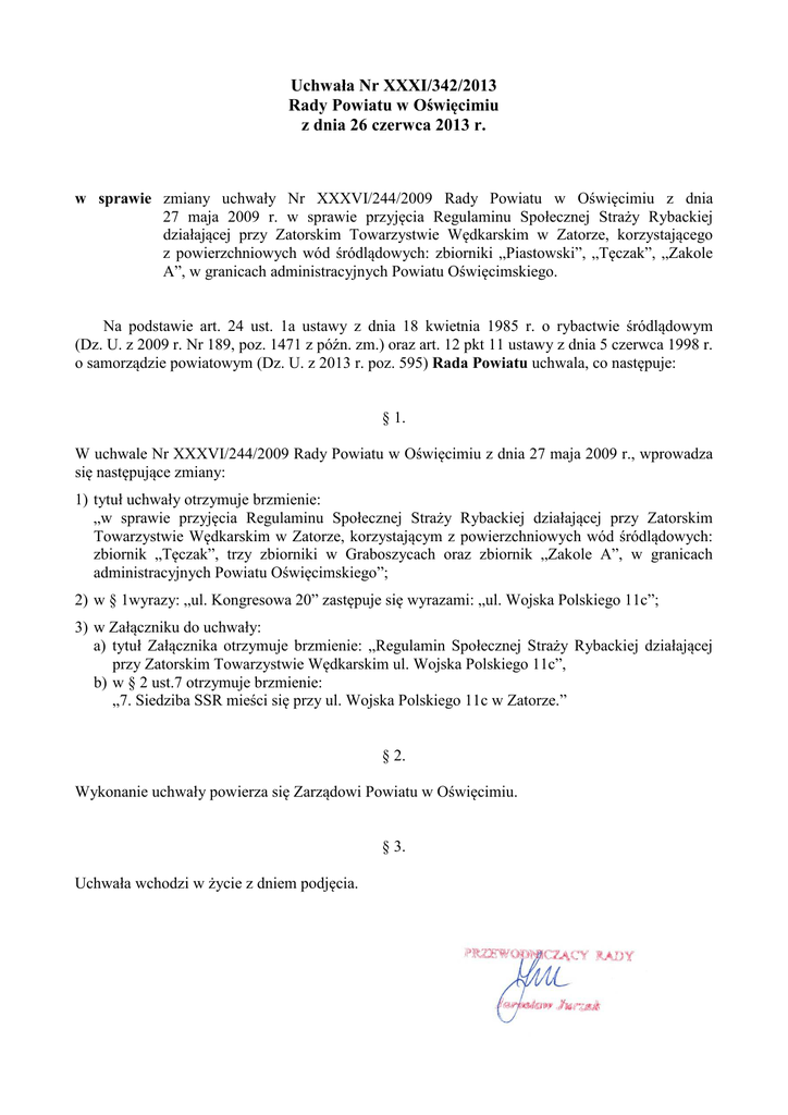 Uchwała Nr XXXI/342/2013 Rady Powiatu w Oświęcimiu z dnia 26 czerwca 2013 r. w sprawie zmiany uchwały Nr XXXVI/244/2009 Rady Powiatu w Oświęcimiu z dnia 27 maja 2009 r. w sprawie przyjęcia Regulaminu Społecznej Straży Rybackiej działającej przy Zatorskim Towarzystwie Wędkarskim w Zatorze, korzystającego z powierzchniowych wód śródlądowych: zbiorniki „Piastowski”, „Tęczak”, „Zakole A”, w granicach administracyjnych Powiatu Oświęcimskiego. Na podstawie art. 24 ust. 1a ustawy z dnia 18 kwietnia 1985 r. o rybactwie śródlądowym (Dz. U. z 2009 r. Nr 189, poz. 1471 z późn. zm.) oraz art. 12 pkt 11 ustawy z dnia 5 czerwca 1998 r. o samorządzie powiatowym (Dz. U. z 2013 r. poz. 595) Rada Powiatu uchwala, co następuje: § 1. W uchwale Nr XXXVI/244/2009 Rady Powiatu w Oświęcimiu z dnia 27 maja 2009 r., wprowadza się następujące zmiany: 1) tytuł uchwały otrzymuje brzmienie: „w sprawie przyjęcia Regulaminu Społecznej Straży Rybackiej działającej przy Zatorskim Towarzystwie Wędkarskim w Zatorze, korzystającym z powierzchniowych wód śródlądowych: zbiornik „Tęczak”, trzy zbiorniki w Graboszycach oraz zbiornik „Zakole A”, w granicach administracyjnych Powiatu Oświęcimskiego”; 2) w § 1wyrazy: „ul. Kongresowa 20” zastępuje się wyrazami: „ul. Wojska Polskiego 11c”; 3) w Załączniku do uchwały: a) tytuł Załącznika otrzymuje brzmienie: „Regulamin Społecznej Straży Rybackiej działającej przy Zatorskim Towarzystwie Wędkarskim ul. Wojska Polskiego 11c”, b) w § 2 ust.7 otrzymuje brzmienie: „7. Siedziba SSR mieści się przy ul. Wojska Polskiego 11c w Zatorze.” § 2. Wykonanie uchwały powierza się Zarządowi Powiatu w Oświęcimiu. § 3. Uchwała wchodzi w życie z dniem podjęcia. Uzasadnienie Do projektu uchwały w sprawie zmiany uchwały Nr XXXVI/244/2009 Rady Powiatu w Oświęcimiu z dnia 27 maja 2009 r. w sprawie przyjęcia Regulaminu Społecznej Straży Rybackiej działającej przy Zatorskim Towarzystwie Wędkarskim w Zatorze, korzystającego z powierzchniowych wód śródlądowych: zbiorniki „Piastowski”, „Tęczak”, „Zakole A”, w granicach administracyjnych Powiatu Oświęcimskiego. Zgodnie z art. 24 ust. 1 i 1a ustawy z dnia 18 kwietnia 1985 r. o rybactwie śródlądowym (Dz. U. z 2009 r. Nr 189, poz. 1471 z późn. zm.) rada powiatu, na wniosek starosty, może utworzyć Społeczną Straż Rybacką albo wyrazić zgodę na utworzenie Społecznej Straży Rybackiej przez zainteresowane organizacje społeczne lub uprawnionych do rybactwa, rada powiatu uchwala także regulamin Społecznej Straży Rybackiej. W myśl art. 12 pkt 11 ustawy z dnia 5 czerwca 1998 r. o samorządzie powiatowym (Dz. U. z 2001 r. Nr 142, poz. 1592 z późn. zm.) do wyłącznej właściwości Rady Powiatu należy podejmowanie uchwał w innych sprawach zastrzeżonych ustawami do kompetencji rady powiatu. Uchwałą Nr XXXVI/244/2009 z dnia 27 maja 2009 r. w sprawie przyjęcia Regulaminu Społecznej Straży Rybackiej działającej przy Zatorskim Towarzystwie Wędkarskim w Zatorze, korzystającego z powierzchniowych wód śródlądowych: zbiorniki „Piastowski”, „Tęczak”, „Zakole A”, w granicach administracyjnych Powiatu Oświęcimskiego, Rada Powiatu w Oświęcimiu wyraziła zgodę na utworzenie Społecznej Straży Rybackiej przez Zatorskie Towarzystwo Wędkarskie w Zatorze, ul. Kongresowa 20, 32-640 Zator, NIP 549-20-04-821, REGON 07076787 oraz przyjęła Regulamin Społecznej Straży Rybackiej działającej przy Zatorskim Towarzystwie Wędkarskim w Zatorze. Zatem zmiany do regulaminu w związku ze zmianą adresu siedziby Zatorskiego Towarzystwa Wędkarskiego oraz zmianą powierzchniowych wód śródlądowych z których korzysta Towarzystwo winny zostać przyjęte uchwałą Rady Powiatu, po uprzednim zaopiniowaniu przez Zarząd Powiatu.