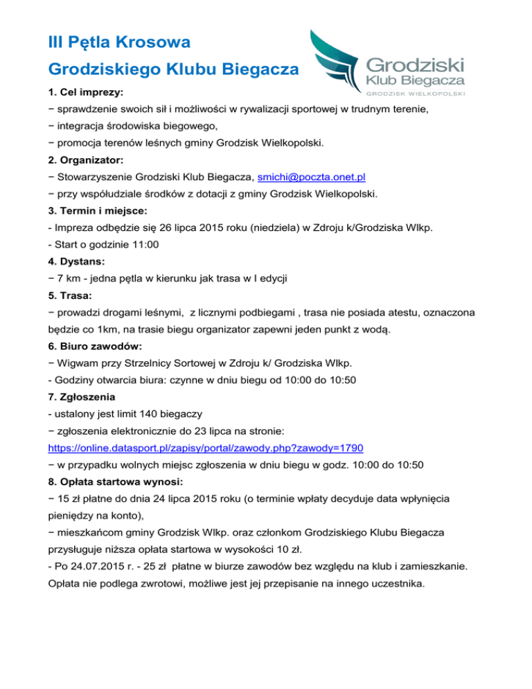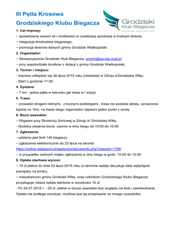 III Pętla Krosowa Grodziskiego Klubu Biegacza 1. Cel imprezy: − sprawdzenie swoich sił i możliwości w rywalizacji sportowej w trudnym terenie, − integracja środowiska biegowego, − promocja terenów leśnych gminy Grodzisk Wielkopolski. 2. Organizator: − Stowarzyszenie Grodziski Klub Biegacza, [email protected] − przy współudziale środków z dotacji z gminy Grodzisk Wielkopolski. 3. Termin i miejsce: - Impreza odbędzie się 26 lipca 2015 roku (niedziela) w Zdroju k/Grodziska Wlkp. - Start o godzinie 11:00 4. Dystans: − 7 km - jedna pętla w kierunku jak trasa w I edycji 5. Trasa: − prowadzi drogami leśnymi, z licznymi podbiegami , trasa nie posiada atestu, oznaczona będzie co 1km, na trasie biegu organizator zapewni jeden punkt z wodą. 6. Biuro zawodów: − Wigwam przy Strzelnicy Sortowej w Zdroju k/ Grodziska Wlkp. - Godziny otwarcia biura: czynne w dniu biegu od 10:00 do 10:50 7. Zgłoszenia - ustalony jest limit 140 biegaczy − zgłoszenia elektronicznie do 23 lipca na stronie: https://online.datasport.pl/zapisy/portal/zawody.php?zawody=1790 − w przypadku wolnych miejsc zgłoszenia w dniu biegu w godz. 10:00 do 10:50 8. Opłata startowa wynosi: − 15 zł płatne do dnia 24 lipca 2015 roku (o terminie wpłaty decyduje data wpłynięcia pieniędzy na konto), − mieszkańcom gminy Grodzisk Wlkp. oraz członkom Grodziskiego Klubu Biegacza przysługuje niższa opłata startowa w wysokości 10 zł. - Po 24.07.2015 r. - 25 zł płatne w biurze zawodów bez względu na klub i zamieszkanie. Opłata nie podlega zwrotowi, możliwe jest jej przepisanie na innego uczestnika. DANE DO PRZELEWU: Stowarzyszenie Grodziski Klub Biegacza ul. Żwirki i Wigury 2a 62-065 Grodzisk Wlkp. 58 2030 0045 1110 0000 0225 4990 tytułem: Pętla Krosowa – Imię i Nazwisko 9. Klasyfikacja i nagrody: − pomiar czasu prowadzony metodom kodów kreskowych (tak jak w poprzednich edycjach) − kategoria generalna kobiet i mężczyzn − puchary i dyplomy dla 3 pierwszych pań i 3 pierwszych panów, − kategoria JUNIOR wyróżnienia dla 3 pierwszych pań i panów w wieku 16-19 lat − odlewany medale dla wszystkich uczestników, − organizator przewiduje możliwość wręczenia nagród rzeczowych i wprowadzenia dodatkowych kategorii. 10. Uczestnictwo: − do startu w biegu dopuszczeni zostaną zawodnicy, którzy ukończyli 18 lat i podpiszą stosowne oświadczenie o starcie na własną odpowiedzialność, osoby w wieku 16-18 lat za pisemną zgodą rodziców lub opiekunów z podpisem i nr PESEL. − Uczestnik startuje wyłącznie na własną odpowiedzialność i ponosi związane z tym ryzyko. Wszyscy uczestnicy przyjmują do wiadomości, że udział w biegu wiąże się z wysiłkiem fizycznym i pociąga za sobą naturalne ryzyko i zagrożenie wypadkami, możliwość odniesienia obrażeń ciała i urazów fizycznych, a także szkód i strat o charakterze majątkowym − każdy zawodnik musi wyrazić zgodę na przetwarzanie danych osobowych dla celów weryfikacji i umieszczenia w komunikacie końcowym. Zgodę potwierdza własnoręcznym podpisem na karcie weryfikacyjnej w biurze zawodów 11. Postanowienia końcowe: − po biegu posiłek makaronowy dla wszystkich − sklasyfikowani zostaną wszyscy uczestnicy, którzy ukończą bieg, − organizator zapewnia depozyt, − organizator zapewnia toalety, lecz nie zapewnia kąpieli po biegu, − uczestnicy biorą udział w biegu na własną odpowiedzialność, − pobranie numeru startowego przez zawodnika jest równoznaczne z zapoznaniem się i akceptacją regulaminu, którego ostateczna interpretacja należy do organizatorów. Szczegóły na stronie: www.gkb.net.pl