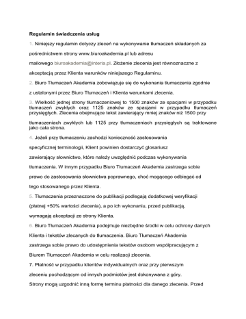 Regulamin świadczenia usług 1. Niniejszy regulamin dotyczy zleceń na wykonywanie tłumaczeń składanych za pośrednictwem strony www.biuroakademia.pl lub adresu mailowego [email protected]. Złożenie zlecenia jest równoznaczne z akceptacją przez Klienta warunków niniejszego Regulaminu. 2. Biuro Tłumaczeń Akademia zobowiązuje się do wykonania tłumaczenia zgodnie z ustalonymi przez Biuro Tłumaczeń i Klienta warunkami zlecenia. 3. Wielkość jednej strony tłumaczeniowej to 1500 znaków ze spacjami w przypadku tłumaczeń zwykłych oraz 1125 znaków ze spacjami w przypadku tłumaczeń przysięgłych. Zlecenia obejmujące tekst zawierający mniej znaków niż 1500 przy tłumaczeniach zwykłych lub 1125 przy tłumaczeniach przysięgłych są traktowane jako cała strona. 4. Jeżeli przy tłumaczeniu zachodzi konieczność zastosowania specyficznej terminologii, Klient powinien dostarczyć glosariusz zawierający słownictwo, które należy uwzględnić podczas wykonywania tłumaczenia. W innym przypadku Biuro Tłumaczeń Akademia zastrzega sobie prawo do zastosowania słownictwa poprawnego, choć mogącego odbiegać od tego stosowanego przez Klienta. 5. Tłumaczenia przeznaczone do publikacji podlegają dodatkowej weryfikacji (płatnej +50% wartości zlecenia), a po ich wykonaniu, przed publikacją, wymagają akceptacji ze strony Klienta. 6. Biuro Tłumaczeń Akademia podejmuje niezbędne środki w celu ochrony danych Klienta i tekstów zlecanych do tłumaczenia. Biuro Tłumaczeń Akademia zastrzega sobie prawo do udostępnienia tekstów osobom współpracującym z Biurem Tłumaczeń Akademia w celu realizacji zlecenia. 7. Płatność w przypadku klientów indywidualnych oraz przy pierwszym zleceniu pochodzącym od innych podmiotów jest dokonywana z góry. Strony mogą uzgodnić inną formę terminu płatności dla danego zlecenia. Przed dokonaniem płatności Klient ma prawo otrzymać próbkę tłumaczenia. 8. Prawa autorskie do tłumaczeń Klient nabywa w chwili opłacenia danego tłumaczenia. Z tą też chwilą nabywa prawo do wykorzystania tłumaczeń na wszystkich polach, z wyjątkiem tłumaczeń przeznaczonych do publikacji, do których to stosuje się punkt 5. 9. Za termin wykonania tłumaczenia uznaje się termin wskazany w zleceniu. 10. W przypadku niedotrzymania przez Biuro Tłumaczeń Akademia terminu wykonania zlecenia, Klientowi przysługuje rabat w wysokości 5% wartości zlecenia za każdy dzień opóźnienia. Kwota rabatu nie może przekroczyć 50% wartości zlecenia. W przypadku opóźnień przekraczających 10 dni, klient ma prawo odstąpić od umowy. 11. Wszelkie zastrzeżenia dotyczące jakości wykonanego tłumaczenia muszą zostać zgłoszone niezwłocznie, nie później jednak niż 7 dni od daty udostępnienia Klientowi przetłumaczonego tekstu. Klient zobowiązany jest do przesłania wypełnionego formularzu reklamacyjnego na adres [email protected]. Niezgłoszenie zastrzeżeń w powyższym terminie oznacza, że Klient przyjmuje wykonane tłumaczenie bez zastrzeżeń i jego prawo do złożenia reklamacji wygasa. Nieopłacenie przez Klienta należności za tłumaczenie w terminie powoduje wygaśnięcie prawa do złożenia reklamacji. 12. W przypadku uzasadnionej reklamacji, Biuro Tłumaczeń Akademia jest zobowiązane do usunięcia wad tłumaczenia w najkrótszym możliwym terminie, nie dłuższym niż 7 dni. Jeżeli Biuro Tłumaczeń Akademia nie zdoła usunąć wad w tym terminie, Klient ma prawo do zwrotu kwoty w wysokości odpowiadającej stosunkowi ilości tekstu przetłumaczonego wadliwie do całości tekstu podlegającego tłumaczeniu. 13. Reklamacji nie podlegają: układ graficzny tłumaczenia, jeśli nie był uzgodniony, stylistyka tłumaczenia, terminologia, jeśli jest poprawna. 14. Biuro Tłumaczeń Akademia nie odpowiada za straty i szkody poniesione przez Klienta w związku z wykonaniem danego zlecenia. Zakres i charakter odpowiedzialności Biura Tłumaczeń Akademia jest ograniczony do przypadków wymienionych w niniejszym Regulaminie. 15. Zlecając tłumaczenie Klient zezwala Biuru Tłumaczeń Akademia na umieszczenie swojego loga lub nazwy na stronie www.biuroakademia.pl wśród klientów, dla których Biuro Tłumaczeń Akademia wykonywało swoje usługi.