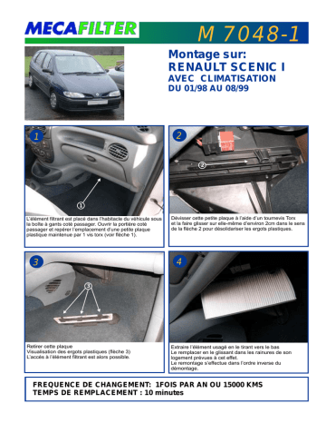 M 7048-1 Montage sur: RENAULT SCENIC I AVEC CLIMATISATION DU 01/98 AU 08/99 2 1 2 1 L’élément filtrant est placé dans l’habitacle du véhicule sous la boîte à gants coté passager. Ouvrir la portière coté passager et repérer l’emplacement d’une petite plaque plastique maintenue par 1 vis torx (voir flèche 1). Dévisser cette petite plaque à l’aide d’un tournevis Torx et la faire glisser sur elle-même d’environ 2cm dans le sens de la flèche 2 pour désolidariser les ergots plastiques. 4 3 3 Retirer cette plaque Visualisation des ergots plastiques (flèche 3) L’accés à l’élément filtrant est alors possible. Extraire l’élément usagé en le tirant vers le bas Le remplacer en le glissant dans les rainures de son logement prévues à cet effet. Le remontage s’effectue dans l’ordre inverse du démontage. FREQUENCE DE CHANGEMENT: 1FOIS PAR AN OU 15000 KMS TEMPS DE REMPLACEMENT : 10 minutes