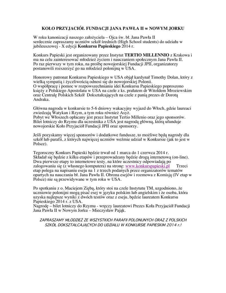 KOŁO PRZYJACIÓŁ FUNDACJI JANA PAWŁA II w NOWYM JORKU W roku kanonizacji naszego założyciela – Ojca św. bł. Jana Pawła II serdecznie zapraszamy uczniów szkół średnich (High School students) do udziału w jubileuszowej - X edycji Konkursu Papieskiego 2014 r. Konkurs Papieski jest organizowany przez Instytut TERTIO MILLENNIO z Krakowa i ma na celu zainteresować młodzież życiem i nauczaniem społecznym Jana Pawła II. Po raz pierwszy w tym roku, na prośbę nowojorskiej Fundacji JPII, organizatorzy postanowili rozszerzyć go na młodzież polonijną w USA. Honorowy patronat Konkursu Papieskiego w USA objął kardynał Timothy Dolan, który z wielką sympatią i życzliwością odnosi się do nowojorskiej Polonii. O współpracę i pomoc w rozpowszechnianiu idei Konkursu Papieskiego poproszono księży z Polskiego Apostolatu w USA na czele z ks. prałatem dr Witoldem Mroziewskim oraz Centralę Polskich Szkół Dokształcających na czele z panią prezes dr Dorotą Andraka. Główna nagroda w konkursie to 5-6 dniowy wakacyjny wyjazd do Włoch, gdzie laureaci zwiedzają Watykan i Rzym, a tym roku również Asyż. Pobyt we Włoszech opłacany jest przez Instytut Tertio Millenio oraz jego sponsorów. Bilet lotniczy do Rzymu dla uczestnika z USA jest nagrodą główną, którą ufunduje nowojorskie Koło Przyjaciół Fundacji JPII oraz sponsorzy. Jeśli pozyskamy więcej sponsorów i dodatkowe fundusze, to możliwe będą nagrody dla szkół lub parafii, z których najwięcej uczniów weźmie udział w Konkursie (jak to jest w Polsce). Tegoroczny Konkurs Papieski będzie trwał od 1 marca do 1 czerwca 2014 r. Składał się będzie z kilku etapów i przeprowadzany będzie drogą internetową (on-line). Dwa pierwsze etapy to internetowe testy, na które uczestnicy odpowiadają po zalogowaniu się (z własnego komputera) na stronę: www.konkurspapieski.pl Trzeci etap polega na napisaniu eseju na 1 z trzech podanych przez organizatorów tematów opartych na nauczaniu bł. Jana Pawła II. Obrona esejów i rozmowa z Komisją (IV etap w Polsce) nie są przewidywane w tym roku w USA. Po spotkaniu z o. Maciejem Ziębą, który stoi na czele Instytutu TM, uzgodniono, że uczniowie polonijni mogą pisać esej w języku polskim lub angielskim i że osoba, która uzyska najlepsze wyniki z dwóch testów oraz z eseju, będzie laureatem Konkursu Papieskiego 2014 r. z USA. Nagrodę – bilet lotniczy do Rzymu - wręczy laureatowi Prezes Koła Przyjaciół Fundacji Jana Pawła II w Nowym Jorku – Mieczysław Pająk. ZAPRASZAMY MŁODZIEŻ ZE WSZYSTKICH PARAFII POLONIJNYCH ORAZ Z POLSKICH SZKÓŁ DOKSZTAŁCAJĄCYCH DO UDZIAŁU W KONKURSIE PAPIESKIM 2014 r.! X KONKURS PAPIESKI - 2014 ORGANIZOWANY PRZEZ INSTYTUT TERTIO MILLENIO W KRAKOWIE Instytut Tertio Millennio – polska organizacja pozarządowa, której celem jest popularyzacja nauczania społecznego Kościoła, w tym szczególnie nauczania Jana Pawła II oraz promocja wartości chrześcijańskich w życiu publicznym. Instytut stara się realizować te cele m.in. poprzez organizację corocznych seminariów dla młodych ludzi; przeprowadzanie i bezpłatne udostępnianie filmowych wywiadów z osobami blisko związanymi z Janem Pawłem II (Medialne Archiwum Jana Pawła II) oraz organizację Konkursu Papieskiego dla uczniów szkół ponadgmimnazjalnych. Regulamin ze strony internetowej Konkursu Papieskiego oraz wypowiedź jednego z organizarorów na YouTube o 9-tej edycji Konkursu: http://www.konkurspapieski.pl/index.php?option=com_conten t&view=article&id=2&Itemid=115 http://youtu.be/l1oga_r72w w HARMONOGRAM KONKURSU PAPIESKIEGO W 2014 R. - I Etap (prosty test online – 30 pytań) - od 1 do 30 marca 2014 (każdy uczestnik loguje się na stronę www.konkurspapieski.pl w dowolnym dniu i rozwiązuje zadania) - II Etap (trudniejszy test) – 8 kwietnia w USA, (wszyscy uczestnicy logują się w tym samym momencie, o tej samej godzinie i rozwiązują bardziej wymagający test 60 pytań – 60 min. na rozwiązanie) - III Etap (eseje) - od 9 do 30 kwietnia, (uczestnicy piszą pracę na jeden z 3 podanych tematów opartych na tekstach JPII, mają też podaną bibliografię). Następnie organizatorzy mają miesiąc na przeczytanie esejów (w każdym regionie do powyższego etapu przechodzi tylko 20 osób) - FINAŁ (obrona esejów) – TEN ETAP W TYM ROKU DOTYCZY TYLKO POLSKI – 1 czerwca (Dzień Dziecka). W każdym regionie, przed komisją staje od 7 do 10 osób, które napisały najlepsze eseje i przeprowadzana jest obrona (pytania komisji dotyczą eseju i ogólnej wiedzy o JPII). Sprawdzana jest wiedza oraz jakość wypowiedzi. Wygrywa jedna osoba. Po finale, w tym samym dniu odbywa się gala z wręczniem nagród. Główna nagroda dla 9 finalistow z Polski oraz JEDNEGO finalisty z USA - to wyjazd do Włoch w sierpniu 2014r. – zwiedzanie Watykanu i Rzymu. W Konkursie Papieskim w USA będą wprowadzone pewne zmiany uzgodnione przez nowojorską Fundację Jana Pawła II (głownego koordynatora i sponsora nagrody – biletu lotniczego do Rzymu) z o. Maciejem Ziębą założycielem Instytutu Tertio Millenio w Krakowie. Etap II – test online w ograniczonym czasie 60 min. (wszyscy uczestnicy jednego dnia) odbędzie się 8 kwietnia. Uczniowie polonijni będą mogli pisać eseje w j. angielskim lub w j. polskim. Nie będzie (w tym roku) tzw. “Obrony esejów” przed komisją. Uczestnicy Konkursu Papieskiego z USA będą traktowani jako odrębny Region i jedna osoba, która zdobędzie największą ilość punktów za testy oraz esej – otrzyma nagrodę główną – bilet lotniczy do Rzymu. Honorowy patronat Konkursu Papieskigo w roku kanonizacji Jana Pawła II objęli: Anna Komorowska – żona Prezydenta Rzeczpospolitej Polskiej oraz kardynał Timothy Michael Dolan z Nowego Jorku. A oto logo i temat główny tegorocznego X KONKURSU PAPIESKIEGO: