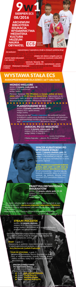 9w1 SIERPIEŃ ECS 08/2016 ARCHIWUM BIBLIOTEKA EDUKACJA WYDAWNICTWA MEDIATEKA KULTURA MUZEUM NAUKA OBYWATEL Wspominamy najważniejszy i największy strajk w dziejach polskiej drogi do wolności. W Sierpniu ’80 stanęło wiele zakładów pracy w całej Polsce, a w Stoczni Gdańskiej im. Lenina do negocjacji z protestującymi zasiedli przedstawiciele rządu. Pierwszy raz władza tak dalece ustąpiła pod naporem żądań obywateli. Zapraszamy na spacery po wystawie stałej ECS i po stoczni – tę fascynującą historię opowiedzą uczestnicy wydarzeń i historycy. Obywatelskie obchody Sierpnia ’80 będziemy świętować w gdańskich dzielnicach – festynami, piknikami, warsztatami, potańcówkami... Melomani i kinomani – mamy też atrakcje dla Was. Dzieciaki i rodziny – u nas nie ma nudy. Zapraszamy do ECS! Fot. Grzegorz Mehring / Archiwum ECS WYSTAWA STAŁA ECS AUDIOPRZEWODNIK DLA DZIECI | od 7 roku życia MONDO MIGLIORE termin | 3 sierpnia, środa, godz. 18 miejsce | ECS, audytorium wstęp | wolny Pierwsze Światowe Dni Młodzieży w Europie wolnej od komunizmu odbyły się 25 lat temu na Jasnej Górze. Zapraszamy na dokumentalny zapis spotkania miliona młodych z Janem Pawłem II . Reżyseria Dariusz Jabłoński i Władysław Wasilewski. PLANSZOGRANIE W ECS termin | 4 sierpnia, czwartek, godz. 17–20 miejsce | ECS, ogród zimowy wstęp | wolny Dołączcie do nas! Turniej z nagrodami dla wielbicieli farmerki w trudnych czasach suszy, konkurencji i korupcji, czyli eliminacje do ogólnopolskiego turnieju gry planszowej Santiago. A oprócz tego – dziesiątki planszówek dla małych i dużych. JAROCIN, PO CO WOLNOŚĆ termin | 6 sierpnia, sobota, godz. 18 miejsce | ECS, pl. Solidarności 1 wstęp | bilety → kasy ECS Przedpremierowy pokaz filmu Leszka Gnoińskiego i Marka Gajczaka – „Jarocin. Po co wolność” oraz dyskusja z jego twórcami i legendarnymi muzykami Jarocina. SPACER KURATORSKI PO WYSTAWIE STAŁEJ termin | 7 sierpnia, niedziela, godz. 12 zbiórka | ECS, hol główny (vis-à-vis kas) wstęp | → REZERWACJA MIEJSC + bilet: 15 zł/os. (grupowy normalny) lub 11 zł/os. (grupowy ulgowy) Czym stoczniowcy wypełniali strajkowe godziny, gdzie spali i co jedli, skąd się wzięli w stoczni dziennikarze i księża? W roli przewodnika – Karolina Lejczak, historyk i muzealnik, która na co dzień opiekuje się kolekcją zbiorów artystycznych ECS i pamiątkami historycznymi. Fot. Grzegorz Mehring / Archiwum ECS PRAKTYKA OBYWATELSKA IMIGRANTÓW termin | 13 sierpnia, sobota, godz. 11–16 miejsce | ECS, sala warsztatowa nr 5 (III piętro) wstęp | wolny Co zrobić, żebyśmy lepiej się poznali, zgodnie żyli i korzystali ze swoich doświadczeń? – zapraszamy imigrantki i imigrantów z Trójmiasta. Wspólnie chcemy opracowywać plan nowych inicjatyw społecznych i kulturalnych. organizatorzy | ECS i Centrum Wsparcia Imigrantów i Imigrantek Fot. Dawid Linkowski / Archiwum ECS STRAJK! POCZĄTEK termin | 14 sierpnia, niedziela miejsce | ECS, Stocznia Gdańska wstęp | wolny + REZERWACJA → ecs.gda.pl/sierpien program | ecs.gda.pl/sierpien Opowiemy Wam fascynującą historię najważniejszego strajku w historii polskiej drogi do wolności, czyli Sierpnia ’80 w Stoczni Gdańskiej im. Lenina. START → godz. 6 Zapraszamy w godzinie rozpoczęcia strajku na spacer z współorganizatorami protestu, w roli przewodników: Jerzy Borowczak i Ludwik Prądzyński. TOUR DE STOCZNIA → godz. 9 Niespieszne zwiedzanie Stoczni Gdańskiej na rowerach, w roli przewodnika: Andrzej Trzeciak, współtwórca wystawy stałej ECS, specjalista od kwestii stoczniowych. SPACERY SUBIEKTYWNE PO WYSTAWIE STAŁEJ W roli przewodników uczestnicy protestów Sierpnia ’80: 11.00 / prof. Jadwiga Staniszkis 12.00 / Maciej Pietrzyk 13.00 / Wojciech Charkin 14.00 / Zdzisław Andrzej Fic Fot. Edward Roedin / Archiwum ECS termin | 14–31 sierpnia miejsce | dzielnice Gdańska: Aniołki, Biskupia Górka, Nowy Port, Orunia, Piecki-Migowo, Sąsiedzi Stoczni, Siedlce, Stogi + ECS wstęp | wolny Już po raz 8 kolektywy aktywistów organizują w gdańskich dzielnicach społeczne obchody Sierpnia ’80. Zaplanowano m.in.: festyny, warsztaty dla dzieci, potańcówki, zmagania sportowe i spacery kajakowe, zbieranie opowieści, podwieczorki sąsiedzkie… organizatorzy | ECS, społeczni partnerzy program wydarzeń w dzielnicach | ecs.gda.pl/zrozumiecsierpien XXII ENERGA MARATON SOLIDARNOŚCI termin | 15 sierpnia, poniedziałek, godz. 9 zgłoszenia | do 8 sierpnia → maratongdansk.home.pl opłata startowa | 89 zł/os. Pierwszy bieg upamiętniający solidarnościowy Sierpień odbył się w 1981 roku. Trasa nie była wtedy pełnym maratonem. Idea wspólnego biegu odrodziła się wraz z polską demokracją w 1989 roku, ale dopiero od 1995 roku dystans zwiększono do pełnego maratonu – 42 km i 195 m. Start zaplanowano w Gdyni, a metę w Gdańsku. SOLIDARITY OF ARTS JIMEK + | koncert 13 sierpnia, sobota, godz. 20.30 / plenerowa scena na Ołowiance w Gdańsku wstęp wolny, a do strefy Golden Circle bilety: eventim.pl KILAR + | koncert 14 sierpnia, niedziela, godz. 20.30 / plenerowa scena na Ołowiance w Gdańsku wstęp wolny, a do strefy Golden Circle bilety: eventim.pl PODWÓJNE ŻYCIE KIEŚLOWSKIEGO | filmy + dyskusje 13 i 17–18 sierpnia / ECS, audytorium Świętujemy 75 rocznicę urodzin jednego z najznamienitszych polskich reżyserów i scenarzystów. O twórczości reżysera będą mówić m.in.: Krzysztof Zanussi, Jerzy Stuhr i Mirosław Baka. wstęp wolny | ecs.gda.pl/sierpien SOLIDARNOŚĆ KULTUR – KULTURA SOLIDARNOŚCI koncert 21 sierpnia, niedziela, godz. 19.00 / Polska Filharmonia Bałtycka bilety: filharmonia.gda.pl KRONOS QUARTET | koncert 27 sierpnia, sobota, godz. 20.00 / ECS, audytorium Zdobywcy Grammy Award i Polar Music Prize – od klasyki po jazz. bilety: kasy ECS i online: bilety.ecs.gda.pl oraz eventim.pl/kronos TRANSPARENT | pokaz przedpremierowy termin | 28 sierpnia, niedziela, godz. 16 miej