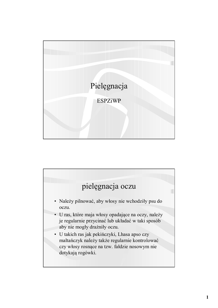 Pielęgnacja ESPZiWP pielęgnacja oczu • Należy pilnować, aby włosy nie wchodziły psu do oczu. • U ras, które maja włosy opadające na oczy, należy je regularnie przycinać lub układać w taki sposób aby nie mogły drażniły oczu. • U takich ras jak pekińczyki, Lhasa apso czy maltańczyk należy także regularnie kontrolować czy włosy rosnące na tzw. fałdzie nosowym nie dotykają rogówki. 1 pielęgnacja oczu cd. • U niektórych psów, mających przytkane kanaliki łzowe, od wewnętrznych kącików oczu aż do spodu kufy biegnie ciemny ślad po wymytych z oka zabrudzeniach. Zwłaszcza jest to widoczne u ras białych (np.biszony). • Pomaga przemywanie specjalnymi płynami – jest ich duży wybór na rynku pielęgnacja oczu • Do przemywania samych oczu można kupić również gotowe płyny lub używać roztworu kwasu bornego 1-3% lub soli fizjologicznej (sterylny roztwór NaCl do nabycia w aptece). • Można też stosować napary z ziół. 2 chaber bławatek (Centaurea cyanus ) • oczy można przemywać słabym naparem z kwiatów chabra bławatka (1 łyżka na 200 ml wrzątku) • działanie przeciwzapalne (np. w zapaleniu spojówek) • można też stosować napary z: • ziela świetlika • kwiatu rumianku owoc kminku zwyczajnego (Carum carvi L.) do przemywania oczu : wywar: 1 łyżka gniecionych lub zmielonych nasion albo ziela zalać 250 ml wody; zagotować; odstawić pod przykryciem na 20 minut; przefiltrować przez watę na sitku. wywar fizjologiczny: 1 łyżkę kminku zalać 250 ml soli fizjologicznej (dostępna w butlach w aptekach); zagotować; odstawić na 20 minut; przefiltrować przez watę na sparzonym sitku. • wskazania: stany zapalne i zakażenia spojówek, powiek o gałki ocznej, opuchniecie powiek, zmęczenie oczu, świąd oczu, alergiczne objawy oczne 3 czyszczenie uszu • Kanał słuchowy u psa jest zagięty na kształt litery L – co utrudnia oczyszczenie. • można owinąć wokół palca odrobinę waty i czyścić ucho jak najgłębiej wsuwając palec do środka i obracając nim • można użyć kleszczyków owiniętych watą lub patyczka z wacikiem, ale należy go trzymać tuż przy czubku jak długopis (palce są wówczas ogranicznikiem, by nie wsadzić patyczka zbyt głęboko) • stosujemy gotowe płyny do czyszczenia uszu zgodnie z instrukcją producenta czyszczenie uszu jeśli nie mamy gotowego płynu do uszu, możemy sporządzić sami: 40% octu winnego białego jabłkowego 60% naparu z ziół (np. z ziela tymianku, kwiatu nagietka, ziela szanty, liści oczaru...) zamiast naparu można użyć wody przegotowanej dodając kroplę olejku eterycznego tymiankowego lub kminkowego, szałwiowego lub eukaliptusowego (olejki musza być naturalne) ucho czyścimy wacikiem zamoczonym w płynie (nie wlewamy płynu do ucha) 4 pielęgnacja jamy ustnej • kamień nazębny należy usuwać – mechanicznie, używając specjalnych płynów lub skalerem ultradźwiekowym. pielęgnacja jamy ustnej • do czyszczenia zębów można stosować gotowe preparaty dla psów lub można zastosować wodę utlenioną lub sodę (można zmieszać oba składniki). • Dziąsła można smarować olejkiem eterycznym szałwiowym lub opryskiwać Dentoseptem. 5 przybory do pielęgnacji sierści grzebienie • O średnim rozstawie ząbków nadaje się dla ras o średnim i długim włosie, ułatwia rozczesywanie psa, utrzymanie czystej sierści, wyczesywanie np. rzepów, kawałków gałązek, itp.. • Grzebień o gęstych ząbkach, nadaje się do poszczególnych partii ciała np. rozczesywania grzywki. Należy go stosować po uprzednim rozczesaniu sierści szczotką lub grzebieniem o szerszym rozstawie ząbków. grzebienie cd. • - z obrotowymi zębami dzięki obrotowym zębom doskonale rozczesuje sierść zapobiegając jej uszkodzeniu. • o dwóch długościach zębów • o różnych odstępach między zębami 6 szczotki • z włosia naturalnego, o różnej długości włosia i gęstości • metalowa, jej zakończone okrągłe końcówki nie podrażniają skóry. szczotki cd. • Inny rodzaj szczotki wykonanej z delikatnych metalowych drucików odpowiednio zakrzywionych , nadająca się dla ras długowłosych; pomaga wyciągnąć martwe włosy z podszerstka. 7 filcaki • Idealnie nadają się do walki z kołtunami oraz ze sfilcowaną sierścią u psa, na rynku możemy spotkać kilka rodzajów tego typu przyrządów. Filcak boczny ostry o długich ząbkach nadaje się do rozcinania już powstałych kołtunów w sierści. Podobnie filcak z zagiętymi zębami. filcaki cd. • Inny rodzaj filcaka o krótkich ząbkach nadaje się do rozczesywania i usuwania sfilcowanej sierści: 8 furminator • To narzędzie zwane furminatorem będzie nieodzownym elementem przy wyciąganiu podszerstka. Są różne modele (różna długość ząbków i ich rozstaw), umożliwiające dopasowanie wielkości do psa oraz do sierści. furminatory (coatminatory) 1,2/ do usuwania podszerstka (zwykły i z obrotowym grzebieniem) u psów o włosie średnim i półdługim 3/ dla psów o włosie długim 9 gumowe rękawice • Dla psów o bardzo krótkim włosie przydatnym elementem wyposażenia będzie gumowa rękawica. Bardzo dobrze wyczesuje martwy włos oraz zapewnia psu przyjemny masaż. Odpowiednia dla ras bokser, dalamtynczyk itp trymery (noże trymerskie) • Przy rasach o szorstkim włosie np. sznaucer wymagającym trymowania, to narzędzie będzie bardzo przydatne. Pozwala precyzyjnie usuwać martwy włos z poszczególnych partii ciała u psa. Na rynku dostępnych wiele modeli, należy zwrócić uwagę na jakość wykonania produktu oraz na jakoś metalu z jakiego jest robiony trymer. 10 trymery • Noże trymerskie mają różne kształty i rozstawy zębów, ich przeznaczenie też może być dwojakie – innych nożyków używamy do usuwania podszerstka, a innych do włosa okrywowego (choć istnieją też wersje uniwersalne do obydwu rodzajów włosa). Wszystkie z nich nie powinny być