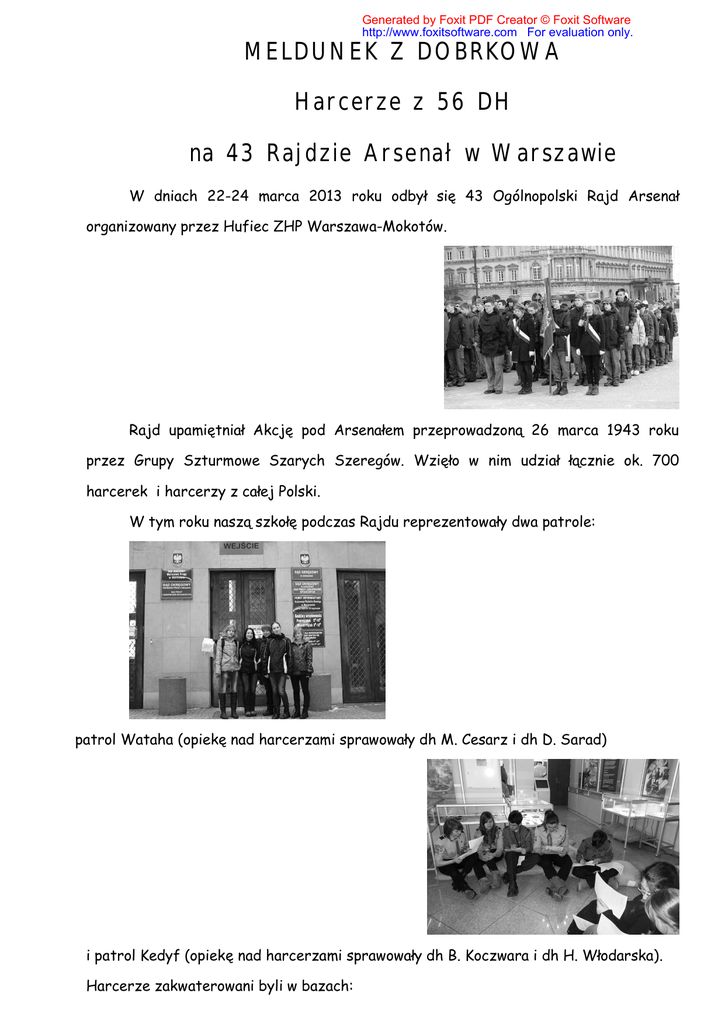 Generated by Foxit PDF Creator © Foxit Software http://www.foxitsoftware.com For evaluation only. MELDUNEK Z DOBRKOWA Harcerze z 56 DH na 43 Rajdzie Arsenał w Warszawie W dniach 22-24 marca 2013 roku odbył się 43 Ogólnopolski Rajd Arsenał organizowany przez Hufiec ZHP Warszawa-Mokotów. Rajd upamiętniał Akcję pod Arsenałem przeprowadzoną 26 marca 1943 roku przez Grupy Szturmowe Szarych Szeregów. Wzięło w nim udział łącznie ok. 700 harcerek i harcerzy z całej Polski. W tym roku naszą szkołę podczas Rajdu reprezentowały dwa patrole: patrol Wataha (opiekę nad harcerzami sprawowały dh M. Cesarz i dh D. Sarad) i patrol Kedyf (opiekę nad harcerzami sprawowały dh B. Koczwara i dh H. Włodarska). Harcerze zakwaterowani byli w bazach: Generated by Foxit PDF Creator © Foxit Software http://www.foxitsoftware.com For evaluation only. 1. Wataha na BAZIE B4 - “HARC VEGAS” Casino, disco, Elvis Presley, świetna zabawa, nowi ludzie, nowe znajomości i wiele, wiele innych 2. Kedyf na BAZIE B6 - “POD ŻAGLAMI ZAWISZY” biesiada żeglarska przy szantach z marynarskimi konkursami, grami i zabawami. Zajęcia rozpoczęły się już w piątek – Grą Nocną pod Arsenałem. Zadanie polegało na odnalezieniu obiektów zaznaczonych na mapie i uzupełnieniu karty pracy. W sobotę z samego rana patrole wyruszyły na Grę Główną przygotowaną przez sztab rajdu. Odwiedziły takie miejsca jak: Centrum Nauki Kopernika, Krakowskie Przedmieście, Muzeum ZHP, Sąd Okręgowy – gdzie brały udział w rozprawie sądowej, wystawę „Kamyk na szańcu” Brały także udział w rywalizacji na temat: „O co chodzi w kibicowaniu?” Na koniec dnia patrole zatańczyły wspólnie zespołu „Substytut”. przed Pałacem Kultury oraz uczestniczyły w koncercie Generated by Foxit PDF Creator © Foxit Software http://www.foxitsoftware.com For evaluation only. W czasie trwania Gry Głównej harcerze rozwiązywali zadania otrzymywali punkty. Po powrocie z gry uczestniczyli za które w zajęciach integracyjnych przygotowanych na bazach. W niedzielę odbyły się uroczystości przygotowane przez Sztab Rajdu. Msza w Katedrze Polowej Wojska Polskiego, za wszystkich poległych w Akcji pod Arsenałem, a następnie defilada na Placu Piłsudskiego z władzami ZHP oraz apel kończący rajd pod budynkiem Arsenału. Nasi harcerze z 56 DH bogatsi o nowe doświadczenia, oraz nowe przyjaźnie wrócili do Dobrkowa późnym wieczorem w niedziele. Już czekamy na kolejny rajd w Warszawie. Generated by Foxit PDF Creator © Foxit Software http://www.foxitsoftware.com For evaluation only.