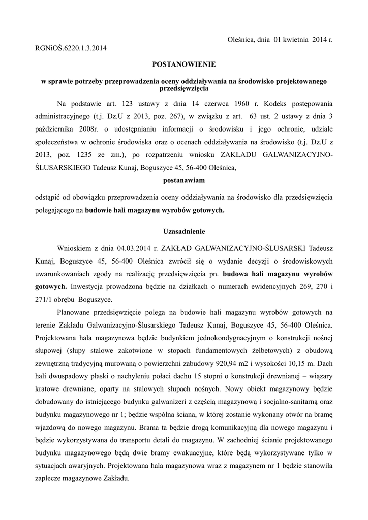 Oleśnica, dnia 01 kwietnia 2014 r. RGNiOŚ.6220.1.3.2014 POSTANOWIENIE w sprawie potrzeby przeprowadzenia oceny oddziaływania na środowisko projektowanego przedsięwzięcia Na podstawie art. 123 ustawy z dnia 14 czerwca 1960 r. Kodeks postępowania administracyjnego (t.j. Dz.U z 2013, poz. 267), w związku z art. 63 ust. 2 ustawy z dnia 3 października 2008r. o udostępnianiu informacji o środowisku i jego ochronie, udziale społeczeństwa w ochronie środowiska oraz o ocenach oddziaływania na środowisko (t.j. Dz.U z 2013, poz. 1235 ze zm.), po rozpatrzeniu wniosku ZAKŁADU GALWANIZACYJNOŚLUSARSKIEGO Tadeusz Kunaj, Boguszyce 45, 56-400 Oleśnica, postanawiam odstąpić od obowiązku przeprowadzenia oceny oddziaływania na środowisko dla przedsięwzięcia polegającego na budowie hali magazynu wyrobów gotowych. Uzasadnienie Wnioskiem z dnia 04.03.2014 r. ZAKŁAD GALWANIZACYJNO-ŚLUSARSKI Tadeusz Kunaj, Boguszyce 45, 56-400 Oleśnica zwrócił się o wydanie decyzji o środowiskowych uwarunkowaniach zgody na realizację przedsięwzięcia pn. budowa hali magazynu wyrobów gotowych. Inwestycja prowadzona będzie na działkach o numerach ewidencyjnych 269, 270 i 271/1 obrębu Boguszyce. Planowane przedsięwzięcie polega na budowie hali magazynu wyrobów gotowych na terenie Zakładu Galwanizacyjno-Ślusarskiego Tadeusz Kunaj, Boguszyce 45, 56-400 Oleśnica. Projektowana hala magazynowa będzie budynkiem jednokondygnacyjnym o konstrukcji nośnej słupowej (słupy stalowe zakotwione w stopach fundamentowych żelbetowych) z obudową zewnętrzną tradycyjną murowaną o powierzchni zabudowy 920,94 m2 i wysokości 10,15 m. Dach hali dwuspadowy płaski o nachyleniu połaci dachu 15 stopni o konstrukcji drewnianej – wiązary kratowe drewniane, oparty na stalowych słupach nośnych. Nowy obiekt magazynowy będzie dobudowany do istniejącego budynku galwanizeri z częścią magazynową i socjalno-sanitarną oraz budynku magazynowego nr 1; będzie wspólna ściana, w której zostanie wykonany otwór na bramę wjazdową do nowego magazynu. Brama ta będzie drogą komunikacyjną dla nowego magazynu i będzie wykorzystywana do transportu detali do magazynu. W zachodniej ścianie projektowanego budynku magazynowego będą dwie bramy ewakuacyjne, które będą wykorzystywane tylko w sytuacjach awaryjnych. Projektowana hala magazynowa wraz z magazynem nr 1 będzie stanowiła zaplecze magazynowe Zakładu. Teren zajmowany przez zakład obejmuje 3 sąsiadujące ze sobą działki o numerach ewidencyjnych 269, 270 i 271/1. Łączna powierzchnia terenu zajmowanego przez zakład wynosi 15 248 m2 z czego powierzchnia zabudowana (łącznie z projektowanym magazynem o powierzchni zabudowy 921 m2) wynosi 4583 m2 co stanowi 30,1% całej powierzchni terenu zajmowanego prze Zakład. Budowa magazynu będzie prowadzona metodą tradycyjną polegającą na wykonaniu żelbetowych ław i stóp fundamentowych, zakotwieniu nośnych słupów stalowych, wymurowaniu ścian zewnętrznych, ułożeniu wiązarów kratowych (drewnianych) na słupach nośnych i wykonaniu połaci dachowej. Ściany zewnętrzne zostaną otynkowane, a strop dachu ocieplony i zabezpieczony przed opadami atmosferycznymi. W przygotowanych otworach zostanie zamontowana tzw. stolarka drzwiowa i okienna (bramy stalowe rolowane z płyt warstwowych, okna stalowe z szybami termoizolacyjnymi). Następnie zostaną przeprowadzone prace instalacyjne związane z montażem instalacji elektrycznej: oświetleniowej, siłowej i oświetlenia ewakuacyjnego. Budynek magazynu zostanie wyposażony w instalację odgromową. Magazyn będzie posiadał grawitacyjną wentylację nawiewną i wywiewną. W magazynie zostanie wykonana posadzka przemysłowa. Magazyn zostanie wyposażony w urządzenia przeciwpożarowe odpowiednie do przeznaczenia i wyposażenia obiektu. Pomieszczenie magazynu zostanie wyposażone w regały do składowania wyrobów przeznaczonych do pokrywania powłokami ochronnymi. W magazynie nie będą wykonywane prace technologiczne związane z powlekaniem wyrobów powłokami ochronnymi (cynkowanie i anodowanie elektrochemiczne). W ścianach projektowanej hali planuje się umieszczenie 2 szt. drzwi przemysłowych od strony zachodniej oraz drzwi do magazynu nr 1 (od strony wschodniej) do komunikacji ze strefą magazynową i produkcyjną – przywóz detali do magazynu i z magazynu do załadunku na transport zewnętrzny (samochodowy). Transport wewnątrz w zakładzie będzie prowadzony z wykorzystaniem wózków widłowych. Nowy magazyn wyrobów gotowych nie będzie miał wpływu na wielkość produkcji i nie wpłynie na ilość emitowanych substancji z procesów produkcyjnych. Zanieczyszczenia uwalniane do powietrza w związku z eksploatacją nowej hali magazynowej będą na tym samym poziomie co aktualnie, ponieważ nie przewiduje się zwiększenia produkcji w stosunku do wielkości nominalnych określonych w pozwoleniu zintegrowanym, a tym samym nie zwiększy się ilości detali magazynowych na terenie zakładu. Dlatego eksploatacja nowej hali magazynowej wyrobów gotowych nie będzie powodowała powstawania większej ilości zanieczyszczeń związanych z eksploatacją wózków widłowych. Analiza pracy wózków widłowych w zakresie emisji hałasu oraz zanieczyszczeń do powietrza, przeprowadzona na etapie opracowania wniosku o wydanie pozwolenia zintegrowanego, przy produkcji na poziomie wielkości nominalnych określonych w pozwoleniu zintegrowanym, wykazała, że poziom emitowanego hałasu nie przekracza wartości dopuszczalnych na granicy posesji zarówno w porze dziennej jak i nocnej oraz że emisja substancji do powietrza ze spalania paliwa w wózkach widłowych nie powoduje przekroczeń wartości odniesienia. Projektowany magazyn wyrobów gotowych będzie wykorzystywany jako budynek magazynowy. W związku z tym będą powstawały odpady związane z eksploatacją wózków widłowych i prowadzeniem prac porządkowych w magazynie. Ten rodzaj odpadów powsta