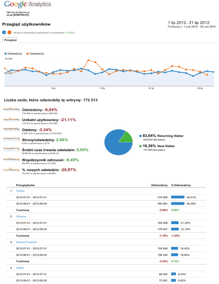 http://ox.pl-http://ox.pl ox.pl [DOMYŚLNY] 1 lip 2012 - 31 lip 2012 Przegląd użytkowników Porównaj z: 1 cze 2012 - 30 cze 2012 zmiana odwiedziny wyrażona w procentach: +0,00% Przegląd Odwiedziny Odwiedziny 50 000 25 000 8 lip 15 lip 22 lip 29 lip Liczba osób, które odwiedziły tę witrynę: 172 513 Odwiedziny: -6,04% 776 908 w porów naniu z 826 852 Unikalni użytkownicy: -21,11% 172 513 w porów naniu z 218 680 Odsłony: -3,34% 4 907 212 w porów naniu z 5 076 603 Strony/odwiedziny: 2,88% 6,32 w porów naniu z 6,14 Średni czas trwania odwiedzin: 5,55% 83,64% Returning Visitor 649 839 Odw iedziny 16,36% New Visitor 127 069 Odw iedziny 00:06:40 w porów naniu z 00:06:19 Współczynnik odrzuceń: -9,49% 28,39% w porów naniu z 31,36% % nowych odwiedzin: -20,97% 16,32% w porów naniu z 20,66% Przeglądarka 1. 2012-07-01 - 2012-07-31 376 880 48,51% 2012-06-01 - 2012-06-30 400 861 48,48% 0,06% 2012-07-01 - 2012-07-31 165 838 21,35% 2012-06-01 - 2012-06-30 179 827 21,75% -7,78% -1,85% Internet Explorer 2012-07-01 - 2012-07-31 150 846 19,42% 2012-06-01 - 2012-06-30 156 240 18,90% % zmiany 4. -5,98% Chrome % zmiany 3. % Odwiedziny Firefox % zmiany 2. Odwiedziny -3,45% 2,75% Opera 2012-07-01 - 2012-07-31 66 262 8,53% 2012-06-01 - 2012-06-30 72 951 8,82% % zmiany 5. -9,17% Safari 2012-07-01 - 2012-07-31 6 977 0,90% 2012-06-01 - 2012-06-30 7 384 0,89% % zmiany 6. -5,51% 8. 2012-07-01 - 2012-07-31 5 351 0,69% 2012-06-01 - 2012-06-30 4 699 0,57% 13,88% 2012-07-01 - 2012-07-31 3 241 0,42% 2012-06-01 - 2012-06-30 3 212 0,39% % zmiany 0,90% 7,39% Mozilla Compatible Agent 2012-07-01 - 2012-07-31 865 0,11% 2012-06-01 - 2012-06-30 961 0,12% -9,99% -4,20% SeaMonkey 2012-07-01 - 2012-07-31 313 0,04% 2012-06-01 - 2012-06-30 269 0,03% % zmiany 10. 21,20% Opera Mini % zmiany 9. 0,56% Android Browser % zmiany 7. -3,33% 16,36% 23,84% IE with Chrome Frame 2012-07-01 - 2012-07-31 135 0,02% 2012-06-01 - 2012-06-30 163 0,02% % zmiany -17,18% -11,85% wyświetl pełny raport © 2012 Google http://ox.pl-http://ox.pl ox.pl [DOMYŚLNY] 1 lip 2012 - 31 lip 2012 Przegląd źródeł odwiedzin Porównaj z: 1 cze 2012 - 30 cze 2012 zmiana odwiedziny wyrażona w procentach: +0,00% Przegląd Odwiedziny Odwiedziny 50 000 25 000 8 lip 15 lip 22 lip 29 lip Osoby, które odwiedziły tę witrynę: 776 908 41,22% Odwiedziny w sieci wyszukiwania 320 233 Odw iedziny 35,78% Ruch z witryn odsyłających 277 986 Odw iedziny 22,99% Odwiedziny bezpośrednie 178 643 Odw iedziny 0,01% Kampanie 46 Odw iedziny Źródło 1. 2012-07-01 - 2012-07-31 101 051 36,35% 2012-06-01 - 2012-06-30 103 043 35,67% 68 061 24,48% 2012-06-01 - 2012-06-30 78 558 27,19% -13,36% -9,96% ogloszenia.ox.pl 2012-07-01 - 2012-07-31 25 461 9,16% 2012-06-01 - 2012-06-30 24 643 8,53% 3,32% 7,38% pl.indeed.com 2012-07-01 - 2012-07-31 14 924 5,37% 2012-06-01 - 2012-06-30 13 580 4,70% % zmiany 5. 1,92% 2012-07-01 - 2012-07-31 % zmiany 4. -1,93% facebook.com % zmiany 3. % Odwiedziny ox.pl % zmiany 2. Odwiedziny 9,90% 14,21% wiadomosci.ox.pl 2012-07-01 - 2012-07-31 14 135 5,08% 2012-06-01 - 2012-06-30 13 169 4,56% % zmiany 6. 7,34% praca.trovit.pl 2012-07-01 - 2012-07-31 6 545 2,35% 2012-06-01 - 2012-06-30 7 723 2,67% % zmiany 7. -15,25% 2012-07-01 - 2012-07-31 5 524 1,99% 2012-06-01 - 2012-06-30 4 284 1,48% 28,94% 10. 34,01% google.pl 2012-07-01 - 2012-07-31 3 749 1,35% 2012-06-01 - 2012-06-30 3 335 1,15% % zmiany 9. -11,92% forum.ox.pl % zmiany 8. 11,55% 12,41% 16,83% m.ox.pl 2012-07-01 - 2012-07-31 3 275 1,18% 2012-06-01 - 2012-06-30 3 023 1,05% % zmiany 8,34% 12,59% poczta.onet.pl 2012-07-01 - 2012-07-31 2 859 1,03% 2012-06-01 - 2012-06-30 2 905 1,01% % zmiany -1,58% 2,28% wyświetl pełny raport © 2012 Google