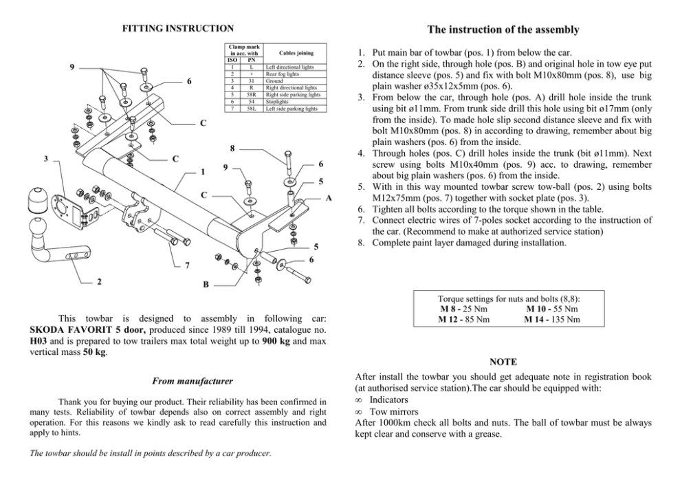 FITTING INSTRUCTION Clamp mark in acc. with ISO PN 1 L 2 + 3 31 4 R 5 58R 6 54 7 58L 9 6 The instruction of the assembly Cables joining Left directional lights Rear fog lights Ground Right directional lights Right side parking lights Stoplights Left side parking lights C 8 C 3 1 6 9 5 C A 5 6 7 2 1. Put main bar of towbar (pos. 1) from below the car. 2. On the right side, through hole (pos. B) and original hole in tow eye put distance sleeve (pos. 5) and fix with bolt M10x80mm (pos. 8), use big plain washer ø35x12x5mm (pos. 6). 3. From below the car, through hole (pos. A) drill hole inside the trunk using bit ø11mm. From trunk side drill this hole using bit ø17mm (only from the inside). To made hole slip second distance sleeve and fix with bolt M10x80mm (pos. 8) in according to drawing, remember about big plain washers (pos. 6) from the inside. 4. Through holes (pos. C) drill holes inside the trunk (bit ø11mm). Next screw using bolts M10x40mm (pos. 9) acc. to drawing, remember about big plain washers (pos. 6) from the inside. 5. With in this way mounted towbar screw tow-ball (pos. 2) using bolts M12x75mm (pos. 7) together with socket plate (pos. 3). 6. Tighten all bolts according to the torque shown in the table. 7. Connect electric wires of 7-poles socket according to the instruction of the car. (Recommend to make at authorized service station) 8. Complete paint layer damaged during installation. B This towbar is designed to assembly in following car: SKODA FAVORIT 5 door, produced since 1989 till 1994, catalogue no. H03 and is prepared to tow trailers max total weight up to 900 kg and max vertical mass 50 kg. Torque settings for nuts and bolts (8,8): M 8 - 25 Nm M 10 - 55 Nm M 12 - 85 Nm M 14 - 135 Nm NOTE From manufacturer Thank you for buying our product. Their reliability has been confirmed in many tests. Reliability of towbar depends also on correct assembly and right operation. For this reasons we kindly ask to read carefully this instruction and apply to hints. The towbar should be install in points described by a car producer. After install the towbar you should get adequate note in registration book (at authorised service station).The car should be equipped with: • Indicators • Tow mirrors After 1000km check all bolts and nuts. The ball of towbar must be always kept clear and conserve with a grease. PPUH AUTO-HAK S.J. Towbar accessories: Produkcja Haków Holowniczych Henryk & Zbigniew Nejman 76-200 SŁUPSK ul. Słoneczna 16K tel/fax (059) 8-414-414; 8-414-413 e-mail: [email protected] www. autohak.com.pl Towing hitch (without electrical set) Class: A50-X Cat. no. H03 Technical data: D-value: 5,9 kN maximum trailer weight: 900 kg maximum vertical cup mass: 50 kg Designed for: Manufacturer: SKODA Model: FAVORIT Type: 5 doors produced since 1989 till 1994 Approval number acc. to regulations EKG/ONZ 55.01: E20-55R-01 0936 Foreword This towbar is designed according to rules of safety traffic regulations. The towing hitch is a safety component and can be install only by qualified personnel. Any alteration or conversion of the towing hitch is prohibited and would lead to cancellation of design certification. Remove insulating compound and underseal from vehicle (if present) in the area of the matting surfaces of the towing hitch. The vehicle manufacturer’s specifications regarding trailer load and max. vertical cup load are decisive for driving, and values for the towing hitch cannot be exceeded. D-value formula: Max trailer weight [kg] x Max trailer weight [kg] + Max vehicle weight [kg] Max vehicle weight [kg] X 9,81 = 1000 D [kN] INSTRUKCJA montaŜu i eksploatacji zaczepu kulowego Oznaczenie zacisku wg ISO PN 1 L 2 + 3 31 4 R 5 58R 6 54 7 58L 9 6 Kolejność czynności przy montaŜu Łączenie przewodów Kierunkowskazy lewe Tylne światła przeciwmgłowe Masa Kierunkowskazy prawe Światła pozycyjne prawe Światła hamowania Światła pozycyjne lewe C 8 C 3 1 6 9 5 C A 5 6 7 2 1. PrzyłoŜyć główną belkę zaczepu (poz. 1) od spodu bagaŜnika. 2. Z prawej strony, przez otwór (poz. B) oraz istniejący otwór w oryginalnym uchu holowniczym wsunąć tulejkę dystansową (poz. 5) i skręcić śrubą M10x80mm (poz. 8) wykorzystując duŜe podkładki płaskie ø35x12x5mm (poz. 6). 3. Od spodu samochodu, poprzez otwór zaczepu (poz. A), przewiercić wiertłem ø11mm otwory od wewnątrz bagaŜnika. Od strony bagaŜnika rozwiercić otwór wiertłem ø17mm tylko na ściance bagaŜnika. W wykonany otwór wsunąć tulejkę dystansową i skręcić śrubą M10x80mm (poz. 8) zgodnie z rysunkiem, pamiętając o duŜych podkładkach (poz. 6) od strony bagaŜnika. 4. Poprzez otwory zaczepu (poz. C) przewiercić wiertłem ø11mm otwory do wnętrza bagaŜnika, następnie skręcić śrubami M10x40mm (poz. 9) zgodnie z rysunkiem, pamiętając o duŜych podkładkach (poz. 6) przyłoŜonych od strony bagaŜnika. 5. Do tak zamontowanego zaczepu śrubami M12x75mm (poz. 7) przykręcić część kulistą zaczepu (poz. 2) wraz z płytką pod gniazdo (poz. 3). 6. Dokręcić wszystkie śruby z momentem, jak pokazano w tabeli. 7. Podłączyć przewody z gniazdka 7 - bieg. do instalacji elektrycznej zgodnie z instrukcją fabryczną samochodu (zaleca się wykonanie w ASO). 8. Uzupełnić ewentualne ubytki powłoki malarskiej zaczepu powstałe w trakcie montaŜu. B Zaczep kulowy przeznaczony jest do zamontowania w samochodzie: SKODA FAVORIT 5 drz., produkowanym od 1989r. do 1994r., nr katalogowy H03 i słuŜy do ciągnięcia przyczep o masie całkowitej do 900 kg i nacisku na kulę max 50 kg. OD PRODUCENTA Dziękujemy za wybór produkowanego przez naszą firmę zaczepu kulowego. Jego niezawodność została potwierdzona licznymi testami oraz opiniami zadowolonych klientów. JednakŜe niezawodność zaczepów kulowych jest zaleŜna równieŜ od prawidłowego montaŜu oraz prawidłowej eksploatacji. Z tego powodu prosimy Państwa o staranne przeczytanie niniejszej instrukcji montaŜu oraz przestrzeganie z