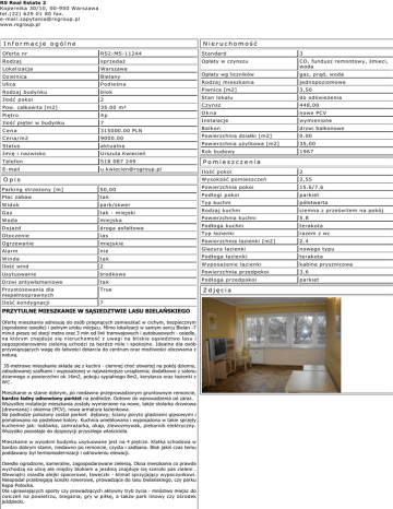 RS Real Estate 2 Kopernika 30/10, 00-950 Warszawa tel.(22) 629 01 80 fax. e-mail:[email protected] www.rsgroup.pl Informacje ogólne Nieruchomość Oferta nr RS2-MS-11244 Standard 3 Rodzaj sprzedaż Opłaty w czynszu Lokalizacja Warszawa CO, fundusz remontowy, śmieci, woda Dzielnica Bielany Opłaty wg liczników gaz, prąd, woda Podleśna Rodzaj mieszkania jednopoziomowe Rodzaj budynku blok Piwnica [m2] 3,50 Ilość pokoi 2 Stan lokalu do odświeżenia 35.00 m² Czynsz 448,00 4p Okna nowe PCV 7 Instalacje wymienione 315000.00 PLN Balkon drzwi balkonowe Cena/m2 9000.00 Powierzchnia działki [m2] 0.00 Status aktualna Powierzchnia użytkowa [m2] 35,00 Imię i nazwisko Urszula Kwiecień Rok budowy 1967 Telefon 518 087 249 Pomieszczenia E-mail [email protected] Ulica Pow. całkowita [m2] Piętro Ilość pięter w budynku Cena Ilość pokoi 2 Wysokość pomieszczeń 2,55 50,00 Powierzchnia pokoi 15.6/7.6 tak Podłogi pokoi parkiet park/skwer Typ kuchni półotwarta tak - miejski Rodzaj kuchni ciemna z prześwitem na pokój Woda miejska Powierzchnia kuchni 5.8 Dojazd droga asfaltowa Podłoga kuchni terakota las Typ łazienki razem z wc miejskie Powierzchnia łazienki [m2] 2.4 nie Glazura łazienki nowego typu Winda tak Podłoga łazienki terakota Ilość wind 2 Wyposażenie łazienki kabina prysznicowa środkowe Powierzchnia przedpokoi 3.6 Drzwi antywłamaniowe tak Podłoga przedpokoi parkiet Przystosowania dla niepełnosprawnych True Zdjęcia Ilość kondygnacji 7 Opis Parking strzeżony [m] Plac zabaw Widok Gaz Otoczenie Ogrzewanie Alarm Usytuowanie PRZYTULNE MIESZKANIE W SĄSIEDZTWIE LASU BIELAŃSKIEGO Ofertę mieszkania adresuję do osób pragnących zamieszkać w cichym, bezpiecznym (ogrodzone osiedle) i pełnym uroku miejscu. Mimo lokalizacji w samym sercu Bielan -7 minut pieszo od stacji metra oraz 3 min od linii tramwajowych i autobusowych - osiedle, na którym znajduje się nieruchomość z uwagi na bliskie sąsiedztwo lasu i zagospodarowanie zielenią uchodzi za bardzo miłe i spokojne. Idealne dla osób przywiązujących wagę do łatwości dotarcia do centrum oraz możliwości obcowania z naturą. 35-metrowe mieszkanie składa się z kuchni - ciemnej choć otwartej na pokój dzienny, zabudowanej szafkami i wyposażonej w najważniejsze urządzenia; dodatkowo z salonu dziennego o powierzchni ok 16m2, pokoju sypialnego 8m2, korytarza oraz łazienki z WC. Mieszkanie w stanie dobrym, po niedawno przeprowadzonym gruntownym remoncie, bardzo ładny odnowiony parkiet na podłodze. Gotowe do wprowadzenia od zaraz. Wszystkie instalacje mieszkania zostały wymienione na nowe, także stolarka drzwiowa (drewniana) i okienna (PCV), nowa armatura łazienkowa. Na podłodze położony został parkiet dębowy; ściany poryto gładziami gipsowymi i pomalowano na pastelowe kolory. Kuchnia umeblowana i wyposażona w takie sprzęty kuchenne jak: lodówka, zamrażarka, okap, zlewozmywak, piekarnik elektryczny. Wszystko pozostaje do dyspozycji przyszłego właściciela. Mieszkanie w wysokim budynku usytuowane jest na 4 piętrze. Klatka schodowa w bardzo dobrym stanie, niedawno po remoncie, czysta i zadbana. Blok jakiś czas temu poddawany był termomodernizacji i odnowieniu elewacji. Osiedle ogrodzone, kameralne, zagospodarowane zielenią. Okna mieszkania co prawda wychodzą na ulicę ale między blokiem a jezdnią znajduje się szeroki pas zieleni . Wewnątrz osiedla alejki spacerowe, ławeczki - klimat sprzyjający wypoczynkowi. Nieopodal przebiegają ścieżki rowerowe, prowadzące do lasu bielańskiego, czy parku Kępa Potocka. Dla uprawiających sporty czy prowadzących aktywny tryb życia - mnóstwo miejsc do ćwiczeń na powietrzu, biegania, gry w piłkę, a także park linowy czy ośrodek jeździecki. W bliskiej odległości znajdują się wszelkie punkty usługowe, sklepy, szkoła czy żłobek. Dotarcie do centrum miasta możliwe w ciągu 15- 20 minut. Zdecydowanie polecam! Urszula Kwiecień tel. 518 087 249 [email protected] © Wszelkie prawa zastrzeżone - RS Real Estate