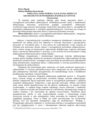 Petro Husak Helena Bielkina-Kowalczuk INKLUZJA JAKO FORMA NAUCZANIA DZIECI O SZCZEGÓLNYCH POTRZEBACH EDUKACYJNYCH Streszczenie W artykule autor analizuje inkluzję jako formę nauczania dzieci z szczególnymi potrzebami edukacyjnymi. Ocharakteryzowano zalety i mankamenty inkluzyjnego nauczania, przytoczono poglądy uczestników edukacyjnowychowawczego procesu dotyczącego możliwości nauczania dzieci z szczególnymi potrzebami edukacyjnymi w szkołach ogólnokształcących. Zwrócona jest uwaga na przewagi inkluzyjnego nauczania dzieci z typowym poziomem rozwoju. Słowa kluczowe: dzieci z szczególnymi potrzebami edukacyjnymi, integracja, inkluzja, edukacja inkluzyjna, szkoła inkluzyjna. Jednym z najważniejszych czynników postępowej działalności człowieka jest możliwość żyć pełnią życia bez zaburzeń w rozwoju fizycznym i psychicznym, korzystać ze wszystkich praw, w tym prawa do wykształcenia. Coraz częściej na Ukrainie jest stosowany termin «dzieci z szczególnymi potrzebami edukacyjnymi», który zwraca uwagę na konieczność zapewnienia dodatkowego wsparcia nauczania dzieci z pewnymi zaburzeniami w rozwoju, co nie zezwala im na korzystanie z usług edukacyjnych nadawanych przez szkoły lokalne. Dlatego reorganizacja i modernizacja krajowego systemu edukacyjnego, uznanie prawa każdego dziecka do uzyskania wykształcenia, odpowiedniego do jego możliwości poznawczych i wymagań czasu prowadzą do poszukiwania optymalnych dróg reformowania, socjalizacji dzieci z zaburzeniami w rozwoju psychofizycznym, ich integracji do społeczeństwa. Integracja jest postrzegana jako ostateczny cel nauki, ponieważ maturzysta z zaburzeniami w rozwoju psychofizycznym musi integrować się do społeczeństwa jako pełnoprawny obywatel, przygotowany do samodzielnego życia i działalności produkcyjnej, interakcji z innymi ludźmi. Znaczenie procesów integracji edukacyjnej podkreślał jeszcze L. Wygotski, który zwracał uwagę na konieczność tworzenia takiego systemu edukacyjnego, któryby organicznie łączył nauczanie dzieci p szczególnych potrzebach z ogólnym systemem edukacyjnym. Naukowiec z tego powodu zauważał: «Mimo wszystkich zalet, nasza szkoła specjalizowana ma ten główny mankament, że zamyka swego wychowanka…w wąskim kręgu zespołu szkolnego, tworzy oderwany i zamkniety świat, w którym wszystko jest dostosowane do wad dziecka, akcentuje jego uwagę na wadzie cielesnej i nie wprowadza do ogólnej rzeczywistości. Natomiast nasza specjalizowana szkoła w celu wyprowadzenia ucznia z izolowanego świata zazwyczaj rozwija w nim umiejętności, które prowadzą do większej izolacji i pogłębiają segregację. Przez te błędy nie tylko powstrzymuje się wychowanie dziecka, lecz też specjalne umiejętności stają się nieskuteczne»1. Według L. Wygotskiego, głównym zadaniem w wychowaniu dziecka o szczególnym potrzebach jest ich zaangażowanie w życie i rekompensata zaburzeń poprzez aktywizację 1 А. Колупаєва, Інклюзивна освіта реалії та перспективи, Київ 2009, С. 257. działalności zachowanych analizatorów, ponieważ «niedorozwój dziecka» jest związany nie tylko z czynnikami biologicznymi, lecz też ze skutkami społecznymi2. Ostatnio pojęcie «integracja» jest zastępowane przez pojęcie «inkluzja», ale te dwa terminy różnią się między sobą w zakresie koncepcji. Zwłaszcza, w dokumencie «Międzynarodowe konsultacje dotyczące nauczania dzieci o szczególnych potrzebach edukacyjnych» powiedziano, że «...integrację określa się jako wysiłki, skierowane na wprowadzenie dzieci do regularnej przestrzeni edukacyjnej. Czyli programy integracyjne są skierowane na to, żeby zaangazować dzieci o różnych (szczególnych) umiejętnościach do istniejącego systemu szkolnictwa. One są powołane do tego, aby «przywrócić dziecku normalność», żeby pomóc mu dostosować się do istniejącego modelu szkolnictwa. Inkluzja jest to polityka i proces, który zezwala na udział wszystkich dzieci w tych programach». Czyli wszystkie dzieci należą do systemu edukacji powszechnej, zaczynając od edukacji podstawowej. Tak więc w ogóle nie powinno się mówić o dostosowaniu dziecka do środowiska szkolnego, ponieważ ono jest nierozerwalną częścią tego systemu. Inkluzja ma na celu, aby każda szkoła była przygotowana do nauczania dzieci z różnymi (szczególnymi) potrzebami. Rozwiązanie tego problemu wymaga zmian nie tylko w strukturze i środkach stosowanych w naszych szkołach, lecz też w ustosunkowaniu wielu pedagogów szkół specjalizowanych i powszechnych, którzy uważają, że ich rola polega na nauczaniu pewnego «rodzaju» dzieci3. Angielski wyraz inclusion jest tłumaczony jako utrzymywanie, włączenie, posiadanie. Dlatego to jest termin odzwierciedlający nowe spojrzenie nie tylko na edukację, lecz ogólnie na miejsce człowieka w społeczeństwie. W. Bondar zauważa, że u podstaw inkluzji leży opinia, że życie i byt ludzi o ograniczonych możliwościach powinny w największym stopniu zbliżyć się do warunków i stylu życia społecznego, w którym oni przebywają. Jeśli mówić o dzieciach z ograniczonymi możliwościami psychofizycznymi, to one muszą zaspokajać swoje potrzeby poprzez związki socjalne4. Edukacja inkluzyjna jest to nauczanie i wychowanie dzieci z szczególnymi potrzebami edukacyjnymi wspólnie z ich zdrowymi rówieśnikami w celu ich integracji i adaptacji do społeczeństwa, co polega na zasadzie zapewnienia podstawowego prawa dzieci do wykształcenia i prawa uzyskiwać je w miejscu zamieszkania, co zakłada nauczanie dzieci o szczególnych potrzebach edukacyjnych w szkole ogólnokształcącej5. Problem nauczania inkluzyjnego na Ukrainie badali tacy wiodący naukowcy, jak W. Bondar, G. Dobrowolska, W. Zasenko, O. Zotowa, A. Kapska, A. Kołupajewa, J. Najda, M. Pierfiliewa, W. Postowy, G. Sawicka, K. Semenowa, W. Syniow, N. Sofij i in.
