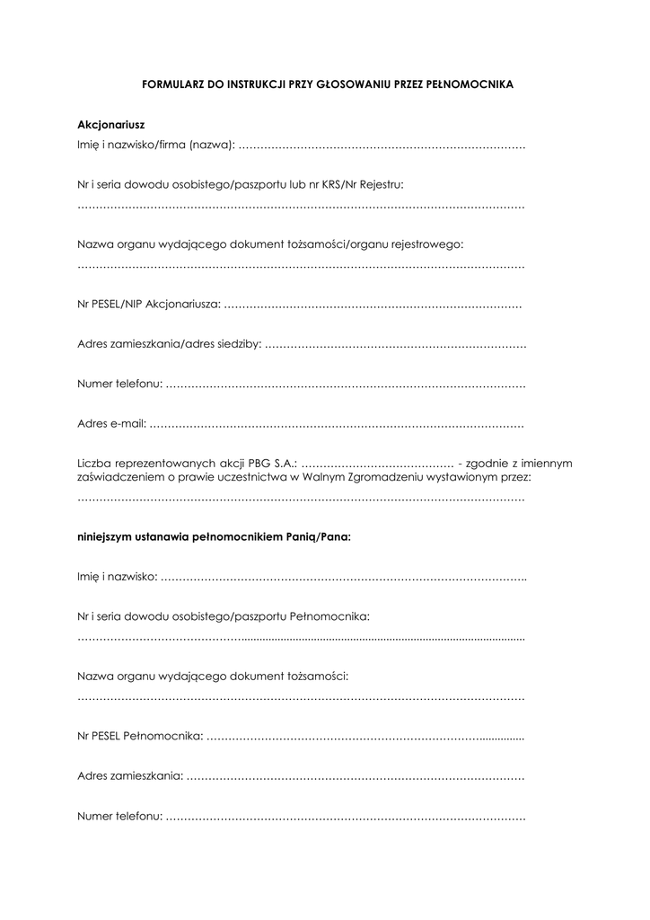 FORMULARZ DO INSTRUKCJI PRZY GŁOSOWANIU PRZEZ PEŁNOMOCNIKA Akcjonariusz Imię i nazwisko/firma (nazwa): ……………………………………………………………………. Nr i seria dowodu osobistego/paszportu lub nr KRS/Nr Rejestru: …………………………………………………………………………………………………………… Nazwa organu wydającego dokument tożsamości/organu rejestrowego: …………………………………………………………………………………………………………… Nr PESEL/NIP Akcjonariusza: ………………………………………………………………………. Adres zamieszkania/adres siedziby: ……………………………………………………………… Numer telefonu: ……………………………………………………………………………………… Adres e-mail: …………………………………………………………………………………………. Liczba reprezentowanych akcji PBG S.A.: …………………………………… - zgodnie z imiennym zaświadczeniem o prawie uczestnictwa w Walnym Zgromadzeniu wystawionym przez: …………………………………………………………………………………………………………… niniejszym ustanawia pełnomocnikiem Panią/Pana: Imię i nazwisko: ……………………………………………………………………………………….. Nr i seria dowodu osobistego/paszportu Pełnomocnika: ……………………………………….............................................................................................. Nazwa organu wydającego dokument tożsamości: …………………………………………………………………………………………………………… Nr PESEL Pełnomocnika: …………………………………………………………………............... Adres zamieszkania: ………………………………………………………………………………… Numer telefonu: ……………………………………………………………………………………… Adres e-mail: …………………………………………………………………………………………. do reprezentowania Akcjonariusza na Nadzwyczajnym Walnym Zgromadzeniu Spółki PBG S.A. zwołanym na dzień 3 kwietnia 2012 roku. Pełnomocnictwo niniejsze upoważnia do uczestniczenia w Nadzwyczajnym Walnym Zgromadzeniu (w tym zabierania głosu) oraz do wykonywania prawa głosu z ……………………. (wpisać liczbę akcji) PBG S.A. zgodnie z instrukcjami Akcjonariusza wskazanymi poniżej. Czy Pełnomocnik ma prawo udzielania dalszych pełnomocnictw? TAK …. NIE …. miejscowość, data ……………………………………………………………………………………………. Podpis Akcjonariusza/ osoby bądź osób reprezentujących Akcjonariusza …………………………………………………………………………………………….. …………………………………………………………………………………………….. Albo niniejszym ustanawia pełnomocnikiem: Firma Pełnomocnika: ……………………………………………………………………………… Nr KRS (Nr Rejestru): ……………………………………….............................................................................................. Nazwa organu rejestrowego: …………………………………………………………………………………………………………… NIP: …………………………………………………………………................................................... Adres siedziby: ……………………………………………………………………………………….. Numer telefonu: ……………………………………………………………………………………… Adres e-mail: …………………………………………………………………………………………. do reprezentowania Akcjonariusza na Nadzwyczajnym Walnym Zgromadzeniu Spółki PBG S.A. zwołanym na dzień 3 kwietnia 2012 roku. Pełnomocnictwo niniejsze upoważnia do uczestniczenia w Nadzwyczajnym Walnym Zgromadzeniu (w tym zabierania głosu) oraz do wykonywania prawa głosu z ……………………. (wpisać liczbę akcji) PBG S.A. zgodnie z instrukcjami Akcjonariusza wskazanymi poniżej. Czy Pełnomocnik ma prawo udzielania dalszych pełnomocnictw? TAK …. NIE …. miejscowość, data ……………………………………………………………………………………………. Podpis Akcjonariusza/ osoby bądź osób reprezentujących Akcjonariusza …………………………………………………………………………………………….. WYBÓR PRZEWODNICZĄCEGO NADZWYCZAJNEGO WALNEGO ZGROMADZENIA (punkt 2 porządku obrad) za przeciw wstrzymuję się Według uznania pełnomocnika zgłoszenie sprzeciwu Liczba akcji: Liczba akcji: Liczba akcji: Liczba akcji: _________ _________ _________ _________ Inne* (w przypadku zgłoszenia innych projektów uchwał niż w brzmieniu proponowanym przez Zarząd): WYBÓR KOMISJI SKRUTACYJNEJ (punkt 5 porządku obrad) za przeciw wstrzymuję się Według uznania pełnomocnika zgłoszenie sprzeciwu Liczba akcji: Liczba akcji: Liczba akcji: Liczba akcji: _________ _________ _________ _________ Inne* (w przypadku zgłoszenia innych projektów uchwał niż w brzmieniu proponowanym przez Zarząd): PODJĘCIE UCHWAŁY W SPRAWIE USTALENIA LICZBY CZŁONKÓW RADY NADZORCZEJ (punkt 6 porządku obrad) za przeciw wstrzymuję się Według uznania pełnomocnika zgłoszenie sprzeciwu Liczba akcji: Liczba akcji: Liczba akcji: Liczba akcji: _________ _________ _________ _________ Inne* (w przypadku zgłoszenia innych projektów uchwał niż w brzm