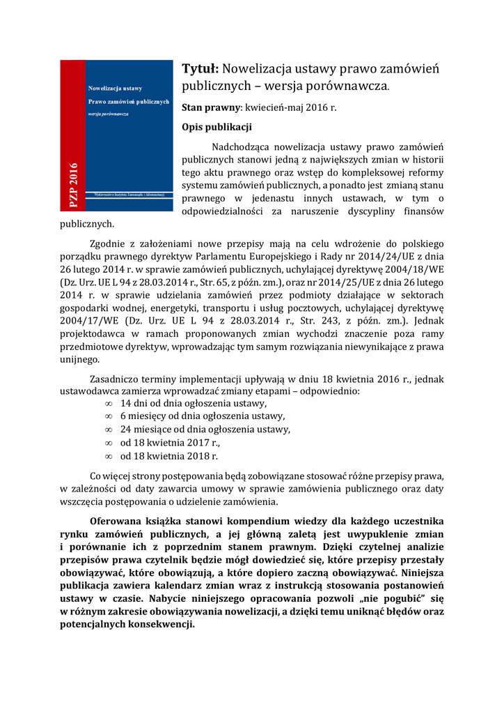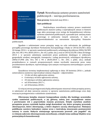 Tytuł: Nowelizacja ustawy prawo zamówień publicznych – wersja porównawcza. Stan prawny: kwiecień-maj 2016 r. Opis publikacji Nadchodząca nowelizacja ustawy prawo zamówień publicznych stanowi jedną z największych zmian w historii tego aktu prawnego oraz wstęp do kompleksowej reformy systemu zamówień publicznych, a ponadto jest zmianą stanu prawnego w jedenastu innych ustawach, w tym o odpowiedzialności za naruszenie dyscypliny finansów publicznych. Zgodnie z założeniami nowe przepisy mają na celu wdrożenie do polskiego porządku prawnego dyrektyw Parlamentu Europejskiego i Rady nr 2014/24/UE z dnia 26 lutego 2014 r. w sprawie zamówień publicznych, uchylającej dyrektywę 2004/18/WE (Dz. Urz. UE L 94 z 28.03.2014 r., Str. 65, z późn. zm.), oraz nr 2014/25/UE z dnia 26 lutego 2014 r. w sprawie udzielania zamówień przez podmioty działające w sektorach gospodarki wodnej, energetyki, transportu i usług pocztowych, uchylającej dyrektywę 2004/17/WE (Dz. Urz. UE L 94 z 28.03.2014 r., Str. 243, z późn. zm.). Jednak projektodawca w ramach proponowanych zmian wychodzi znaczenie poza ramy przedmiotowe dyrektyw, wprowadzając tym samym rozwiązania niewynikające z prawa unijnego. Zasadniczo terminy implementacji upływają w dniu 18 kwietnia 2016 r., jednak ustawodawca zamierza wprowadzać zmiany etapami – odpowiednio: • 14 dni od dnia ogłoszenia ustawy, • 6 miesięcy od dnia ogłoszenia ustawy, • 24 miesiące od dnia ogłoszenia ustawy, • od 18 kwietnia 2017 r., • od 18 kwietnia 2018 r. Co więcej strony postępowania będą zobowiązane stosować różne przepisy prawa, w zależności od daty zawarcia umowy w sprawie zamówienia publicznego oraz daty wszczęcia postępowania o udzielenie zamówienia. Oferowana książka stanowi kompendium wiedzy dla każdego uczestnika rynku zamówień publicznych, a jej główną zaletą jest uwypuklenie zmian i porównanie ich z poprzednim stanem prawnym. Dzięki czytelnej analizie przepisów prawa czytelnik będzie mógł dowiedzieć się, które przepisy przestały obowiązywać, które obowiązują, a które dopiero zaczną obowiązywać. Niniejsza publikacja zawiera kalendarz zmian wraz z instrukcją stosowania postanowień ustawy w czasie. Nabycie niniejszego opracowania pozwoli „nie pogubić” się w różnym zakresie obowiązywania nowelizacji, a dzięki temu uniknąć błędów oraz potencjalnych konsekwencji. Należy podkreślić, że opracowanie wysyłane jest do Państwa w bardzo krótkim czasie, bowiem w terminie 4 dni od ogłoszenia w Dzienniku Ustaw (listem poleconym). Jeżeli są Państwo zainteresowani nabyciem przedmiotowej pozycji, to w tym celu należy wypełnić poniższy formularz. Zamawiając książkę w przedsprzedaży uzyskują Państwo korzystną ofertę cenową niższą o 10 złotych od ceny regularnej, co stanowi bonifikatę na poziomie niespełna 20%. FORMULARZ ZAMÓWIENIA „Nowelizacja ustawy prawo zamówień publicznych – wersja porównawcza” DANE DO FAKTURY Jednostka: ............................................................................................................................................................................................................................... Ulica: ........................................................................... Miasto: .....................................................Kod pocztowy:......................................................... Telefon: ........................................................................................ NIP: ............................................................................................................................. Adres e-mail do kontaktu:....................................…………............................................................................................................................................. DANE DO WYSYŁKI (wypełnić jeśli są inne niż dane do faktury) Jednostka: ............................................................................................................................................................................................................................... Ulica: ........................................................................... Miasto: .....................................................Kod pocztowy:......................................................... CENNIK: 41 zł brutto (z VAT) w razie złożenia zamówienia do 17 kwietnia 2016 r. 51 zł brutto (z VAT) w pozostałych przypadkach. Szczegółowe postanowienia związane z realizacją zamówienia: 1. Wypełniony formularz zamówienia należy wysłać faksem na numer 32-721-84-81 albo pocztą na adres: Instytut Samorządu i Administracji Sp. z o.o., ul. Grabowa 1A, 40-172 Katowice albo e-mailem w postaci skanu na adres [email protected]. 2. Książka wraz z fakturą vat zostanie wysłana na podany adres w terminie 4 dni od ogłoszenia nowelizacji w Dzienniku Ustaw. Termin płatności faktury wynosi 30 dni. 3. Wyrażam zgodę na umieszczenie danych w bazie klientów Instytutu Samorządu i Administracji Sp. z o.o. w Katowicach i przetwarzanie tych danych zgodnie z ustawą o ochronie danych osobowych z dnia 29.08.1997r. (Dz.U.2002.101.926 ze zm.). 4. Wyrażam zgodę / nie wyrażam zgody1 na przesyłanie w przyszłości do naszej jednostki innych ofert związanych z działalnością Instytutu. 5. Zgody, o których mowa w pkt. 3 i 4 można wycofać w każdym czasie. Data: Pieczęć i podpis osoby upoważnionej do złożenia zamówienia: 1 niewłaściwe skreślić
