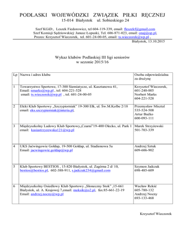 PODLASKI WOJEWÓDZKI ZWIĄZEK PIŁKI RĘCZNEJ 15-014 Białystok ul. Sobieskiego 24 Szef KGiD:, Leszek Fiedorowicz, tel 604-119-339, email: [email protected] Szef Komisji Sędziowskiej: Janusz Łopuski, Tel. 606-871-023, email: [email protected], Prezes: Krzysztof Wieczorek, tel. 601-24-00-05, email: [email protected] , Białystok, 13.10.2015 Wykaz klubów Podlaskiej III ligi seniorów w sezonie 2015/16 Lp Nazwa i adres klubu Osoba odpowiedzialna za drużynę 1 Towarzystwo Sportowe, 17-300 Siemiatycze, ul. Kasztanowa 41, Email: [email protected] , tel: 604-221-528 email: [email protected] , tel. 601-24-00-05 Krzysztof Wieczorek, 601-240-005 Norbert Marks 604-221-528 2 Ełcki Klub Sportowy „Szczypiorniak” 19-300 Ełk, ul. Św.M.Kolbe 2/18 email: [email protected], Przemysław Misztal 535-524-508 Artur Bućko 600-093-111 3 Międzyszkolny Ludowy Klub Sportowy„Czarni”19-400 Olecko, ul. Park 1 Marek Strzyżewski email: [email protected] 501-703-339 4 UKS Jaćwingowie Gołdap, 19-500 Gołdap, ul. Stadionowa 5a Email: [email protected] Andrzej Sztuk 609-606-902 5 Klub Sportowy BESTIOS , 15-820 Białystok, ul. Zagórna 2 d/ 10, [email protected], 602-388-911, [email protected] Szymon Jadczak 698-485-609 6 Międzyszkolny Osiedlowy Klub Sportowy „Słoneczny Stok” ,15-661 Białystok, ul. A. Krajowej 7,email: [email protected], fax:85-661-22-19 Email: [email protected] Wacław Rekść 605-780-132 Andrzej Nocny 693-133-468 Krzysztof Wieczorek
