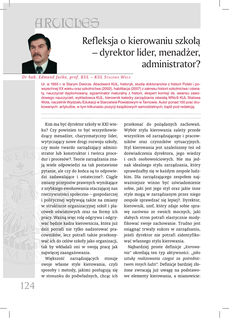 ARTICLES Refleksja o kierowaniu szkołą – dyrektor lider, menadżer, administrator? Dr hab. Edmund Ju ś ko, prof. K UL – K UL S t a l o wa W o l a Ur. w 1955 r. w Starym Dworze. Absolwent KUL, historyk, studia doktoranckie z historii Polski i powszechnej XX wieku oraz szkolnictwa (2002), habilitacja (2007) z zakresu historii szkolnictwa i oświaty, nauczyciel dyplomowany, egzaminator maturalny z historii, ekspert komisji ds. awansu zawodowego nauczycieli, wykładowca KUL, kierownik katedry zarządzania oświatą WNoS KUL Stalowa Wola, naczelnik Wydziału Edukacji w Starostwie Powiatowym w Tarnowie. Autor ponad 100 prac drukowanych: artykułów, w tym kilkunastu pozycji książkowych samodzielnych, bądź pod redakcją. Kim ma być dyrektor szkoły w XXI wieku? Czy powinien to być wszystkowiedzący menadżer, charyzmatyczny lider, wytyczający nowe drogi rozwoju szkoły, czy może twardo zarządzający administrator lub konstruktor i twórca procedur i procesów?. Teorie zarządzania znają wiele odpowiedzi na tak postawione pytanie, ale czy do końca są to odpowiedzi zadawalające i ostateczne?. Ciągłe zmiany przepisów prawnych wynikające z szybkiego ewoluowania otaczającej nas rzeczywistości społeczno – gospodarczej i politycznej wpływają także na zmiany w strukturze organizacyjnej szkół i placówek oświatowych oraz na formy ich pracy. Ważną więc rolę odgrywa i odgrywać będzie kadra kierownicza, która już dziś potrafi nie tylko nadzorować pracowników, lecz potrafi także przekonywać ich do celów szkoły jako organizacji, tak by wkładali oni w swoją pracę jak najwięcej zaangażowania. Większość zarządzających stosuje swoje własne style kierowania, czyli sposoby i metody, jakimi posługują się w stosunku do podwładnych, chcąc ich 124 przekonać do pożądanych zachowań. Wybór stylu kierowania zależy przede wszystkim od zarządzającego i pracowników oraz czynników sytuacyjnych. Styl kierowania jest uzależniony też od doświadczenia dyrektora, jego wiedzy i cech osobowościowych. Nie ma jednak idealnego stylu zarządzania, który sprawdzałby się w każdym zespole ludzkim. Dla zarządzającego zespołem najważniejsze winno być uświadomienie sobie, jaki jest jego styl oraz jakie inne style mogą w zarządzanym przez niego zespole sprawdzać się lepiej?. Dyrektor, kierownik, szef, który zdaje sobie sprawę zarówno ze swoich mocnych, jaki słabych stron potrafi elastycznie modyfikować swoje zachowanie. Trudno jest osiągnąć trwały sukces w zarządzaniu, jeżeli dyrektor nie potrafi zidentyfikować własnego stylu kierowania. Najbardziej proste definicje „kierowania” określają ten typ aktywności: „jako sztukę realizowania czegoś za pośrednictwem innych ludzi”. Definicje bardziej złożone zwracają już uwagę na podstawowe elementy kierowania, a mianowicie: ARTYKUŁY „planowanie, organizowanie, przewodzenie i kontrolowanie działalności członków organizacji oraz wykorzystanie wszystkich innych jej zasobów dla osiągnięcia założonych celów”. Za organizację, przebieg i efekty tego procesu kierowania odpowiedzialny jest zarządzający (dyrektor), czyli osoba stojąca na szczycie formalnej struktury szkoły. Formalnego dyrektora często nazywa się liderem, czy przywódcą dla podkreślenia faktu, że obok formalnych uprawnień do zarządzania potrzebuje on również nieformalnego czynnika, jakim jest jego autorytet. Dyrektorzy szkół sprawując w nich właściwe powierzone im funkcje pełnią wiele różnorodnych ról. Styl kierowania lub styl przywództwa, to sposób postępowania przełożonego w stosunku do podwładnych odzwierciedlający najczęściej jego cechy osobowościowe lub przekonania o skutecznym zarządzaniu personelem. Jest on często jednak jest wypadkową cech osobowościowych przełożonego oraz cech osobowościowych podwładnych oraz struktury zespołu pracowniczego. Styl kierowania jest to ogół metod sprawowania władzy stosowanych w danej organizacji, obejmujący: wywieranie wpływu, podejmowanie decyzji, sprawowanie kontroli nad podwładnymi, ocenianie ich, komunikację z personelem, wydawanie poleceń. Poprzez styl kierowania przełożony realizuje swoje działania. W literaturze przedmiotu można przeczytać, że stosowany przez dyrektora szkoły styl kierowania wynika z typu jego motywacji wewnętrznej tzn.: konieczności zaspokojenia własnych potrzeb np.; bezpieczeństwa, poczucia władzy, czy uzyskania osiągnięć. Na dominujący typ motywacji wpływa struktura osobowo- ści, doświadczenie życiowe, rodzaj organizacji, którą kieruje dany kierownik oraz określone konieczne wymagania niezbędne dla prawidłowego pełnionego stanowiska. Część badaczy teorii zarządzania uważa jednak, że najlepszy styl kierowania oparty jest na zaspokojeniu potrzeb podwładnego, a nie przełożonego. Oczekiwania i potrzeby pracownika wpływają na jego motywację wewnętrzną, która odpowiada za zachowanie pracownika. Rzadko można jednak spotkać dyrektora szkoły, którego styl kierowania byłby jednoznaczny i jasno określony. Najczęściej jest tak, że w danym stylu przejawiają się elementy różnych innych stylów kierowania. Efekty określonego stylu zależą od osobowości dyrektora i warunków jego działania, osobowości pracowników zwłaszcza w sferze ich potrzeb i motywacji oraz od wzajemnych interakcji. Problem skuteczności oddziaływania kierujących na podwładnych nurtuje badaczy zajmujących się organizacją i zarządzaniem (w tym także oświaty)od dziesięcioleci. Na początku lat trzydziestych XX wieku amerykański psycholog K. Lewin wykazał wpływ stylu kierowania na klimat społeczny organizacji i na zachowania poszczególnych jej członków. Na tej podstawie dokonał identyfikacji podstawowych typów zachowań kierowniczych: Style kierowania wg K. Lewina to: – kierownik autokrata: w swoim działaniu wyznacza cele organizacji i kieruje jej aktywności
