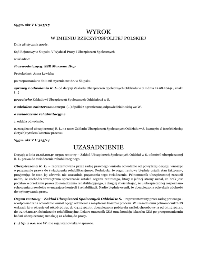 Sygn. akt V U 325/15 WYROK W IMIENIU RZECZYPOSPOLITEJ POLSKIEJ Dnia 28 stycznia 2016r. Sąd Rejonowy w Słupsku V Wydział Pracy i Ubezpieczeń Społecznych w składzie: Przewodniczący: SSR Marzena Hop Protokolant: Anna Lewicka po rozpoznaniu w dniu 28 stycznia 2016r. w Słupsku sprawy z odwołania R. Ł. od decyzji Zakładu Ubezpieczeń Społecznych Oddziału w S. z dnia 21.08.2014r., znak: (...) przeciwko Zakładowi Ubezpieczeń Społecznych Oddziałowi w S. z udziałem zainteresowanego (...) Spółki z ograniczoną odpowiedzialnością we W. o świadczenie rehabilitacyjne 1. oddala odwołanie, 2. zasądza od ubezpieczonej R. Ł. na rzecz Zakładu Ubezpieczeń Społecznych Oddziału w S. kwotę 60 zł (sześćdziesiąt złotych) tytułem kosztów procesu. Sygn. akt V U 325/14 UZASADNIENIE Decyzją z dnia 21.08.2014r. organ rentowy – Zakład Ubezpieczeń Społecznych Oddział w S. odmówił ubezpieczonej R. Ł. prawa do świadczenia rehabilitacyjnego. Ubezpieczona R. Ł. – reprezentowana przez radcę prawnego wniosła odwołanie od powyższej decyzji, wnosząc o przyznanie prawa do świadczenia rehabilitacyjnego. Podniosła, że organ rentowy błędnie ustalił stan faktyczny, przyjmując że stan jej zdrowia nie uzasadnia przyznania tego świadczenia. Pełnomocnik ubezpieczonej zarzucił nadto, że zachodzi wewnętrzna sprzeczność ustaleń organu rentowego, który z jednej strony uznał, że brak jest podstaw o orzekaniu prawa do świadczenia rehabilitacyjnego, z drugiej stwierdzając, że u ubezpieczonej rozpoznano schorzenia przewlekłe wymagające kontroli i rehabilitacji. Nadto błędnie ocenił, że ubezpieczona odzyskała zdolność do wykonywania pracy. Organ rentowy – Zakład Ubezpieczeń Społecznych Oddział w S. – reprezentowany przez radcę prawnego w odpowiedzi na odwołanie wniósł o jego oddalenie i zasądzenie kosztów procesu. W uzasadnieniu pełnomocnik ZUS wskazał, iż w okresie od 06.06.2013r. do 04.12.2013r. ubezpieczona pobierała zasiłek chorobowy, a od 05.12.2014r. do 02.06.2014r. świadczenie rehabilitacyjne. Lekarz orzecznik ZUS oraz komisja lekarska ZUS po przeprowadzeniu badań ubezpieczonej uznała ją za zdolną do pracy. (...) Sp. z o.o. we W. nie zajął stanowiska w sprawie. Sąd ustalił następujący stan faktyczny: R. Ł. ma 60 lat. Z zawodu jest stolarzem, ostatnio pracowała jako sprzątaczka w jednostce wojskowej, a obecnie w sklepie. W okresie od 06.06.2013r. do 04.12.2013r. ubezpieczona pobierała zasiłek chorobowy, a w okresie od 05.12.2013r. do 02.06.2014r. świadczenie rehabilitacyjne. Płatnikiem świadczenia do dnia trwania umowy o pracę tj. do dnia 30.06.2014r. byłby pracodawca R. Ł. - (...) Sp. z o.o. we W., natomiast po ustaniu zatrudnienia płatnikiem byłby Zakład Ubezpieczeń Społecznych. Bezsporne Decyzją z dnia 21.08.2014r. Z. O.. w S. odmówił R. Ł. prawa do świadczenia rehabilitacyjnego, powołując się na orzeczenie lekarza orzecznika i komisji lekarskiej ZUS. bezsporne oraz decyzja ZUS z dnia 21.08.2014r. – w aktach ZUS. R. Ł. odczuwa ból lędźwiowy promieniujący do prawej ręki i nogi, drętwienie i kłucia do małych palców. W 1998r. miała operację kręgosłupa lędźwiowego dyscektomię L5 S1, po której odczuwała poprawę do 2008r. Z puntu widzenia neurologicznego rozpoznano u R. Ł. stan po (...) w 1998r., bóle wielomiejscowe. R. Ł. była operowana z powodu dyskopatii lędźwiowej przed wielu laty, obecnie okres gojenia i rekonwalescencji po tej operacji jest zakończony. Badanie (...) kręgosłupa lędźwiowego wykazuje zmiany zwyrodnieniowo - wytwórcze adekwatne do wieku. U R. Ł. w obrazie klinicznym dominują objawy podmiotowe pod postacią bólu wielomiejscowego, ręki , nogi, pleców. Przedmiotowo nie stwierdzono istotnych cech niewydolności kręgosłupa ani układu nerwowego. W piątej i szóstej dekadzie życia zmiany zwyrodnieniowe kręgosłupa i dyskopatie o tym stopniu nasilenia są powszechne, obejmują ponad 50% populacji. Od strony neurochirurgicznej brak podstaw do uzasadnienia niezdolności do pracy zarobkowej zgodnie z wiekiem. Dowód: dokumentacja medyczna w aktach ZUS oraz w aktach sprawy – k.14-16 opinia biegłego lekarza specjalisty neurochirurgii i neurotraumatologii P. Z. – k.33, k.62. R. Ł. jest leczona przewlekle z powodu zespołu bólowego kręgosłupa lędźwiowego. Była wielokrotnie rehabilitowana. Okresowo przyjmuje leki przeciwbólowe. W 1998r. przebyła zabieg (...) usunięcia przepukliny dysku (...). Obecnie zgłasza dolegliwości bólowe okolicy LS przy schylaniu i dźwiganiu. Ból promieniuje do prawej kończyny dolnej. Kręgosłup szyjny wykazuje prawidłowe obrysy, prawidłową ruchomość we wszystkich płaszczyznach. Próba R. ujemna, bez cech mielopatii. Obręcze barkowe wykazują prawidłowe obrysy, bez ewidentnych zaników mięśniowych w obrębie mięśni. Wykazują ruchomość czynną i bierną w pełnym zakresie ruchu z zachowaną funkcją. Obwody ramion i przedramiona są równe. Stawy łokciowe mają prawidłowe obrysy, bez ewidentnych zaników mięśniowych w obrębie mięśni przedramienia. Ruchomość bierna i czynna występuje w pełnym zakresie ruchu z zachowaną funkcją. Nadgarstek i łokcie mają prawidłowe obrysy, bez ewidentnych zaników mięśniowych w obrębie mięśni przedramienia. Zachowują ruchomość czynną i bierną w pełnym zakresie ruchu z zachowaną funkcją. Chwyt precyzyjny i siłowy jest prawidłowy. Stawy biodrowe ubezpieczonej mają prawidłowe obrysy, bez ewidentnych zaników mięśniowych w obrębie mięśni obręczy biodrowej. Zachowana jest ruchomość czynna i bierna w pełnym zakresie ruchu. Stawy kolanowe i podudzia maja prawidłowe obrysy. Są stabilne w wszystkich płaszczyznach, ruchomość bierna i czynna jest zachowana w pełnym zakresie, bez zaników mięśniowych. Podudzia bez deficytów mięśniowych, ścięgna piętowe prawidłowe. Również stawy skokowe i stopy maja prawidłowej obrysy z