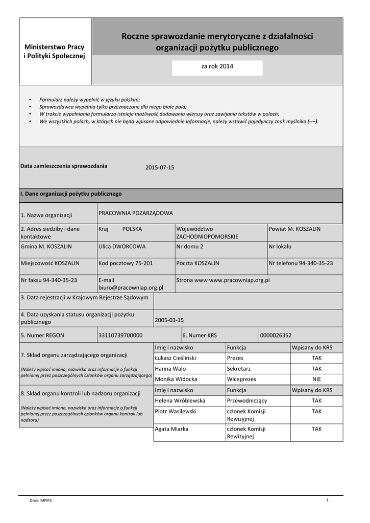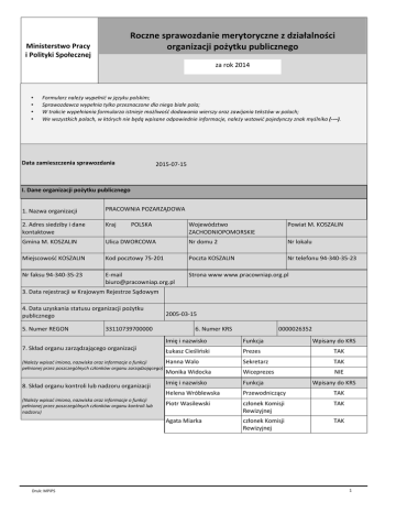 ZŽĐnjŶĞƐƉƌĂǁŽnjĚĂŶŝĞŵĞƌLJƚŽƌLJĐnjŶĞnjĚnjŝĂųĂůŶŽƑĐŝ ŽƌŐĂŶŝnjĂĐũŝƉŽǏLJƚŬƵƉƵďůŝĐnjŶĞŐŽ Ministerstwo Pracy ŝWŽůŝƚLJŬŝ^ƉŽųĞĐnjŶĞũ za rok 2014 • • • • &ŽƌŵƵůĂƌnjŶĂůĞǏLJǁLJƉĞųŶŝđǁũħnjLJŬƵƉŽůƐŬŝŵ͖ ^ƉƌĂǁŽnjĚĂǁĐĂǁLJƉĞųŶŝĂƚLJůŬŽƉƌnjĞnjŶĂĐnjŽŶĞĚůĂŶŝĞŐŽďŝĂųĞƉŽůĂ͖ tƚƌĂŬĐŝĞǁLJƉĞųŶŝĂŶŝĂĨŽƌŵƵůĂƌnjĂŝƐƚŶŝĞũĞŵŽǏůŝǁŽƑđĚŽĚĂǁĂŶŝĂǁŝĞƌƐnjLJŽƌĂnjnjĂǁŝũĂŶŝĂƚĞŬƐƚſǁǁƉŽůĂĐŚ͖ tĞǁƐnjLJƐƚŬŝĐŚƉŽůĂĐŚ͕ǁŬƚſƌLJĐŚŶŝĞďħĚČǁƉŝƐĂŶĞŽĚƉŽǁŝĞĚŶŝĞŝŶĨŽƌŵĂĐũĞ͕ŶĂůĞǏLJǁƐƚĂǁŝđƉŽũĞĚLJŶĐnjLJnjŶĂŬŵLJƑůŶŝŬĂ (--–). Data zamieszczenia sprawozdania 2015-07-15 /͘ĂŶĞŽƌŐĂŶŝnjĂĐũŝƉŽǏLJƚŬƵƉƵďůŝĐnjŶĞŐŽ 1. Nazwa organizacji WZKtE/WKZKt 2. Adres siedziby i dane kontaktowe Kraj Gmina M. KOSZALIN POLSKA Województwo ZACHODNIOPOMORSKIE Powiat M. KOSZALIN Ulica DWORCOWA Nr domu 2 Nr lokalu DŝĞũƐĐŽǁŽƑđ<K^>/E Kod pocztowy 75-201 Poczta KOSZALIN Nr telefonu 94-340-35-23 Nr faksu 94-340-35-23 E-mail [email protected] Strona www www.pracowniap.org.pl ϯ͘ĂƚĂƌĞũĞƐƚƌĂĐũŝǁ<ƌĂũŽǁLJŵZĞũĞƐƚƌnjĞ^ČĚŽǁLJŵ ϰ͘ĂƚĂƵnjLJƐŬĂŶŝĂƐƚĂƚƵƐƵŽƌŐĂŶŝnjĂĐũŝƉŽǏLJƚŬƵ publicznego 5. Numer REGON 33110739700000 ϳ͘^ŬųĂĚŽƌŐĂŶƵnjĂƌnjČĚnjĂũČĐĞŐŽŽƌŐĂŶŝnjĂĐũŝ ;EĂůĞǏLJǁƉŝƐĂđŝŵŝŽŶĂ͕ŶĂnjǁŝƐŬĂŽƌĂnjŝŶĨŽƌŵĂĐũĞŽĨƵŶŬĐũŝ ƉĞųŶŝŽŶĞũƉƌnjĞnjƉŽƐnjĐnjĞŐſůŶLJĐŚĐnjųŽŶŬſǁŽƌŐĂŶƵnjĂƌnjČĚnjĂũČĐĞŐŽͿ ϴ͘^ŬųĂĚŽƌŐĂŶƵŬŽŶƚƌŽůŝůƵďŶĂĚnjŽƌƵŽƌŐĂŶŝnjĂĐũŝ ;EĂůĞǏLJǁƉŝƐĂđŝŵŝŽŶĂ͕ŶĂnjǁŝƐŬĂŽƌĂnjŝŶĨŽƌŵĂĐũĞŽĨƵŶŬĐũŝ ƉĞųŶŝŽŶĞũƉƌnjĞnjƉŽƐnjĐnjĞŐſůŶLJĐŚĐnjųŽŶŬſǁŽƌŐĂŶƵŬŽŶƚƌŽůŝůƵď nadzoru) Druk: MPiPS 2005-03-15 6. Numer KRS 0000026352 /ŵŝħŝŶĂnjǁŝƐŬŽ Funkcja Wpisany do KRS BƵŬĂƐnjŝĞƑůŝŷƐŬŝ Prezes TAK Hanna Walo Sekretarz TAK Monika Widocka Wiceprezes NIE /ŵŝħŝŶĂnjǁŝƐŬŽ Funkcja Helena Wróblewska WƌnjĞǁŽĚŶŝĐnjČĐLJ TAK Piotr Wasilewski ĐnjųŽŶĞŬ<ŽŵŝƐũŝ Rewizyjnej TAK Agata Miarka ĐnjųŽŶĞŬ<ŽŵŝƐũŝ Rewizyjnej TAK Wpisany do KRS 1 9. Cele statutowe organizacji ;EĂůĞǏLJŽƉŝƐĂđĐĞůĞŶĂƉŽĚƐƚĂǁŝĞƐƚĂƚƵƚƵŽƌŐĂŶŝnjĂĐũŝͿ ĞůĞŵ^ƚŽǁĂƌnjLJƐnjĞŶŝĂũĞƐƚĚnjŝĂųĂůŶŽƑđŽƑǁŝĂƚŽǁĂ͕ŶĂƵŬŽǁĂ͕ŬƵůƚƵƌĂůŶĂ͕ǁ njĂŬƌĞƐŝĞĚŽďƌŽĐnjLJŶŶŽƑĐŝ͕ĂǁƐnjĐnjĞŐſůŶŽƑĐŝ͗ ĂͿǁƐƉŝĞƌĂŶŝĞŝƐƚŶŝĞũČĐLJĐŚŽƌŐĂŶŝnjĂĐũŝƉŽnjĂƌnjČĚŽǁLJĐŚǁŝĐŚĚnjŝĂųĂůŶŽƑĐŝ statutowej; ďͿǁƐƉŝĞƌĂŶŝĞĚnjŝĂųĂŷŶĂũďĂƌĚnjŝĞũĂŬƚLJǁŶLJĐŚĐnjųŽŶŬſǁƐƉŽųĞĐnjŶŽƑĐŝ ůŽŬĂůŶĞũǁƌŽnjǁŝČnjLJǁĂŶŝƵŝƐƚŶŝĞũČĐLJĐŚƉƌŽďůĞŵſǁƐƉŽųĞĐnjŶLJĐŚ͖ ĐͿŝŶƚĞŐƌĂĐũĂƐĞŬƚŽƌĂƉŽnjĂƌnjČĚŽǁĞŐŽ͖ ĚͿƐƉƌnjLJũĂŶŝĞƌŽnjǁŽũŽǁŝǁƐƉſųƉƌĂĐLJƉŽŵŝħĚnjLJǁųĂĚnjĂŵŝƐĂŵŽƌnjČĚŽǁLJŵŝŝ ƑƌŽĚŽǁŝƐŬŝĞŵďŝnjŶĞƐƵĂŽƌŐĂŶŝnjĂĐũĂŵŝƉŽnjĂƌnjČĚŽǁLJŵŝ͖ ĞͿƉƌŽŵŽǁĂŶŝĞƉƌnjĞĚƐŝħďŝŽƌĐnjŽƑĐŝŝŶĚLJǁŝĚƵĂůŶĞũŝǁƐƉŝĞƌĂŶŝĞŽƐſď bezrobotnych; ĨͿƚǁŽƌnjĞŶŝĞƐnjĞƌŽŬŽƉŽũħƚĞŐŽƐƉŽųĞĐnjĞŷƐƚǁĂŽďLJǁĂƚĞůƐŬŝĞŐŽĚnjŝħŬŝ ƉƌŽŵŽǁĂŶŝƵƉŽƐƚĂǁƉƌŽƐƉŽųĞĐnjŶLJĐŚ͖ ŐͿnjǁŝħŬƐnjĂŶŝĞnjŶĂĐnjĞŶŝĂƐĞŬƚŽƌĂƉŽnjĂƌnjČĚŽǁĞŐŽǁǏLJĐŝƵƉƵďůŝĐnjŶLJŵ͖ ŚͿƉƌŽƉĂŐŽǁĂŶŝĞǁŝĞĚnjLJŽŽƌŐĂŶŝnjĂĐũĂĐŚƉŽnjĂƌnjČĚŽǁLJĐŚŝƌƵĐŚƵ wolontarystycznym; ŝͿǁƐƉŝĞƌĂŶŝĞŝŶŝĐũĂƚLJǁƐƉŽųĞĐnjŶLJĐŚ͕ƌnjČĚŽǁLJĐŚŝƐĂŵŽƌnjČĚŽǁLJĐŚ ŶĂŬŝĞƌŽǁĂŶLJĐŚŶĂďƵĚŽǁħĚĞŵŽŬƌĂƚLJĐnjŶĞŐŽƉĂŷƐƚǁĂƉƌĂǁĂ͖ ũͿnjǁŝħŬƐnjĂŶŝĞǁŝĞĚnjLJŽhŶŝŝƵƌŽƉĞũƐŬŝĞũŝƉƌŽĐĞƐŝĞŝŶƚĞŐƌĂĐũŝĞƵƌŽƉĞũƐŬŝĞũ ǁƐƉŽųĞĐnjĞŷƐƚǁŝĞ͘ Cele te Stowarzyszenie realizuje poprzez: ĂͿnjďŝĞƌĂŶŝĞŝƌŽnjƉŽǁƐnjĞĐŚŶŝĂŶŝĞŝŶĨŽƌŵĂĐũŝĚŽƚLJĐnjČĐLJĐŚƐĞŬƚŽƌĂ ƉŽnjĂƌnjČĚŽǁĞŐŽ͖ 10. Sposób realizacji celów statutowych organizacji b) prowadzenie konsultacji i poradnictwa; ĐͿŽƌŐĂŶŝnjŽǁĂŶŝĞŝƉƌŽǁĂĚnjĞŶŝĞƐnjŬŽůĞŷ͕ǁĂƌƐnjƚĂƚſǁŽƌĂnjƐƚĂǏLJŬƌĂũŽǁLJĐŚ ;EĂůĞǏLJŽƉŝƐĂđƐƉŽƐſďƌĞĂůŝnjĂĐũŝĐĞůſǁƐƚĂƚƵƚŽǁLJĐŚŽƌŐĂŶŝnjĂĐũŝŶĂ ŝnjĂŐƌĂŶŝĐnjŶLJĐŚ͕ƉŽĚŶŽƐnjČĐLJĐŚŬǁĂůŝĨŝŬĂĐũĞƉƌnjĞĚƐƚĂǁŝĐŝĞůŝŽƌŐĂŶŝnjĂĐũŝ ƉŽnjĂƌnjČĚŽǁLJĐŚ͕ŝŶƐƚLJƚƵĐũŝƉƵďůŝĐnjŶLJĐŚŝŝŶŝĐũĂƚLJǁƐƉŽųĞĐnjŶLJĐŚ͕ podstawie statutu organizacji) njĂĂŶŐĂǏŽǁĂŶLJĐŚǁƌŽnjǁŝČnjLJǁĂŶŝĞƉƌŽďůĞŵſǁůŽŬĂůŶLJĐŚ͖ ĚͿŽƌŐĂŶŝnjŽǁĂŶŝĞŝďƌĂŶŝĞƵĚnjŝĂųƵǁƐƉŽƚŬĂŶŝĂĐŚ͕ƐĞŵŝŶĂƌŝĂĐŚŝ ŬŽŶĨĞƌĞŶĐũĂĐŚnjƵĚnjŝĂųĞŵƚƌnjĞĐŚƐĞŬƚŽƌſǁ͗ǁųĂĚnj͕ƑƌŽĚŽǁŝƐŬĂďŝnjŶĞƐƵŝ ƐĞŬƚŽƌĂƉŽnjĂƌnjČĚŽǁĞŐŽ͕ŽnjĂƐŝħŐƵůŽŬĂůŶLJŵ͕ŬƌĂũŽǁLJŵŝ ŵŝħĚnjLJŶĂƌŽĚŽǁLJŵ͖ ĞͿƉŽĚĞũŵŽǁĂŶŝĞŝŶŶLJĐŚĚnjŝĂųĂŷ͕ƐŬŝĞƌŽǁĂŶLJĐŚŶĂƌĞĂůŝnjĂĐũħĐĞůſǁ statutowych Stowarzyszenia. //͘ŚĂƌĂŬƚĞƌLJƐƚLJŬĂĚnjŝĂųĂůŶŽƑĐŝŽƌŐĂŶŝnjĂĐũŝƉŽǏLJƚŬƵƉƵďůŝĐnjŶĞŐŽǁŽŬƌĞƐŝĞƐƉƌĂǁŽnjĚĂǁĐnjLJŵ ϭ͘KƉŝƐĚnjŝĂųĂůŶŽƑĐŝƉŽǏLJƚŬƵƉƵďů