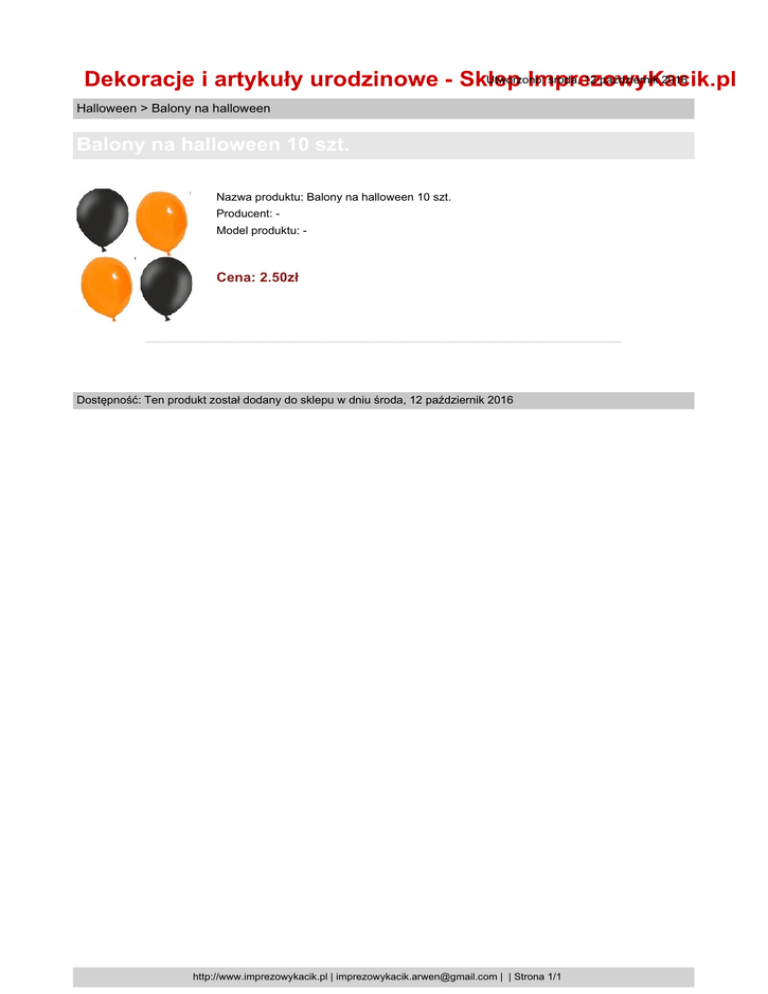 Utworzono: środa, 12 październik 2016 Dekoracje i artykuły urodzinowe - Sklep ImprezowyKacik.pl Halloween > Balony na halloween Balony na halloween 10 szt. Nazwa produktu: Balony na halloween 10 szt. Producent: Model produktu: - Cena: 2.50zł Dostępność: Ten produkt został dodany do sklepu w dniu środa, 12 październik 2016 http://www.imprezowykacik.pl | [email protected] | | Strona 1/1