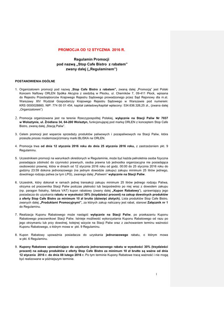 PROMOCJA OD 12 STYCZNIA 2016 R. Regulamin Promocji pod nazwą „Stop Cafe Bistro z rabatem” zwany dalej („Regulaminem”) POSTANOWIENIA OGÓLNE 1. Organizatorem promocji pod nazwą „Stop Cafe Bistro z rabatem”, zwaną dalej „Promocją” jest Polski Koncern Naftowy ORLEN Spółka Akcyjna z siedzibą w Płocku, ul. Chemików 7, 09-411 Płock, wpisana do Rejestru Przedsiębiorców Krajowego Rejestru Sądowego prowadzonego przez Sąd Rejonowy dla m.st. Warszawy XIV Wydział Gospodarczy Krajowego Rejestru Sądowego w Warszawie pod numerem: KRS 0000028860, NIP: 774 00 01 454, kapitał zakładowy/kapitał wpłacony: 534.636.326,25 zł., (zwana dalej „Organizatorem”) 2. Promocja organizowana jest na terenie Rzeczypospolitej Polskiej, wyłącznie na Stacji Paliw Nr 7037 w Wolsztynie, ul. Źródlana 34, 64-200 Wolsztyn, funkcjonującej pod marką ORLEN z konceptem Stop Cafe Bistro, zwaną dalej „Stacją Paliw”. 3. Celem promocji jest wsparcie sprzedaży produktów paliwowych i pozapaliwowych na Stacji Paliw, która przeszła proces modernizacji/zmiany marki BLISKA na ORLEN. 4. Promocja trwa od dnia 12 stycznia 2016 roku do dnia 25 stycznia 2016 roku, z zastrzeżeniem pkt. 9 Regulaminu. 5. Uczestnikiem promocji na warunkach określonych w Regulaminie, może być każda pełnoletnia osoba fizyczna posiadająca zdolność do czynności prawnych, osoba prawna lub jednostka organizacyjna nie posiadająca osobowości prawnej, która w dniach od 12 stycznia 2016 roku od godz. 00:00 do 25 stycznia 2016 roku do godziny 23:59 dokona jednorazowego (na jednym dowodzie zakupu) zakupu minimum 25 litrów jednego, dowolnego rodzaju paliwa (w tym LPG), zwanego dalej „Paliwem” wyłącznie na Stacji Paliw. 6. Uczestnik, który dokonał w ramach jednej transakcji zakupu minimum 25 litrów jednego rodzaju Paliwa, otrzyma od pracownika Stacji Paliw podczas płatności lub bezpośrednio po niej wraz z dowodem zakupu (np. paragon fiskalny, faktura VAT) kupon rabatowy (zwany dalej „Kupon Rabatowy”), uprawniający jego posiadacza do uzyskania rabatu w wysokości 30% (trzydzieści procent) na zakup dowolnych produktów z oferty Stop Cafe Bistro za minimum 10 zł brutto (dziesięć złotych). Lista produktów Stop Cafe Bistro, zwanych dalej „Produktami Promocyjnymi”, za których zakup naliczany jest rabat, stanowi Załącznik nr 1 do Regulaminu. 7. Realizacja Kuponu Rabatowego może nastąpić wyłącznie na Stacji Paliw, po przekazaniu Kuponu Rabatowego pracownikowi Stacji Paliw. Istnieje możliwość wykorzystania Kuponu Rabatowego od razu po jego otrzymaniu lub przy dowolnej, kolejnej wizycie na Stacji Paliw oraz z zachowaniem terminu ważności Kuponu Rabatowego, o którym mowa w pkt. 9 Regulaminu. 8. Kupon Rabatowy upoważnia posiadacza do uzyskania jednorazowego rabatu, o którym mowa w pkt. 6 Regulaminu. 9. Kupony Rabatowe upoważniające do uzyskania jednorazowego rabatu w wysokości 30% (trzydzieści procent) na zakupy produktów z oferty Stop Cafe Bistro za minimum 10 zł brutto są ważne od dnia 12 stycznia 2016 r. do dnia 08 lutego 2016 r. Po tym terminie Kupony Rabatowe tracą ważność i nie mogą być realizowane w późniejszym terminie. 1 10. W przypadku zakupu jednego dowolnego rodzaju Paliwa w ilości będącej wielokrotnością 25 litrów na jednym dowodzie zakupu, Uczestnikowi nie przysługuje proporcjonalnie większa liczba Kuponów Rabatowych. 11. Każdy Uczestnik może wziąć udział w Promocji wielokrotnie na zasadach opisanych Regulaminem, przy założeniu, że rabat na zakupy produktów z oferty Stop Cafe Bistro, o którym mowa w pkt. 6, może uzyskać z użyciem maksymalnie 1 (słownie: jednego) Kuponu Rabatowego. Kupony Rabatowe nie sumują się. 12. Uczestnik nie może domagać się wykorzystania Kuponu Rabatowego w celu uzyskania rabatu na inne sprzedawane na Stacji Paliw produkty lub usługi ani wymiany Kuponu Rabatowego na jego równowartość w pieniądzach ani na żadną inną wymianę. 13. W ramach jednej wizyty na Stacji Paliw można zrealizować dowolną ilość Kuponów Rabatowych uprawniających do uzyskania rabatu na zasadach określonych w Regulaminie , z zastrzeżeniem pkt 11 Regulaminu. 14. Realizacja Kuponu Rabatowego, o którym mowa w pkt. 6, nie obejmuje transakcji zakupu Produktów Promocyjnych dokonanych przy użyciu kart FLOTA, OPEN DRIVE, Biznestank oraz Karty Zakupowej i Karty Upominkowej wydawanej w ramach oferty TankBank. Realizacja Kuponu Rabatowego możliwa jest wyłącznie przy realizacji płatności za paliwo gotówką lub przy użyciu karty bankowej. 15. Realizacja Kuponu Rabatowego, o którym mowa w pkt. 6 Regulaminu, nie może być łączona z innymi promocjami i rabatami oferowanymi przez Organizatora, a wpływającymi na dalsze obniżenie ceny produktów z oferty Stop Cafe Bistro. W przypadku, gdy Uczestnik spełni warunki uprawniające go do uzyskania rabatu na produkty Stop Cafe Bistro na podstawie regulaminu innej akcji promocyjnej, Uczestnik otrzyma jeden, korzystniejszy dla siebie (wyższy) rabat zgodnie z zasadą większej korzyści dla klienta. 16. Za dokonanie zakupu Produktów Promocyjnych z użyciem Kuponu Rabatowego Uczestnikowi przysługują punkty VITAY, z zastrzeżeniem spełnienia warunków określonych w Regulaminie Programu VITAY. SPOSÓB ZGŁASZANIA I ROZPATRYWANIA REKLAMACJI 17. Reklamacje związane z przebiegiem Promocji określonej niniejszym Regulaminem mogą być zgłaszane przez Uczestników m.in.: a) na piśmie i wysłane na adres: PKN ORLEN S.A. ul. Bielańska 12; 00-085 Warszawa z dopiskiem „Promocja Stop Cafe Bistro z rabatem”, b) poprzez Formularz Kontaktowy dedykowany http://opinie.orlen.pl/forms/ZglosProblem.aspx dla Akcji Promocyjnych na stronie: c) telefonicznie w całodobowym Centrum Obsługi Klienta PKN ORLEN pod numerami telefonów: 801-167536 (z tel. stacjonarnych), 502-167-536 (z tel. komórkowych). Koszt połączenia naliczany jest zgodnie z taryfą operatora. 18. Reklamacja powinna zaw