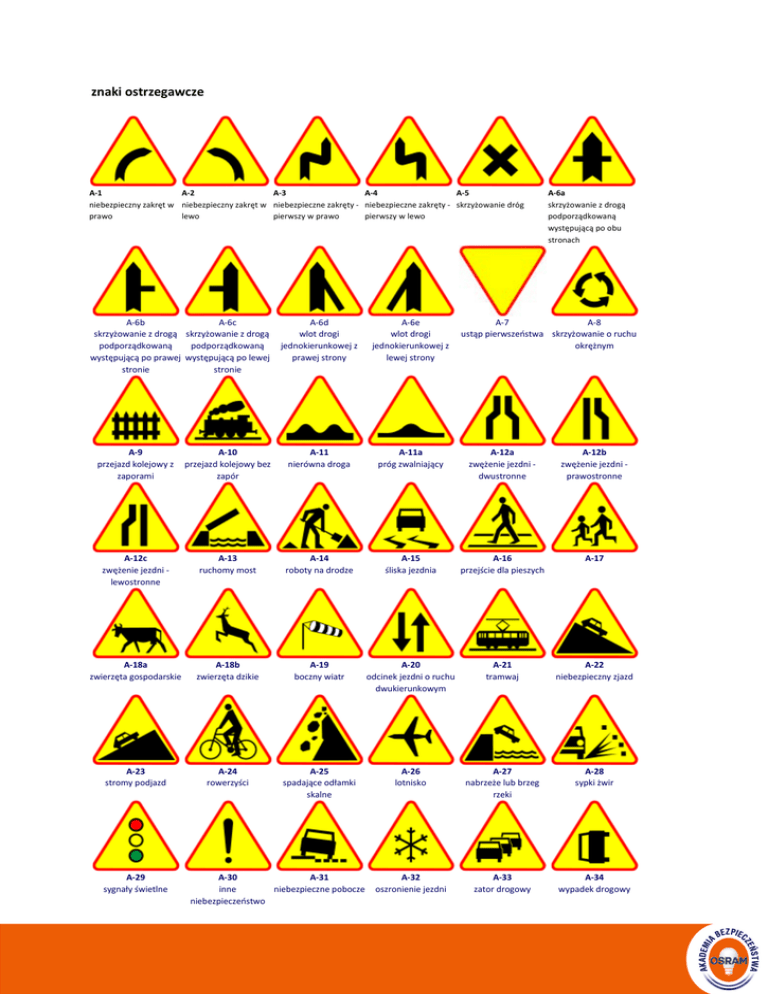 znaki ostrzegawcze A-1 A-2 A-3 A-4 A-5 niebezpieczny zakręt w niebezpieczny zakręt w niebezpieczne zakręty - niebezpieczne zakręty - skrzyżowanie dróg prawo lewo pierwszy w prawo pierwszy w lewo A-6b A-6c skrzyżowanie z drogą skrzyżowanie z drogą podporządkowaną podporządkowaną występującą po prawej występującą po lewej stronie stronie A-6d wlot drogi jednokierunkowej z prawej strony A-6e wlot drogi jednokierunkowej z lewej strony A-6a skrzyżowanie z drogą podporządkowaną występującą po obu stronach A-7 A-8 ustąp pierwszeństwa skrzyżowanie o ruchu okrężnym A-9 przejazd kolejowy z zaporami A-10 przejazd kolejowy bez zapór A-11 nierówna droga A-11a próg zwalniający A-12a zwężenie jezdni dwustronne A-12b zwężenie jezdni prawostronne A-12c zwężenie jezdni lewostronne A-13 ruchomy most A-14 roboty na drodze A-15 śliska jezdnia A-16 przejście dla pieszych A-17 A-18a zwierzęta gospodarskie A-18b zwierzęta dzikie A-19 boczny wiatr A-20 odcinek jezdni o ruchu dwukierunkowym A-21 tramwaj A-22 niebezpieczny zjazd A-23 stromy podjazd A-24 rowerzyści A-25 spadające odłamki skalne A-26 lotnisko A-27 nabrzeże lub brzeg rzeki A-28 sypki żwir A-32 oszronienie jezdni A-33 zator drogowy A-34 wypadek drogowy A-29 sygnały świetlne A-30 A-31 inne niebezpieczne pobocze niebezpieczeństwo