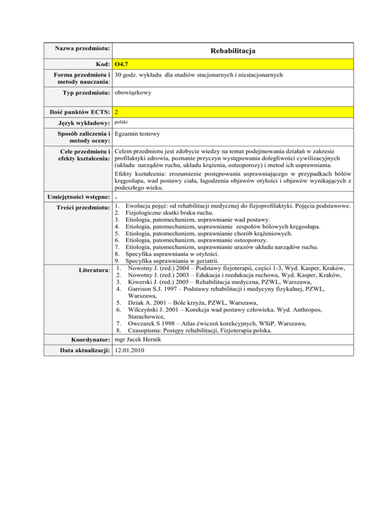 Nazwa przedmiotu: Rehabilitacja Kod: O4.7 Forma przedmiotu i 30 godz. wykładu dla studiów stacjonarnych i niestacjonarnych metody nauczania: Typ przedmiotu: obowiązkowy Ilość punktów ECTS: 2 Język wykładowy: polski Sposób zaliczenia i Egzamin testowy metody oceny: Cele przedmiotu i Celem przedmiotu jest zdobycie wiedzy na temat podejmowania działań w zakresie efekty kształcenia: profilaktyki zdrowia, poznanie przyczyn występowania dolegliwości cywilizacyjnych (układu narządów ruchu, układu krążenia, osteoporozy) i metod ich usprawniania. Efekty kształcenia: zrozumienie postępowania usprawniającego w przypadkach bólów kręgosłupa, wad postawy ciała, łagodzenia objawów otyłości i objawów wynikających z podeszłego wieku. Umiejętności wstępne: - Treści przedmiotu: 1. 2. 3. 4. 5. 6. 7. 8. 9. Literatura: 1. 2. 3. 4. 5. 6. 7. 8. Ewolucja pojęć: od rehabilitacji medycznej do fizjoprofilaktyki. Pojęcia podstawowe. Fizjologiczne skutki braku ruchu. Etiologia, patomechanizm, usprawnianie wad postawy. Etiologia, patomechanizm, usprawnianie zespołów bólowych kręgosłupa. Etiologia, patomechanizm, usprawnianie chorób krążeniowych. Etiologia, patomechanizm, usprawnianie osteoporozy. Etiologia, patomechanizm, usprawnianie urazów układu narządów ruchu. Specyfika usprawniania w otyłości. Specyfika usprawniania w geriatrii. Nowotny J. (red.) 2004 – Podstawy fizjoterapii, części 1-3, Wyd. Kasper, Kraków, Nowotny J. (red.) 2003 – Edukacja i reedukacja ruchowa, Wyd. Kasper, Kraków, Kiwerski J. (red.) 2005 – Rehabilitacja medyczna, PZWL, Warszawa, Garrison S.J. 1997 – Podstawy rehabilitacji i medycyny fizykalnej, PZWL, Warszawa, Dziak A. 2001 – Bóle krzyża, PZWL, Warszawa, Wilczyński J. 2001 – Korekcja wad postawy człowieka, Wyd. Anthropos, Starachowice, Owczarek S 1998 – Atlas ćwiczeń korekcyjnych, WSiP, Warszawa, Czasopisma: Postępy rehabilitacji, Fizjoterapia polska. Koordynator: mgr Jacek Hernik Data aktualizacji: 12.01.2010