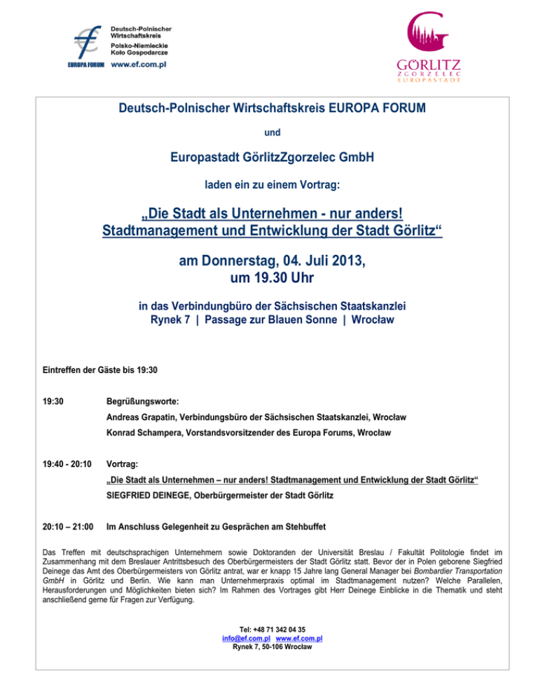 Deutsch-Polnischer Wirtschaftskreis EUROPA FORUM und Europastadt GörlitzZgorzelec GmbH laden ein zu einem Vortrag: „Die Stadt als Unternehmen - nur anders! Stadtmanagement und Entwicklung der Stadt Görlitz“ am Donnerstag, 04. Juli 2013, um 19.30 Uhr in das Verbindungbüro der Sächsischen Staatskanzlei Rynek 7 | Passage zur Blauen Sonne | Wrocław Eintreffen der Gäste bis 19:30 19:30 Begrüßungsworte: Andreas Grapatin, Verbindungsbüro der Sächsischen Staatskanzlei, Wrocław Konrad Schampera, Vorstandsvorsitzender des Europa Forums, Wrocław 19:40 - 20:10 Vortrag: „Die Stadt als Unternehmen – nur anders! Stadtmanagement und Entwicklung der Stadt Görlitz“ SIEGFRIED DEINEGE, Oberbürgermeister der Stadt Görlitz 20:10 – 21:00 Im Anschluss Gelegenheit zu Gesprächen am Stehbuffet Das Treffen mit deutschsprachigen Unternehmern sowie Doktoranden der Universität Breslau / Fakultät Politologie findet im Zusammenhang mit dem Breslauer Antrittsbesuch des Oberbürgermeisters der Stadt Görlitz statt. Bevor der in Polen geborene Siegfried Deinege das Amt des Oberbürgermeisters von Görlitz antrat, war er knapp 15 Jahre lang General Manager bei Bombardier Transportation GmbH in Görlitz und Berlin. Wie kann man Unternehmerpraxis optimal im Stadtmanagement nutzen? Welche Parallelen, Herausforderungen und Möglichkeiten bieten sich? Im Rahmen des Vortrages gibt Herr Deinege Einblicke in die Thematik und steht anschließend gerne für Fragen zur Verfügung. Tel: +48 71 342 04 35 [email protected] www.ef.com.pl Rynek 7, 50-106 Wrocław Polsko-Niemieckie Koło Gospodarcze EUROPA FORUM oraz Spółka Europastadt GörlitzZgorzelec GmbH zapraszają na prelekcję pt. „Miasto jako przedsiębiorstwo – tylko inne! Zarzadzanie i rozwój miasta Görlitz“ w czwartek, 04 lipca 2013, o godz. 19.30 w Biurrz Łącznikowym Wolnego Państwa Saksonii Rynek 7 | Pasaż Pod Błękitnym Słońcem | Wrocław Przybycie gości do 19:30 19:30 Powitanie: Andreas Grapatin, Biuro Łącznikowe Wolnego Państwa Saksonia, Wrocław Konrad Schampera, Prezes Europa Forum, Wrocław 19:40 - 20:10 Prelekcja: „Miasto jako przedsiębiorstwo – tylko inne! Zarzadzanie i rozwój miasta Görlitz“ SIEGFRIED DEINEGE, Nadburmistrz miasta Görlitz 20:10 – 21:00 Rozmowy kuluarowe oraz poczęstunek Spotkanie z niemieckojęzycznymi przedsiębiorcami z regionu oraz studentami Uniwersytetu Wrocławskiego z wydziału politologii, odbędzie się w ramach pierwszej wizyty Pana Nadburmistrza we Wrocławiu. Zanim urodzony w Polsce Siegfried Deinege został w 2012 r. Nadburmistrzem Görlitz, był przez 15 lat dyrektorem zarządzającym w firmie Bombardier Transportation GmbH w Görlitz oraz w Berlinie. Jak wykorzystać doświadczenia wyniesione ze świata biznesu w administracyjnym zarządzaniu miastem? Jakie są podobieństwa, wyzwania oraz możliwości w tej materii? Pan Nadburmistrz przybliży temat oraz chętnie udzieli wyczerpujących odpowiedzi. Tel: +48 71 342 04 35 [email protected] www.ef.com.pl Rynek 7, 50-106 Wrocław