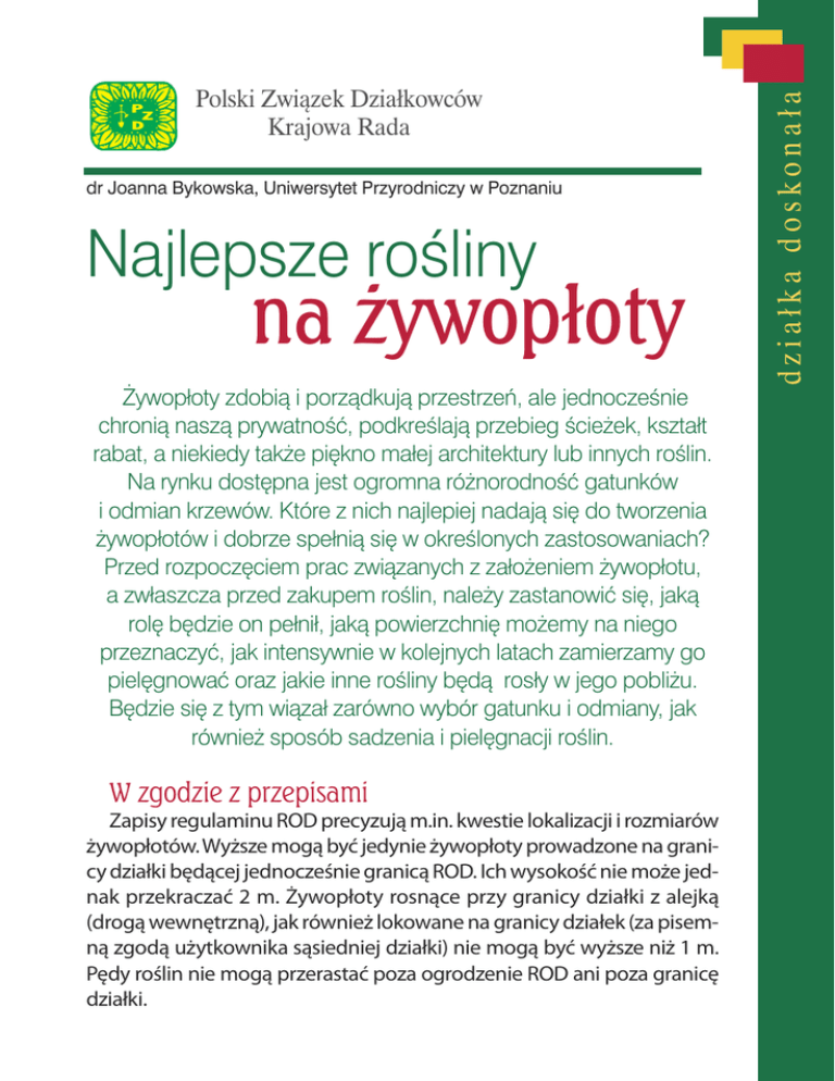 dr Joanna Bykowska, Uniwersytet Przyrodniczy w Poznaniu Najlepsze roÊliny na ˝ywopłoty ˚ywopłoty zdobià i porzàdkujà przestrzeƒ, ale jednoczeÊnie chronià naszà prywatnoÊç, podkreÊlajà przebieg Êcie˝ek, kształt rabat, a niekiedy tak˝e pi´kno małej architektury lub innych roÊlin. Na rynku dost´pna jest ogromna ró˝norodnoÊç gatunków i odmian krzewów. Które z nich najlepiej nadajà si´ do tworzenia ˝ywopłotów i dobrze spełnià si´ w okreÊlonych zastosowaniach? Przed rozpocz´ciem prac zwiàzanych z zało˝eniem ˝ywopłotu, a zwłaszcza przed zakupem roÊlin, nale˝y zastanowiç si´, jakà rol´ b´dzie on pełnił, jakà powierzchni´ mo˝emy na niego przeznaczyç, jak intensywnie w kolejnych latach zamierzamy go piel´gnowaç oraz jakie inne roÊliny b´dà rosły w jego pobli˝u. B´dzie si´ z tym wiàzał zarówno wybór gatunku i odmiany, jak równie˝ sposób sadzenia i piel´gnacji roÊlin. W zgodzie z przepisami Zapisy regulaminu ROD precyzują m.in. kwestie lokalizacji i rozmiarów żywopłotów. Wyższe mogą być jedynie żywopłoty prowadzone na granicy działki będącej jednocześnie granicą ROD. Ich wysokość nie może jednak przekraczać 2 m. Żywopłoty rosnące przy granicy działki z alejką (drogą wewnętrzną), jak również lokowane na granicy działek (za pisemną zgodą użytkownika sąsiedniej działki) nie mogą być wyższe niż 1 m. Pędy roślin nie mogą przerastać poza ogrodzenie ROD ani poza granicę działki. działka doskonała Polski Zwiàzek Działkowców Krajowa Rada T. Ciesielski działka doskonała Iglaste czy liÊciaste? m Tańsze w założeniu są żywopłoty liściaste, ale ich dekoracyjność i pełnienie funkcji osłaniającej są uzależnione od pory roku. Często także Oryginalny, piętrowy żywopłot z jałowca rozesłanego dłużej trzeba czekać na efekt ’Nana’ szczepionego na jałowcu pospolitym końcowy. Zaletą tej grupy jest za to ogromny wybór gatunków i odmian, różniących się rozmiarami, pokrojem, barwą liści i pędów. Dodatkowo wiele z nich atrakcyjnie kwitnie lub ma barwne owoce. Tak duże zróżnicowanie stwarza możliwości doboru gatunków do różnych warunków siedliskowych, a co najważniejsze – rośliny te są zwykle w pełni odporne na mróz. m Żywopłoty z iglaków są droższe, ale bardziej dekoracyjne. Efekt uzyskuje się szybciej, przy czym rośliny z tej grupy mają często większe wymagania, szczególnie świetlne i wilgotnościowe, niż rośliny liściaste. m Najmniej popularne w naszym klimacie są żywopłoty z gatunków o zawsze zielonych liściach. Rośliny są drogie w zakupie, z reguły dość wolno rosną i nie są w pełni wytrzymałe na mróz. Wp∏yw na otoczenie Naszej uwadze umyka zwykle wpływ żywopłotu na najbliższe otoczenie. Jest to tym bardziej istotne, że raz posadzony, będzie rósł w danym miejscu przez wiele lat. m Większość krzewów posiada wiązkowy, dość płytki, ale rozległy system korzeniowy. Intensywnie rosnące rośliny wysuszają i wyjaławiają wierzchnią warstwę gleby, utrudniają jej pielęgnację i wzrost innych roślin. Żywopłoty cieniują rosnące w pobliżu rośliny (dotyczy to także trawników), często uniemożliwiając ich prawidłowy wzrost i kwitnienie. W pobliżu żywopłotów lepiej jest zatem sadzić gatunki o mniejszych potrzebach pokarmowych, wodnych i świetlnych. m Dodatkowym problemem mogą być reakcje alergiczne na olejki eteryczne wydzielane przez niektóre rośliny iglaste, w tym bardzo popularne u nas żywotniki. Aby uniknąć niekorzystnego wpływu olejków 2 WielkoÊç i kszta∏t Żywopłoty dzieli się głównie ze względu na wysokość (niskie – do 1 m wysokości, średnie – o wys. 1–1,5 m i wysokie – o wys. ok. 2–3 m) oraz sposób prowadzenia (formowane, nieformowane i półnaturalne). Przy żywopłotach ciętych, ważny jest ich doce- A. Marosz lowy kształt. Zazwyczaj zaleca się prowadzenie żywopłotu z szerszą podstawą i pochylonymi ścianami, co poprawia doświetlenie dolnych partii roślin i zapobiega ich ogałacaniu się. Im węższy jest naturalny pokrój rośliny i im mniejsze są jej wymagania co do światła, tym bardziej pionowe mogą być ściany żywopłotu. Z kolei im bardziej zacienione jest stanowisko, na którym sadzi się żywopłot lub im większe wymagania świetlne ma roślina, tym bardziej ściany ży- Średni, formowany żywopłot z cisu pospolitego ’Aurescens’ wopłotu powinny być skośne. ˚ywop∏oty formowane Na tereny ROD najbardziej nadają się żywopłoty cięte. Zajmują one mniej miejsca, gdyż formowanie umożliwia utrzymanie pożądanej wysokości i szerokości. Strzyżenie nadaje im regularny, geometryczny kształt. Dekoracją tych żywopłotów są głównie barwne liście, pokrój lub faktura pędów w okresie bezlistnym. Użycie nawet najbardziej obficie kwitnących gatunków nie zapewni uzyskania takiego kwitnienia jak u form naturalnych. Cięcie, które musi być prowadzone corocznie, zawsze spowoduje usunięcie fragmentów pędów z pąkami kwiatowymi, a przez to rośliny zakwitną słabo lub wcale. Istotne jest, że zaprzestanie cięcia przez 1–2 sezony zaprzepaści wykonaną wcześniej pracę. Na formowane żywopłoty nadają się gatunki, które dobrze znoszą cięcie i łatwo się zagęszczają. Wysokie, 2-metrowe (ale i niższe) zielone ścia3 działka doskonała eterycznych, żywopłoty np. z żywotników, możemy sadzić w miejscach przewiewnych lub lokować je z dala od miejsc, w których często przebywamy. Możemy też po prostu zamiast nich wybierać gatunki liściaste. działka doskonała M. Klessa Archiwum, M. i C. Kurkiewicz Formowany żywopłot z różnych odmian trzmieliny Fortune’a Niski, formowany żywopłot z bukszpanu wieczniezielonego ny można uzyskać m.in. z ligustru pospolitego (Ligustrum vulgare), irgi błyszczącej (Cotoneaster lucidus), tawuły van Houtte’a (Spiraea ×vanhouttei), jaśminowc