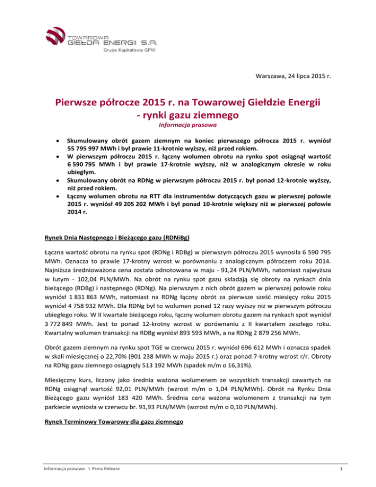 Warszawa, 24 lipca 2015 r. Pierwsze półrocze 2015 r. na Towarowej Giełdzie Energii - rynki gazu ziemnego Informacja prasowa Skumulowany obrót gazem ziemnym na koniec pierwszego półrocza 2015 r. wyniósł 55 795 997 MWh i był prawie 11-krotnie wyższy, niż przed rokiem. W pierwszym półroczu 2015 r. łączny wolumen obrotu na rynku spot osiągnął wartość 6 590 795 MWh i był prawie 17-krotnie wyższy, niż w analogicznym okresie w roku ubiegłym. Skumulowany obrót na RDNg w pierwszym półroczu 2015 r. był ponad 12-krotnie wyższy, niż przed rokiem. Łączny wolumen obrotu na RTT dla instrumentów dotyczących gazu w pierwszej połowie 2015 r. wyniósł 49 205 202 MWh i był ponad 10-krotnie większy niż w pierwszej połowie 2014 r. Rynek Dnia Następnego i Bieżącego gazu (RDNiBg) Łączna wartość obrotu na rynku spot (RDNg i RDBg) w pierwszym półroczu 2015 wynosiła 6 590 795 MWh. Oznacza to prawie 17-krotny wzrost w porównaniu z analogicznym półroczem roku 2014. Najniższa średnioważona cena została odnotowana w maju - 91,24 PLN/MWh, natomiast najwyższa w lutym - 102,04 PLN/MWh. Na obrót na rynku spot gazu składają się obroty na rynkach dnia bieżącego (RDBg) i następnego (RDNg). Na pierwszym z nich obrót gazem w pierwszej połowie roku wyniósł 1 831 863 MWh, natomiast na RDNg łączny obrót za pierwsze sześć miesięcy roku 2015 wyniósł 4 758 932 MWh. Dla RDNg był to wolumen ponad 12 razy wyższy niż w pierwszym półroczu ubiegłego roku. W II kwartale bieżącego roku, łączny wolumen obrotu gazem na rynkach spot wyniósł 3 772 849 MWh. Jest to ponad 12-krotny wzrost w porównaniu z II kwartałem zeszłego roku. Kwartalny wolumen transakcji na RDBg wyniósł 893 593 MWh, a na RDNg 2 879 256 MWh. Obrót gazem ziemnym na rynku spot TGE w czerwcu 2015 r. wyniósł 696 612 MWh i oznacza spadek w skali miesięcznej o 22,70% (901 238 MWh w maju 2015 r.) oraz ponad 7-krotny wzrost r/r. Obroty na RDNg gazu ziemnego osiągnęły 513 192 MWh (spadek m/m o 16,31%). Miesięczny kurs, liczony jako średnia ważona wolumenem ze wszystkich transakcji zawartych na RDNg osiągnął wartość 92,01 PLN/MWh (wzrost m/m o 1,04 PLN/MWh). Obrót na Rynku Dnia Bieżącego gazu wyniósł 183 420 MWh. Średnia cena ważona wolumenem z transakcji na tym parkiecie wyniosła w czerwcu br. 91,93 PLN/MWh (wzrost m/m o 0,10 PLN/MWh). Rynek Terminowy Towarowy dla gazu ziemnego Informacja prasowa Ι Press Release 1 W pierwszej połowie 2015 roku wolumen obrotu gazem na rynku terminowym wyniósł 49 205 202 MWh. Jest to ponad 10-krotny wzrost w porównaniu do roku ubiegłego. Natomiast w II kwartale bieżącego roku, wolumen obrotu ukształtował się na poziomie 16 573 144 MWh. W porównaniu z analogicznym okresem minionego roku jest to ponad 4-krotny wzrost. Obrót gazem ziemnym na Rynku Terminowym Towarowym w czerwcu 2015 r. wyniósł 6 402 673 MWh. W porównaniu do analogicznego okresu w roku ubiegłym obroty gazem na RTT wzrosły prawie 3-krotnie. W skali miesięcznej miał miejsce wzrost na poziomie 35,81% (4 714 493 MWh w maju 2015 r.). Wolumen obrotu na instrumencie z dostawą pasmową w roku 2016 (GAS_BASE_Y-16) wyniósł w czerwcu 1 177 056 (w porównaniu do 834 480 MWh w maju br.). Wolumen ten stanowi 18% obrotu na RTT dla gazu ziemnego w czerwcu. Średnia cena ważona wolumenem transakcji dla tego instrumentu wyniosła 96,31 PLN/MWh (wzrost m/m o 0,98 PLN/MWh). Najwyższy obrót odnotowano dla kontraktu z dostawą pasmową w sezonie zimowym 2015 r. (GAS_BASE_S-W-15) – 1 712 880 MWh (27 proc. obrotu na RTT dla gazu ziemnego w czerwcu) przy średnioważonej cenie 97,77 PLN/MWh (spadek m/m o 0,15 PLN/MWh). Rynki gazu na TGE 2014/2015: Wolumeny i ceny Uczestnicy rynku gazu Na Towarowej Giełdzie Energii z końcem czerwca br. bezpośrednimi członkami rynku gazu było 20 podmiotów, natomiast łącznie aktywnych uczestników – handlujących bezpośrednio i pośrednio przez domy maklerskie, tzw. kodów ZUP, było 56. Informacja prasowa Ι Press Release 2 *** Towarowa Giełda Energii S.A. (TGE) powstała pod koniec 1999 roku. Jest jedyną licencjonowaną giełdą energii w Polsce. Działalność operacyjną rozpoczęła 30 czerwca 2000 roku. Uruchomienie TGE było jednym z pierwszych działań w kierunku liberalizacji polskiego rynku energii elektrycznej i prywatyzacji sektora elektroenergetycznego. Od lutego 2012 r. TGE jest wyłączną własnością Giełdy Papierów Wartościowych w Warszawie. TGE prowadzi rynki: energii elektrycznej (Rynek Terminowy Towarowy - RTT, Rynek Dnia Następnego - RDN, Rynek Dnia Bieżącego - RDB) oraz gazu (RTT, RDNg), a także Rynek Praw Majątkowych. Jest obecnie najbardziej dynamicznie rozwijającą się giełdą towarową w regionie. Potwierdza to przynależność do organizacji EUROPEX, promującej idee konsolidacji rynków energetycznych poprzez połączenia transgraniczne i zrzeszającej wszystkie towarowe i finansowe giełdy energii w Europie. Od grudnia 2010 TGE i Nord Pool Spot prowadzą połączone rynki dnia następnego na zasadach market coupling na połączeniu Swe-Pol Link łączącym Szwecję i Polskę. Łączny wolumen obrotu na rynkach energii elektrycznej Towarowej Giełdy Energii w 2014 r. wyniósł 186,8 TWh (wzrost o 5,8% w stosunku do 2013 r.), z czego na rynku spot (Rynek Dnia Następnego oraz Rynek Dnia Bieżącego) – 23,8 TWh (wzrost o 7,05% w porównaniu do 2013 r.), natomiast na Rynku Terminowym Towarowym – 163 TWh (wzrost o 5,6% w porównaniu do 2013 r.). Na parkiecie gazu ziemnego łączny wolumen obrotów osiągnął 111,6 TWh, co oznacza, że wzrósł w odniesieniu do wolumenu z 2013 r. prawie 47-krotnie. Na rynku spot gazu (Rynek Dnia Następnego gazu oraz Rynek Dnia Bieżącego gazu) – handel paliwem osiągnął wartość 6,6 TWh (15-krotny wzrost w stosunku do 2013 r.), a na Rynku Terminowym Towarowym - 105 TWh (53-krotny wzrost w porównaniu do 2013 r.). www.tge.pl Kontakt dla mediów: Tow