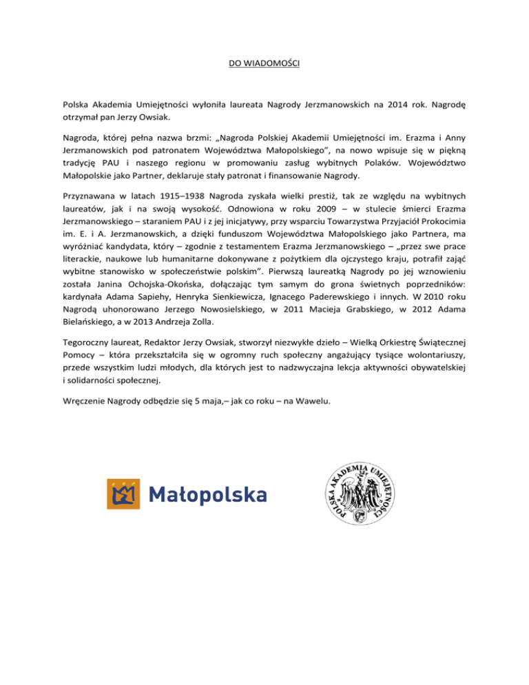 DO WIADOMOŚCI Polska Akademia Umiejętności wyłoniła laureata Nagrody Jerzmanowskich na 2014 rok. Nagrodę otrzymał pan Jerzy Owsiak. Nagroda, której pełna nazwa brzmi: „Nagroda Polskiej Akademii Umiejętności im. Erazma i Anny Jerzmanowskich pod patronatem Województwa Małopolskiego”, na nowo wpisuje się w piękną tradycję PAU i naszego regionu w promowaniu zasług wybitnych Polaków. Województwo Małopolskie jako Partner, deklaruje stały patronat i finansowanie Nagrody. Przyznawana w latach 1915–1938 Nagroda zyskała wielki prestiż, tak ze względu na wybitnych laureatów, jak i na swoją wysokość. Odnowiona w roku 2009 – w stulecie śmierci Erazma Jerzmanowskiego – staraniem PAU i z jej inicjatywy, przy wsparciu Towarzystwa Przyjaciół Prokocimia im. E. i A. Jerzmanowskich, a dzięki funduszom Województwa Małopolskiego jako Partnera, ma wyróżniać kandydata, który – zgodnie z testamentem Erazma Jerzmanowskiego – „przez swe prace literackie, naukowe lub humanitarne dokonywane z pożytkiem dla ojczystego kraju, potrafił zająć wybitne stanowisko w społeczeństwie polskim”. Pierwszą laureatką Nagrody po jej wznowieniu została Janina Ochojska-Okońska, dołączając tym samym do grona świetnych poprzedników: kardynała Adama Sapiehy, Henryka Sienkiewicza, Ignacego Paderewskiego i innych. W 2010 roku Nagrodą uhonorowano Jerzego Nowosielskiego, w 2011 Macieja Grabskiego, w 2012 Adama Bielańskiego, a w 2013 Andrzeja Zolla. Tegoroczny laureat, Redaktor Jerzy Owsiak, stworzył niezwykłe dzieło – Wielką Orkiestrę Świątecznej Pomocy – która przekształciła się w ogromny ruch społeczny angażujący tysiące wolontariuszy, przede wszystkim ludzi młodych, dla których jest to nadzwyczajna lekcja aktywności obywatelskiej i solidarności społecznej. Wręczenie Nagrody odbędzie się 5 maja,– jak co roku – na Wawelu.