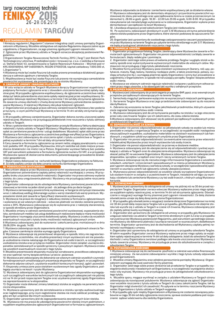 REGULAMIN TARGÓW I. Postanowienia ogólne 1 Niniejszy regulamin („Regulamin”) stanowi integralną część umowy pomiędzy Organizatorem a Wystawcą. Wszelkie odstępstwa od zapisów Regulaminu dopuszczalne są po uzgodnieniu z Organizatorem, za jego pisemną zgodą pod rygorem nieważności. 2 Zgłoszenie przez Wystawcę udziału w Targach oznacza akceptację postanowień Regulaminu. 3 Organizatorem Targów Nowoczesnej Techniki Feniksy 2015 („Targi”) jest Bielski Park Technologiczny Lotnictwa, Przedsiębiorczości i Innowacji sp. z o.o. z siedzibą w Kaniowie ul. Stefana Kóski 43, zarejestrowana w Sądzie Rejonowym Katowice – Wschód pod nr KRS 0000169940, NIP 5480018674, REGON 071003138, kapitał zakładowy 7.000.000 zł, („Organizator”). 4 Wystawcą może być osoba fizyczna lub osoba prawna prowadząca działalność gospodarczą w zakresie zgodnym z tematyką Targów. 5. Współwystawcą może być osoba fizyczna lub prawna nie wynajmująca samodzielnie powierzchni wystawowej, ale prezentująca się na stoisku Wystawcy. II. Zawarcie umowy i warunki płatności 1 W celu wzięcia udziału w Targach Wystawca doręczy Organizatorowi wypełniony i podpisany formularz zgłoszenia wraz z dowodem uiszczenia bezzwrotnej opłaty rejestracyjnej. W przypadku zgłoszenia współwystawcy, do zgłoszenia uczestnictwa należy dołączyć także potwierdzenie uiszczenia opłaty rejestracyjnej przez współwystawcę. Organizator dokonuje rejestracji Wystawcy w terminie 7 dni od daty otrzymania zgłoszenia. Do zawarcia umowy dochodzi z chwilą doręczenia Wystawcy potwierdzenia zarejestrowania Wystawcy. O rejestracji Wystawcy decyduje kolejność zgłoszeń. 2 Organizatorowi przysługuje prawo odmowy zarejestrowania Wystawcy bez podania przyczyny, o czym poinformuje Wystawcę w terminie 14 dni od daty otrzymania zgłoszenia. 3. W przypadku odmowy zarejestrowania, Organizator dokona zwrotu uiszczonej opłaty rejestracyjnej. Wystawcy nie przysługują jakiekolwiek inne roszczenia z tytułu odmowy udziału w Targach. 4. Wraz z potwierdzeniem rejestracji Organizator przesyła Wystawcy fakturę obejmującą należność z tytułu udziału w Targach Wystawcy i Współwystawcy: opłat rejestracyjnych, opłat za zamówione powierzchnie i usługi dodatkowe. Wysokość opłat obliczona przez Wystawcę w formularzu zgłoszenia uczestnictwa podlega weryfikacji przez Organizatora. 5 Wystawca jest zobowiązany do uiszczenia opłat z tytułu uczestnictwa w Targach w pełnej wysokości w terminie 7 dni od daty otrzymania faktury. 6 Ceny zawarte w formularzu zgłoszenia są cenami netto; ulegają powiększeniu o wartość podatku VAT. W przypadku Wystawców, których siedziba lub stałe miejsce prowadzenia działalności nie mieści się w Polsce, Organizator wystawi fakturę bez podatku VAT pod warunkiem wskazania w formularzu zgłoszenia numeru EU VAT, a w przypadku Wystawców spoza UE dostarczenia dokumentu potwierdzającego prowadzenie działalności gospodarczej. 7 Wpłat należy dokonywać na rachunek bankowy Organizatora wskazany na fakturze. 8 Za datę zapłaty uznaje się datę uznania rachunku bankowego Organizatora. III. Powierzchnia wystawowa 1. Warunkiem objęcia przez Wystawcę powierzchni wystawowej jest przedstawienie Organizatorowi potwierdzenia zapłaty pełnej należności wynikającej z umowy. W przypadku braku uiszczenia wszystkich należności, Organizator ma prawo odmowy wydania stoiska, do czasu uregulowania płatności. Wystawcy nie przysługują żadne roszczenia z tego tytułu. 2 Organizator zobowiązuje się do udostępnienia Wystawcy zamówionej powierzchni wystawowej w terminie na jeden dzień przed - do jednego dnia po dacie targów. 3. Wystawca zamawiający powierzchnię wystawową w hangarze otrzymuje stanowisko wraz z zabudową według dokonanego wyboru wersji standard lub wersji premium. Wyposażenie stoisk jest zawarte w Specyfikacji stanowisk wystawowych. 4. Wystawca ma prawo do rezygnacji z zabudowy stoiska w formularzu zgłoszeniowym i wykonania jej we własnym zakresie - wówczas płatność za stoisko zostanie pomniejszona o 30%. Wykonawca zobowiązuje się do wykonania prac z należytą starannością, w sposób określony przez Organizatora. 5. Wszelkie zmiany w zakresie zamówionej powierzchni wystawowej, wyposażenia stoiska, zamówionych mediów lub usług dodatkowych realizowane będą w miarę możliwości Organizatora i wymagają uiszczenia dodatkowej opłaty. Wystawca zrzeka się wszelkich ewentualnych roszczeń z tytułu braku możliwości realizacji zgłoszonych zmian. 6 Wystawca zobowiązany jest do wykonania i zakończenia prac montażowych w dniu 26.06.2014 do godz. 14.00. 7. Wystawca zobowiązuje się do zapewnienia obsługi stoiska w godzinach otwarcia Targów. Czasowe zamknięcie stoiska wymaga zgody Organizatora. 8. Wystawca zobowiązuje się prezentować eksponaty w sposób, który nie zagraża bezpieczeństwu uczestników, nie utrudnia prezentacji innym wystawcom ani nie powoduje uszkodzenia mienia należącego do Organizatora lub osób trzecich, w szczególności uszkodzenia stoiska oraz przyłącza mediów. Organizator może zażądać usunięcia eksponatów zainstalowanych w sposób sprzeczny z powyższym zapisem. Wystawca zrzeka się wszelkich ewentualnych roszczeń z tego tytułu. 9 .Wszelkie prezentowane eksponaty muszą być oznakowane, prawidłowo zabezpieczone oraz spełniać normy bezpieczeństwa i przeciw pożarowe. 10. Wystawca jest zobowiązany do dokonania we własnym zakresie wszelkich czynności formalnoprawnych umożliwiających prezentację eksponatu na Targach, w szczególności dokonania odpraw celnych, uzyskania wszelkich koniecznych koncesji, zgód i pozwoleń. 11. Eksponaty umieszczone poza stoiskiem wystawowym bez zgody Organizatora, podlegają usunięciu na koszt i ryzyko Wystawcy. 12. Wystawca zobowiązany jest do zgłoszenia Organizatorowi eksponatów wymagających szczególnych warunków technicznych lub szczególn