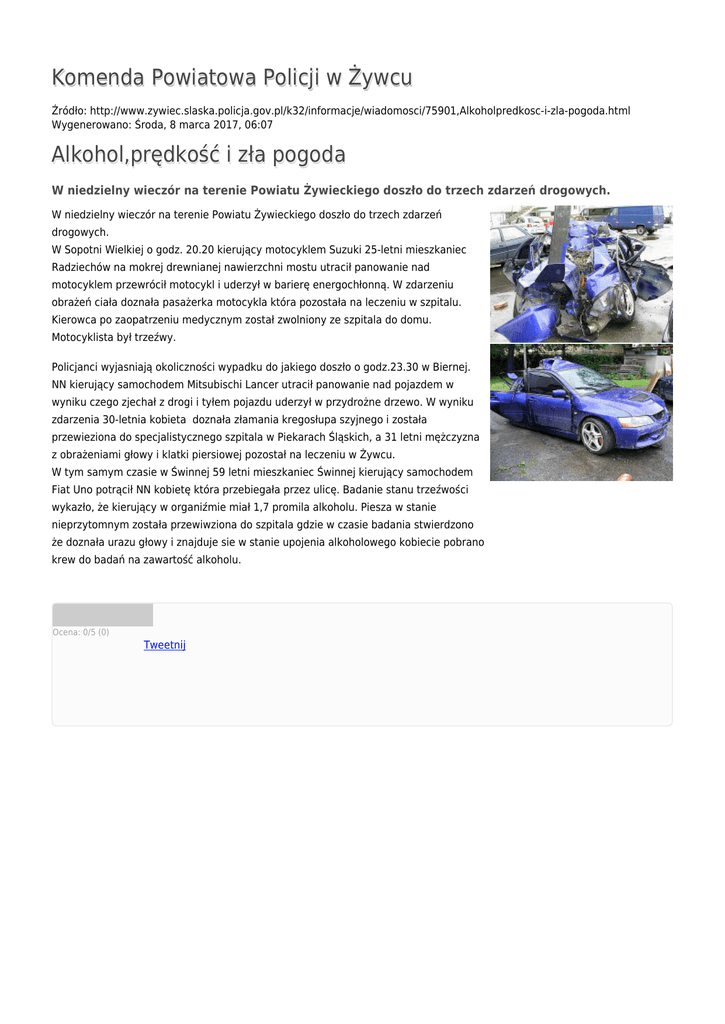 Komenda Powiatowa Policji w Żywcu Źródło: http://www.zywiec.slaska.policja.gov.pl/k32/informacje/wiadomosci/75901,Alkoholpredkosc-i-zla-pogoda.html Wygenerowano: Środa, 8 marca 2017, 06:07 Alkohol,prędkość i zła pogoda W niedzielny wieczór na terenie Powiatu Żywieckiego doszło do trzech zdarzeń drogowych. W niedzielny wieczór na terenie Powiatu Żywieckiego doszło do trzech zdarzeń drogowych. W Sopotni Wielkiej o godz. 20.20 kierujący motocyklem Suzuki 25-letni mieszkaniec Radziechów na mokrej drewnianej nawierzchni mostu utracił panowanie nad motocyklem przewrócił motocykl i uderzył w barierę energochłonną. W zdarzeniu obrażeń ciała doznała pasażerka motocykla która pozostała na leczeniu w szpitalu. Kierowca po zaopatrzeniu medycznym został zwolniony ze szpitala do domu. Motocyklista był trzeźwy. Policjanci wyjasniają okoliczności wypadku do jakiego doszło o godz.23.30 w Biernej. NN kierujący samochodem Mitsubischi Lancer utracił panowanie nad pojazdem w wyniku czego zjechał z drogi i tyłem pojazdu uderzył w przydrożne drzewo. W wyniku zdarzenia 30-letnia kobieta doznała złamania kregosłupa szyjnego i została przewieziona do specjalistycznego szpitala w Piekarach Śląskich, a 31 letni mężczyzna z obrażeniami głowy i klatki piersiowej pozostał na leczeniu w Żywcu. W tym samym czasie w Świnnej 59 letni mieszkaniec Świnnej kierujący samochodem Fiat Uno potrącił NN kobietę która przebiegała przez ulicę. Badanie stanu trzeźwości wykazło, że kierujący w organiźmie miał 1,7 promila alkoholu. Piesza w stanie nieprzytomnym została przewiwziona do szpitala gdzie w czasie badania stwierdzono że doznała urazu głowy i znajduje sie w stanie upojenia alkoholowego kobiecie pobrano krew do badań na zawartość alkoholu. Ocena: 0/5 (0) Tweetnij