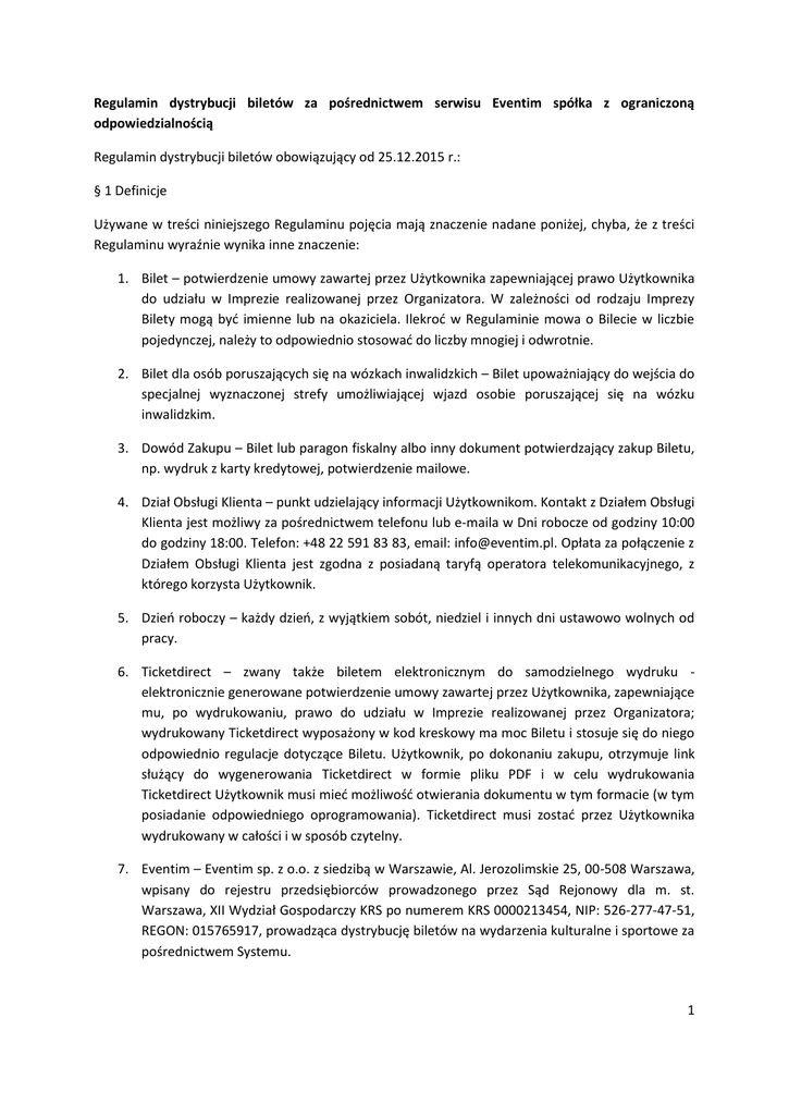 Regulamin dystrybucji biletów za pośrednictwem serwisu Eventim spółka z ograniczoną odpowiedzialnością Regulamin dystrybucji biletów obowiązujący od 25.12.2015 r.: § 1 Definicje Używane w treści niniejszego Regulaminu pojęcia mają znaczenie nadane poniżej, chyba, że z treści Regulaminu wyraźnie wynika inne znaczenie: 1. Bilet – potwierdzenie umowy zawartej przez Użytkownika zapewniającej prawo Użytkownika do udziału w Imprezie realizowanej przez Organizatora. W zależności od rodzaju Imprezy Bilety mogą być imienne lub na okaziciela. Ilekroć w Regulaminie mowa o Bilecie w liczbie pojedynczej, należy to odpowiednio stosować do liczby mnogiej i odwrotnie. 2. Bilet dla osób poruszających się na wózkach inwalidzkich – Bilet upoważniający do wejścia do specjalnej wyznaczonej strefy umożliwiającej wjazd osobie poruszającej się na wózku inwalidzkim. 3. Dowód Zakupu – Bilet lub paragon fiskalny albo inny dokument potwierdzający zakup Biletu, np. wydruk z karty kredytowej, potwierdzenie mailowe. 4. Dział Obsługi Klienta – punkt udzielający informacji Użytkownikom. Kontakt z Działem Obsługi Klienta jest możliwy za pośrednictwem telefonu lub e-maila w Dni robocze od godziny 10:00 do godziny 18:00. Telefon: +48 22 591 83 83, email: [email protected]. Opłata za połączenie z Działem Obsługi Klienta jest zgodna z posiadaną taryfą operatora telekomunikacyjnego, z którego korzysta Użytkownik. 5. Dzień roboczy – każdy dzień, z wyjątkiem sobót, niedziel i innych dni ustawowo wolnych od pracy. 6. Ticketdirect – zwany także biletem elektronicznym do samodzielnego wydruku elektronicznie generowane potwierdzenie umowy zawartej przez Użytkownika, zapewniające mu, po wydrukowaniu, prawo do udziału w Imprezie realizowanej przez Organizatora; wydrukowany Ticketdirect wyposażony w kod kreskowy ma moc Biletu i stosuje się do niego odpowiednio regulacje dotyczące Biletu. Użytkownik, po dokonaniu zakupu, otrzymuje link służący do wygenerowania Ticketdirect w formie pliku PDF i w celu wydrukowania Ticketdirect Użytkownik musi mieć możliwość otwierania dokumentu w tym formacie (w tym posiadanie odpowiedniego oprogramowania). Ticketdirect musi zostać przez Użytkownika wydrukowany w całości i w sposób czytelny. 7. Eventim – Eventim sp. z o.o. z siedzibą w Warszawie, Al. Jerozolimskie 25, 00-508 Warszawa, wpisany do rejestru przedsiębiorców prowadzonego przez Sąd Rejonowy dla m. st. Warszawa, XII Wydział Gospodarczy KRS po numerem KRS 0000213454, NIP: 526-277-47-51, REGON: 015765917, prowadząca dystrybucję biletów na wydarzenia kulturalne i sportowe za pośrednictwem Systemu. 1 8. FanTicket – Bilet z kolorowym nadrukiem, dostępny jedynie przy zamówieniach składanych na stronie www.eventim.pl, na wybrane Imprezy. 9. Impreza – każde widowisko kulturalne czy sportowe lub inne, które realizowane jest przez Organizatora, na które Bilety są dystrybuowane za pośrednictwem Eventim. 10. Kwota należności – jest to kwota, którą Użytkownik powinien ostatecznie zapłacić po skutecznym złożeniu zamówienia Biletu. Na kwotę składają się cena wybranych Biletów, koszt dodatkowych elementów zamówienia wybranych przez Użytkownika, zgodnie z §7, Opłata serwisowa oraz koszt dostawy według opcji wybranej przez Użytkownika. O ostatecznej wysokości Kwoty należności Użytkownik jest informowany przed potwierdzeniem zamówienia. 11. Obiekt – miejsce, w którym będzie się odbywać dana Impreza. 12. Opłata serwisowa – opłata należna z tytułu korzystania przez Użytkownika z Systemu na stronie www.eventim.pl. w wysokości 3% sumy cen zamówionych Biletów oraz kosztu dodatkowych elementów zamówienia wybranych przez Użytkownika, zgodnie z §7. 13. Organizator – każda osoba fizyczna, prawna lub jednostka organizacyjna, będąca organizatorem Imprezy. 14. Regulamin – niniejszy Regulamin dystrybucji biletów przez Eventim. 15. Regulamin Organizatora – regulamin konkretnej Imprezy ustanowiony przez jej Organizatora. 16. System – komputerowy system dystrybucji Biletów udostępniony przez Eventim. System umożliwia obsługę procesu składania zamówień, dystrybucji i odbioru Biletów, a także dokonywania zwrotów Biletów. 17. Użytkownik – każda osoba korzystająca z Systemu na stronie www.eventim.pl i nabywająca Bilet za pomocą Systemu. 18. Voucher Eventim – bon wydany na okaziciela, posiadający unikalny kod, uprawniający Użytkownika do jego realizacji za pośrednictwem strony www.eventim.pl. 19. Własny Punkt Eventim – stacjonarny punkt Eventim prowadzony pod adresem: Al. Jerozolimskie 25, 00-508 Warszawa (d. ZASP), lub inny autoryzowany przez Eventim wskazany na stronie internetowej www.eventim.pl. 20. Zasady korzystania z Obiektu – dokument sporządzony przez właściciela lub zarządcę Obiektu określający zasady obowiązujące Użytkowników uczestniczących w Imprezie, która ma się odbyć na terenie danego Obiektu, dostępny na stronie internetowej Organizatora lub Obiektu; dokument ten może występować pod inną nazwą na stronie Organizatora lub Obiektu. § 2 Zasady Ogólne 2 1. Niniejszy Regulamin zawiera postanowienia dotyczące dystrybucji Biletów z wykorzystaniem Systemu na stronie www.eventim.pl. 2. Użytkownik korzystający z Systemu akceptuje warunki niniejszego Regulaminu. 3. Eventim dystrybuuje Bilety na Imprezy realizowane przez Organizatora oraz oferuje różne inne usługi dla Organizatora związane np. z organizacją kontroli Biletów. Eventim nie jest organizatorem Imprez. Informacje dotyczące Imprez, na które Użytkownik może kupić Bilet korzystając z Systemu, znajdują się na stronie www.eventim.pl. 4. Bilety są drukowane i dystrybuowane na różnych wzorach blankietów: a) bilet z czarno-białym nadrukiem; b) bilet z kolorowym nadrukiem (FanTicket). Bilety na Imprezę są drukowane według jednego lub obydwu wzorów, w zależności od d