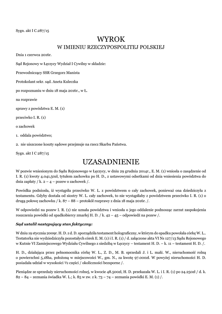 Sygn. akt I C.287/15 WYROK W IMIENIU RZECZYPOSPOLITEJ POLSKIEJ Dnia 1 czerwca 2016r. Sąd Rejonowy w Łęczycy Wydział I Cywilny w składzie: Przewodniczący SSR Grzegorz Manista Protokolant sekr. sąd. Aneta Kuleczka po rozpoznaniu w dniu 18 maja 2016r., w Ł. na rozprawie sprawy z powództwa E. M. (1) przeciwko I. R. (1) o zachowek 1. oddala powództwo; 2. nie uiszczone koszty sądowe przejmuje na rzecz Skarbu Państwa. Sygn. akt I C 287/15 UZASADNIENIE W pozwie wniesionym do Sądu Rejonowego w Łęczycy, w dniu 29 grudnia 2014r., E. M. (1) wniosła o zasądzenie od I. R. (1) kwoty 4.041,50zł, tytułem zachowku po H. D., z ustawowymi odsetkami od dnia wniesienia powództwa do dnia zapłaty / k. 2 – 4 – pozew o zachowek /. Powódka podniosła, iż wystąpiła przeciwko W. L. z powództwem o cały zachowek, ponieważ ona dziedziczyła z testamentu. Gdyby dostała od siostry W. L. cały zachowek, to nie wystąpiłaby z powództwem przeciwko I. R. (1) o drugą połowę zachowku / k. 87 – 88 – protokół rozprawy z dnia 18 maja 2016r. /. W odpowiedzi na pozew I. R. (1) nie uznała powództwa i wniosła o jego oddalenie podnosząc zarzut zaspokojenia roszczenia powódki od spadkobiercy zmarłej H. D. / k. 42 – 45 – odpowiedź na pozew /. Sąd ustalił następujący stan faktyczny: W dniu 19 stycznia 2009r. H. D. z d. D. sporządziła testament holograficzny, w którym do spadku powołała córkę W. L.. Testatorka nie wydziedziczyła pozostałych córek E. M. (1) i I. R. (1) / d. załączone akta VI Ns 127/13 Sądu Rejonowego w Kutnie VI Zamiejscowego Wydziału Cywilnego z siedzibą w Łęczycy – testament H. D. – k. 11 – testament H. D. /. H. D., działająca przez pełnomocnika córkę W. L., Z. D., M. B. sprzedali J. i L. małż. W., nieruchomość rolną o powierzchni 5,18ha, położoną w miejscowości W., gm. N., za kwotę 97.000zł. W powyżej nieruchomości H. D. posiadała udział w wysokości ½ części / okoliczności bezsporne /. Pieniądze ze sprzedaży nieruchomości rolnej, w kwocie 48.500zł, H. D. przekazała W. L. i I. R. (1) po 24.250zł / d. k. 82 – 84 – zeznania świadka W. L.; k. 85 w zw. z k. 73 – 74 – zeznania powódki E. M. (1) /. E. M. (1) nie otrzymała od matki żadnych pieniędzy z tytułu sprzedanej przez nią nieruchomości rolnej położonej w miejscowości W., gm. N. / okoliczności bezsporne /. Spadek po H. D. z d. D., zmarłej 8 maja 2012r., w K., ostatnio stale zamieszkałej w miejscowości G., gm. N., na zasadach ogólnych, na podstawie testamentu własnoręcznego z dnia 19 stycznia 2009r., nabyła w całości córka W. L. z d. D. /d. załączone akta VI Ns 127/13 Sądu Rejonowego w Kutnie VI Zamiejscowego Wydziału Cywilnego z siedzibą w Łęczycy – k. 17 – postanowienie z dnia 4 kwietnia 2013r. /. Spadkodawczyni posiadała trzy córki E. M. (1), W. L., I. R. (1) / okoliczności bezsporne /. W skład spadku po H. D. wchodzą pieniądze ze sprzedaży nieruchomości położonej w miejscowości W., gm. N., którą to nieruchomość testatorka przekazała córce W. L. / okoliczność bezsporna /. E. M. (1) wystąpiła z powództwem o zachowek przeciwko spadkobierczyni W. L. żądając zasądzenia z tego tytułu kwoty 15.000zł. Wyrokiem z dnia 16 kwietnia 2014r., sygn. akt VI C 481/13, Sąd Rejonowy w Kutnie VI Zamiejscowy Wydział Cywilny z siedzibą w Łęczycy, zasądził od W. L. na rzecz E. M. (1) kwotę 4.041,50zł tytułem zachowku po H. D. i oddalił powództwo w pozostałym zakresie. E. M. (1) nie wniosła apelacji od powyższego wyroku / d. załączone akta VI C 481/13 Sądu Rejonowego w Kutnie VI Zamiejscowego Wydziału Cywilnego z siedzibą w Łęczycy; okoliczności bezsporne /. Powyższy stan faktyczny Sąd ustalił na podstawie powołanego powyżej materiału dowodowego w postaci dowodów z dokumentów, zeznań świadka W. L. / k. 82 – 84 /, powódki E. M. (1) / k. k. 85 w zw. z k. 73 – 74 / oraz dowodów z dokumentów. Sąd uznał za wiarygodne zeznania świadków A. M. / k. 76 – 77 /, W. S. / k. 77 /, J. W. / k. 78 /, W. L. / k. 82 – 84 / oraz powódki E. M. (2) / k. 85 w zw. z k. 73 – 74 /, albowiem zeznania te są logiczne, konsekwentne, spójne, wzajemnie się uzupełniają i potwierdzają, a nadto dotyczą one okoliczności bezspornych między stronami postępowania. Sąd nie dał wiary zeznaniom świadka J. R. / k.84 / i pozwanej I. R. (1) / k. 85 w zw. z k. 74 – 75 /, jedynie w tej części, w której pozwana i jej mąż podnosili, iż I. R. (1) otrzymała od swojej matki H. D. kwotę 20.000zł, gdyż pozostają one w sprzeczności z wiarygodnymi zeznaniami świadka W. L. i powódki E. M. (1), z których wynika, iż otrzymała ona kwotę 24.250zł. Podkreślić należy, iż powyższa okoliczność nie ma istotnego znaczenia dla rozstrzygnięcia przedmiotowego postępowania, mając na uwadze oświadczenie powódki złożone na rozprawie w dniu 18 maja 2016r. / k. 87 – 88 /, w którym uzasadniła powództwo skierowane przeciwko I. R. (1). W pozostałym zakresie Sąd uznał za wiarygodne zeznania pozwanej i świadka J. R., gdyż znajdują swoje potwierdzenie w pozostałym wiarygodnym materiale dowodowym. Sąd uznał za wiarygodne dowody z dokumentów zgromadzone w aktach sprawy, gdyż w ocenie Sądu, w toku postępowania nie ujawniła się żadna okoliczność, która podważyłaby wiarygodność tych dowodów. Sąd zważył, co następuje: Powództwo jest niezasadne i podlega oddaleniu. Zgodnie z art. 991§1 k.c. zstępnym, małżonkowi oraz rodzicom spadkodawcy, którzy byliby powołani do spadku z ustawy, należą się, jeżeli uprawniony jest trwale niezdolny do pracy albo, jeżeli zstępny jest małoletni - dwie trzecie wartości udziału spadkowego, który by mu przypadał przy dziedziczeniu ustawowym, w innych zaś wypadkach połowa wartości tego udziału / zachowek /. Jeżeli uprawniony nie otrzymał należnego mu zachowku bądź w postaci uczynionej przez spadkodawcę darowizny, b