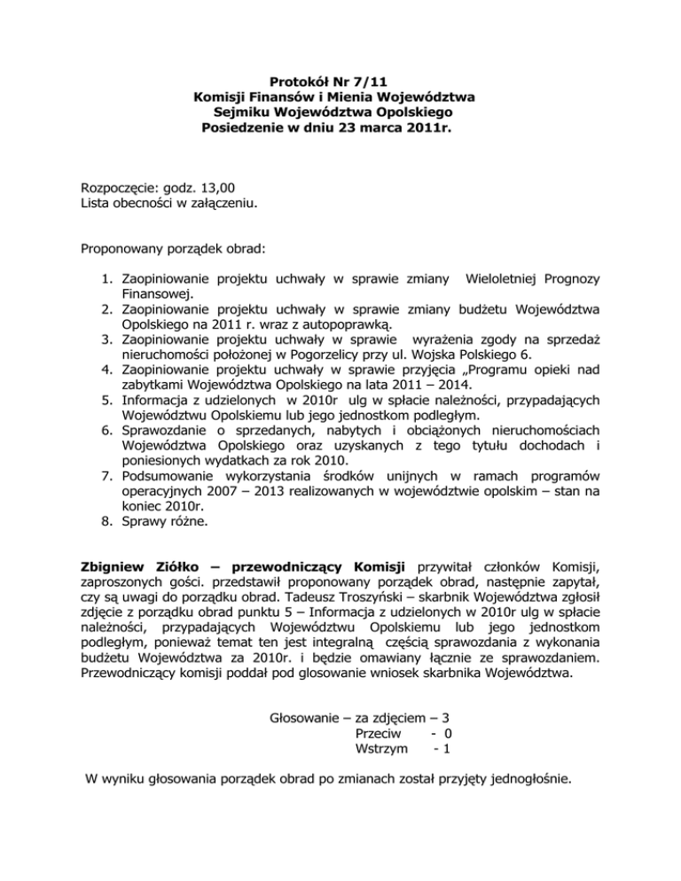 Protokół Nr 7/11 Komisji Finansów i Mienia Województwa Sejmiku Województwa Opolskiego Posiedzenie w dniu 23 marca 2011r. Rozpoczęcie: godz. 13,00 Lista obecności w załączeniu. Proponowany porządek obrad: 1. Zaopiniowanie projektu uchwały w sprawie zmiany Wieloletniej Prognozy Finansowej. 2. Zaopiniowanie projektu uchwały w sprawie zmiany budŜetu Województwa Opolskiego na 2011 r. wraz z autopoprawką. 3. Zaopiniowanie projektu uchwały w sprawie wyraŜenia zgody na sprzedaŜ nieruchomości połoŜonej w Pogorzelicy przy ul. Wojska Polskiego 6. 4. Zaopiniowanie projektu uchwały w sprawie przyjęcia „Programu opieki nad zabytkami Województwa Opolskiego na lata 2011 – 2014. 5. Informacja z udzielonych w 2010r ulg w spłacie naleŜności, przypadających Województwu Opolskiemu lub jego jednostkom podległym. 6. Sprawozdanie o sprzedanych, nabytych i obciąŜonych nieruchomościach Województwa Opolskiego oraz uzyskanych z tego tytułu dochodach i poniesionych wydatkach za rok 2010. 7. Podsumowanie wykorzystania środków unijnych w ramach programów operacyjnych 2007 – 2013 realizowanych w województwie opolskim – stan na koniec 2010r. 8. Sprawy róŜne. Zbigniew Ziółko – przewodniczący Komisji przywitał członków Komisji, zaproszonych gości. przedstawił proponowany porządek obrad, następnie zapytał, czy są uwagi do porządku obrad. Tadeusz Troszyński – skarbnik Województwa zgłosił zdjęcie z porządku obrad punktu 5 – Informacja z udzielonych w 2010r ulg w spłacie naleŜności, przypadających Województwu Opolskiemu lub jego jednostkom podległym, poniewaŜ temat ten jest integralną częścią sprawozdania z wykonania budŜetu Województwa za 2010r. i będzie omawiany łącznie ze sprawozdaniem. Przewodniczący komisji poddał pod glosowanie wniosek skarbnika Województwa. Głosowanie – za zdjęciem – 3 Przeciw - 0 Wstrzym -1 W wyniku głosowania porządek obrad po zmianach został przyjęty jednogłośnie. Przewodniczący Komisji poprosił o omówienie punktu 1 – zmiany Wieloletniej Prognozy Finansowej i zaproponował, aby omawiać go jak dotychczas łącznie z punktem 2 porządku obrad. Propozycja została przyjęta. Tadeusz Troszyński – skarbnik Województwa powiedział, Ŝe projektu uchwał naleŜy rozpatrywać w kontekście zmieniających się wskaźników. Zwiększa się dochody, nie zwiększając długu. 800 tyś zł , które wpływa na zwiększenie dochodów poprawia wskaźnik zadłuŜenia z 51,3 na 51,2, tj o 1/10. Wskaźniki, które będą obowiązywały w 2014 r w niewielkim stopniu ulegają pogorszeniu z powodu, Ŝe zmniejsza się nadwyŜka, zwiększają się wydatki. Zmiany wynikają równieŜ z faktu, Ŝe niektórych zmian dokonuje Zarząd , ok. 400 tyś. na doradztwo metodyczne, przy czym Zarząd nie zmienił wieloletniej prognozy. Uchwałą Sejmikową wprowadza się dochody, które wprowadził Zarząd. Do zmian w budŜecie wprowadza się autopoprawkę, polegającą na przesunięciu między działami planu wydatków na zadania własne z zakresu promocji Województwa, dotyczące zadań w zakresie kultury fizycznej, na dofinansowanie zadań zleconych do realizacji organizacjom pozarządowym. Następnie szczegółowo omówił proponowane zmiany w budŜecie, gdzie zwiększa się plan dochodów na zadania własne o kwotę 428 946 zł, zwiększa się plan wydatków na zadania własne o kwotę 5 428 945 zł, zwiększa się wydatki na pozostałe zadania własne o kwotę 5 237 245 zł, zwiększa się deficyt budŜetu o kwotę 5 ooo ooo zl do kwoty 38 820 463 zł, który zostanie sfinansowany przychodami z tytułu wolnych środków w kwocie 20 003 235 zl oraz sprzedaŜą obligacji w kwocie 18 817 228 zł. Zwiększa się przychody budŜetu o kwotę 5 000 000 zł. Jerzy Czerwiński – członek Komisji odniósł się do wieloletniej prognozy i zapytał, czy nie ma obaw, Ŝe róŜnica we wskaźnikach tzw. prawa strona maleje w 2014 r, a strona lewa, która musi być mniejsza, róŜnica obecnie wynosi 1/10%, moŜe mieć wpływ na to, Ŝe RIO to zakwestionuje. Tadeusz Troszyński – skarbnik Województwa powiedział, Ŝe na dzisiaj takich obaw nie ma. Wskaźnik musi być uzyskany z trzech średnich lat w 2014r. Przy planowaniu budŜetu na 2012 rok, uwzględnione będzie wykonanie 2011r. Jerzy Czerwiński – członek Komisji powiedział, Ŝe moŜe się zdarzyć taka sytuacja, Ŝe w 2014 roku nie będzie Ŝadnych podwyŜek, będą tylko cięcia. Tadeusz Troszyński – skarbnik Województwa powiedział, Ŝe kaŜdą nową decyzję trzeba będzie „liczyć”, i analizować, moŜe się budŜet zwiększyć np. środki na Cisek, a po sprzedaŜy mieszkań, kwoty uzyskane ze sprzedaŜy wejdą w licznik, a to poprawia wskaźnik. Jerzy Czerwiński – członek Komisji poruszył kwestię przesunięć między działami w kwestii środków w Polityce społecznej i zapytał czy jest aŜ tak źle. Stanisław Mazur – dyr. DF powiedział, Ŝe dzieje się to w ramach tego samego Programu KL, który jest realizowany wg klasyfikacji budŜetowej i realizacja tych projektów idzie sprawniej w danej klasyfikacji w innej mniej. Z powodu przyśpieszenia nie są zwiększane środki, stąd konieczne przesunięcia. Jerzy Czerwiński – członek Komisji zapytał o wykup działek pod inwestycje drogowe, droga Smolarnia – Krobusz idzie tym samym śladem, zapytał co tam jest kupowane. 310 działek, przy remoncie drogi jest to nie uzasadnione. Józef Kotyś – członek Komisji wyjaśnił, Ŝe ze środków unijnych nie moŜna przeprowadzać remontów dróg, jedynie ich modernizację, co ma wpływ na parametry drogi, pas drogowy teŜ musi ulec zwiększeniu i to jest prawdopodobna przyczyna. Edward Cybulka - wiceprzewodniczący Komisji powiedział, Ŝe jest to porządkowanie stanu prawnego gruntów. Często przy drogach są skrawki gruntów, których właścicielami są prywatne osoby. Jerzy Czerwiński – członek Komisji powrócił do sprawy zwrotu kwoty 3 