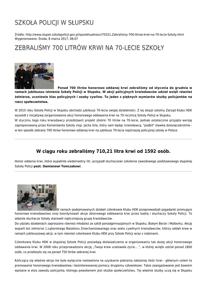 SZKOŁA POLICJI W SŁUPSKU Źródło: http://www.slupsk.szkolapolicji.gov.pl/sps/aktualnosci/70321,Zebralismy-700-litrow-krwi-na-70-lecie-Szkoly.html Wygenerowano: Środa, 8 marca 2017, 06:07 ZEBRALIŚMY 700 LITRÓW KRWI NA 70-LECIE SZKOŁY Ponad 700 litrów honorowo oddanej krwi zebraliśmy od stycznia do grudnia w ramach jubileuszu istnienia Szkoły Policji w Słupsku. W akcji policyjnych krwiodawców udział wzięli również żołnierze, uczniowie klas policyjnych i osoby cywilne. To jeden z pięknych wymiarów służby policjantów na rzecz społeczeństwa. W 2015 roku Szkoła Policji w Słupsku obchodzi jubileusz 70-lecia swojej działalności. Z tej okazji szkolny Zarząd Klubu HDK wyszedł z inicjatywą zorganizowania akcji honorowego oddawania krwi na 70 rocznicę Szkoły Policji w Słupsku. W styczniu tego roku krwiodawcy przedstawili projekt zbiórki 70 litrów na 70-lecie, jednak ostatecznie przyjęto wersję zaproponowaną przez Komendanta Szkoły insp. Jacka Gila, który sam będąc krwiodawcą, "podbił" stawkę dziesięciokrotnie w ten sposób zebrano 700 litrów honorowo oddanej krwi na jubileusz 70-lecia najstraszej policyjnej szkoły w Polsce. W ciągu roku zebraliśmy 710,21 litra krwi od 1592 osób. Honor oddania krwi, która wypełniła siedemsetny litr, przypadł słuchaczowi szkolenia zawodowego podstawowego słupskiej Szkoły Policji post. Damianowi Tomczakowi. W ramach podejmowanych działań członkowie Klubu HDK przeprowadzali pogadanki promujące honorowe krwiodawstwo oraz koordynowali akcje zbiorowego oddawania krwi przez kadrę i słuchaczy Szkoły Policji. To właśnie słuchacze Szkoły stanowili najliczniejszą grupę krwiodawców. Do udziału działaniach zaproszono również młodzież ze szkół ponadgimnazjalnych w Słupsku, Białym Borze i Malborku. Akcję wsparli też żołnierze 1.Lęborskiego Batalionu Zmechanizowanego oraz wielu cywilnych krwiodawców, którzy oddali krew w ramach jubileuszowej akcji, w tym również członkowie Klubu HDK przy Szkole Policji wraz z rodzinami. Członkowie Klubu HDK w słupskiej Szkole Policji posiadają doświadczenie w organizowaniu tak dużej akcji honorowego oddawania krwi. W 2008 roku przeprowadzono akcję „Twoja krew uratowała życie… ”, w której wzięło udział ponad 1800 osób, co przełożyło się na ponad 750 litrów zebranej krwi. Kończąca się właśnie akcja nie była wyłącznie nastawiona na uzyskanie pobrania założonej ilości krwi - głównym celem to promowanie honorowego krwiodawstwa i bezinteresownej pomocy drugiemu człowiekowi. Takie zaangażowanie jest bowiem wpisane w etos zawodu policjanta, którego powołaniem jest służba społeczeństwu. Tej właśnie służby uczą się w Słupsku kolejne pokolenia młodych policjantów już 70 lat. (28.12.2015) Ocena: 0/5 (0) Tweetnij