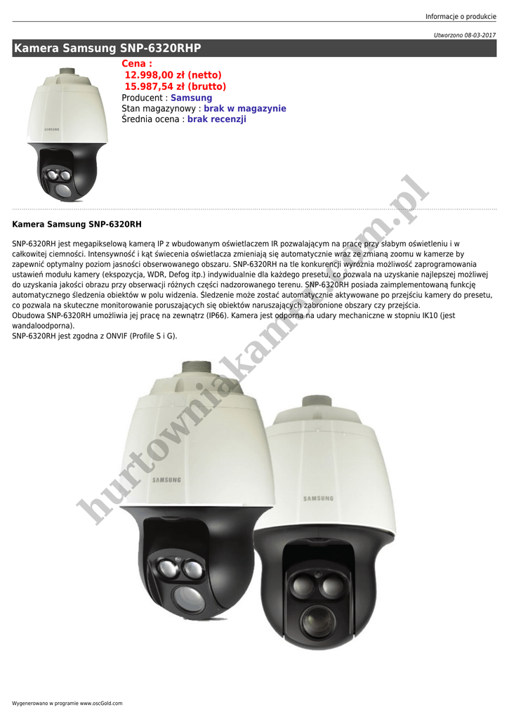 Informacje o produkcie Utworzono 08-03-2017 Kamera Samsung SNP-6320RHP Cena : 12.998,00 zł (netto) 15.987,54 zł (brutto) .p l Producent : Samsung Stan magazynowy : brak w magazynie Średnia ocena : brak recenzji er .c om Kamera Samsung SNP-6320RH hu rt ow ni ak am SNP-6320RH jest megapikselową kamerą IP z wbudowanym oświetlaczem IR pozwalającym na pracę przy słabym oświetleniu i w całkowitej ciemności. Intensywność i kąt świecenia oświetlacza zmieniają się automatycznie wraz ze zmianą zoomu w kamerze by zapewnić optymalny poziom jasności obserwowanego obszaru. SNP-6320RH na tle konkurencji wyróżnia możliwość zaprogramowania ustawień modułu kamery (ekspozycja, WDR, Defog itp.) indywidualnie dla każdego presetu, co pozwala na uzyskanie najlepszej możliwej do uzyskania jakości obrazu przy obserwacji różnych części nadzorowanego terenu. SNP-6320RH posiada zaimplementowaną funkcję automatycznego śledzenia obiektów w polu widzenia. Śledzenie może zostać automatycznie aktywowane po przejściu kamery do presetu, co pozwala na skuteczne monitorowanie poruszających się obiektów naruszających zabronione obszary czy przejścia. Obudowa SNP-6320RH umożliwia jej pracę na zewnątrz (IP66). Kamera jest odporna na udary mechaniczne w stopniu IK10 (jest wandaloodporna). SNP-6320RH jest zgodna z ONVIF (Profile S i G). Wygenerowano w programie www.oscGold.com Podstawowe właściwości: ● ● ● ● ● ● ni ak am er .c om .p l ● Maksymalna rozdzielczość. 2M (1920 x 1080) Wbudowany 32x optyczny zoom (4.4 ~ 140.8mm) 16x cyfrowy zoom Kolor : 0.3Lux (1/30sec, F1.6, 50IRE); B/W : 0.03Lux (1/30sec, F1.6, 50IRE) H.264, MJPEG kodek Tryb dzień & noc (ICR), WDR (120dB) karta pamięci SD, Dwukierunkowe audio IP66, IK10 ow Specyfikacja: Przetwornik 1/2,9 " (CMOS) Czułość Czułość cz-b hu Obiektyw w komplecie Filtr mechaniczny rt Tryb Dzień/Noc 0,3 Lux (1/30s, F1.6, 50IRE) + 4,4..140,8 mm Regulacja ostrości Automatyczna, ręczna, półautomatyczna (po komendach PTZ) AGC Tak Prędkość elektronicznej migawki ELC 2..1/12 000 s WDR - Szeroki zakres dynamiki Tak (120dB), również cyfrowy WDR - SSDR oraz BLC i HLC Redukcja szumów Tak (3D, SSNRIII) Zakres regulacji położenia kamery n x 360 / -5..185 ° (pan/tilt) Presety 255 Liczba tur presetów 6 Liczba tras naśladowczych 1 Prędkość ruchu pan 0..120 °/s (250 st./s do presetu) Prędkość ruchu tilt 0..120 °/s Kompresja wizji H.264/MJPEG Maksymalna rozdzielczość obrazu 1920x1080 pikseli Maksymalna liczba transmitowanych obrazów 60 kl./s (H.264), przy MJPEG: 15kl./s Inne obsługiwane rozdzielczości 1280x1024, 1280x960, 1280x720, 1024x768, 800x600, 800x450, 720x576, 640x480, 640x360, 320x240, 320x180 pikseli Informacje o produkcie 15 (10 profili strumieni video) Detekcja sabotażu Tak Detekcja ruchu Tak Tor audio Tak (dwukierunkowy - G.711/G.726: G.711 8kHz, G.726 8kHz: 16/24/32/40kbps) Wbudowany mikrofon/głośnik Nie/Nie (wejście audio: liniowe/mikrofonowe, wyjście audio: liniowe 1Vrms) Analiza video Tak (przekroczenie linii, wejście/wyjście z obszaru, pojawienie się/zniknięcie obiektu, detekcja poziomu sygnału audio, detekcja twarzy) Rejestracja na kartę pamięci Tak (uSD/SDHC/SDXC do 128GB) Wejścia alarmowe 4 szt. (NO/NC) Wyjścia alarmowe 3 szt. (przekaźnikowe) Interfejs Ethernet 10/100 Mbps Odporność obudowy na uderzenia IK10 Stopień ochrony IP66 Inne Mask , elektroniczna stabilizacja obrazu, wyjście 1Vpp/75Ohm, RS485 (Samsung-T/E, Pelco-D/P), autotracking (śledzenie obiektów), powiadamianie przez e-mail, wysyłanie pliku na FTP Zasilanie AC 24 V Zasilanie PoE Nie Pobór mocy 90 W Waga 7,1 kg Temperatura pracy -50...55 °C Wymiary ∅ 248x400 mm hu rt ow ni ak am er .c om .p l Liczba jednoczesnych strumieni IP Wygenerowano w programie www.oscGold.com .p l er .c om ni ak am ow rt hu