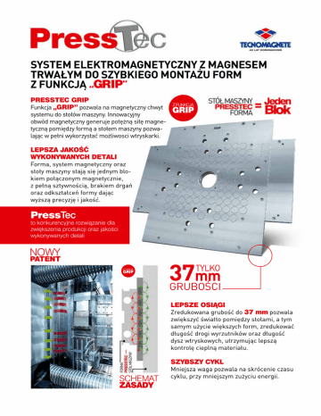 System elektromagnetyczny z magnesem trwałym do Szybkiego Montażu Form Z FUNKCJĄ GRIP” “ PressTec Grip Funkcja „GRIP” pozwala na magnetyczny chwyt systemu do stołów maszyny. Innowacyjny obwód magnetyczny generuje potężną siłę magnetyczną pomiędzy formą a stołem maszyny pozwalając w pełni wykorzystać możliwosci wtryskarki. Lepsza jakość wykonywanych detali Forma, system magnetyczny oraz stoły maszyny stają się jednym blokiem połączonym magnetycznie, z pełną sztywnością, brakiem drgań oraz odkształceń formy dając wyższą precyzję i jakość. PressTec to konkurencyjne rozwiązanie dla zwiększenia produkcji oraz jakości wykonywanych detali Lepsze osiągi Zredukowana grubość do 37 mm pozwala zwiększyć światło pomiędzy stołami, a tym samym użycie większych form, zredukować długość drogi wyrzutników oraz długość dysz wtryskowych, utrzymując lepszą kontrolę cieplną materiału. Szybszy cykl Mniejsza waga pozwala na skrócenie czasu cyklu, przy mniejszym zużyciu energii. Rewolucyjny system dla wszystkich maszyn do formowania wtryskowego Elastyczność Formy o różnych rozmiarach i masach mogą być montowane bez żadnej trudności. Szybkość Montaż oraz demontaż formy zajmuje kilka minut, znacząco zwiekszając wydajność maszyny. Moc Opatentowany obwód magnetyczny pozwala zwiększyć koncentrację siły mocującej. Każde pole magnetyczne N/S generuje 640 daN siły mocującej co odpowiada do 90 Ton/m2 powierzchni styku z formą. System “GRIP” generuje stałą siłę w odniesieniu do stołów maszyny, odpowiadającej nawet do 45% całkowitej sile systemu. Bezpieczeństwo Brak zużycia energi podczas cyklu produkcyjnego. Pole magnetyczne wytwarzane jest jedynie przez silne magnesy trwałe. Brak zakłóceń Dwukierunkowy obwód systemu zapobiega rozproszeniu pola magnetycznego oraz interferencją na komponenty maszyny. Niezawodność Monolityczna konstrukcja oraz całkowicie stalowa powierzchnia zmniejsza ryzyko uszkodzeń, a tym samym konieczność serwisu. Łatwa instalacja Tylko kilka śrub zabezpieczających jest niezbędnych do montażu płyt magnetycznych na stołach maszyny. Łatwe połączenie z maszyną zapewnia bezpieczeństwo dzięki standardom EUROMAP/SPI/JIS. Ergonomia Dzięki łatwemu w obsłudze interfejsowi wystarczy jedna osoba aby dokonać wymiany formy. KONTAKT ul. Naramowicka 45/18 61-622 Poznań tel./fax +48 61 826 62 58 e-mail: [email protected] web: www.emplast.pl