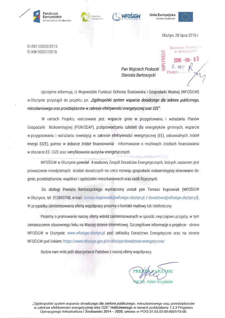 / Fu ndusze Europejskie Infr.5truktura i SrodowlSko Unia Europejska OtrJdllwa '1tl l1 lO Fundusz Sp6jnosci Olsztyn, 28 lipca 2016 r EI,097-00022/2015 EI,KW-00057/2016 SldlU:' \NU o.-,J W LJ.J' ~ S 1t.'I,lL HI X 2016 -08- 03 z Pan Wojciech Prokocki Starosta Bartoszycki I Hanoc: \,c !:l cJ ' Pu 4<3 C P IS ' Uprzejmie informujE;, iz Wojew6dzki Fundusz Ochrony Srodowiska i Gospodarki Wodnej (WFOSiGW) w Olsztynie przystqpil do projektu pn, .Og6/nopo/ski system wsparcia doradczego d/a sektora publicznego, mieszkaniowego oraz przedsi~biorstw wzakresie efektywnosci energetycznej oraz Ole W ramach Projektu realizowane jest: wsparcie gmin w przygotowaniu i wdrazaniu Plan6w Gospodarki Niskoemisyjnej (PGN/SEAP), przeprowadzaniu szkolen dla energetyk6w gminnych, wsparcie w przygotowaniu i wdrazaniu inwestycji w zakresie efektywnosci energetycznej (EE), odnawialnych tr6del energii (OZE), pomoc w doborze tr6del finansowania - informowanie 0 mozliwych tr6dlach finansowania w obszarze EE i OZE oraz weryfikowanie audyt6w energetycznych WFOSiGW w Olsztynie powolal 4-osobowy Zesp61 Doradc6w Energetycznych, kt6rych zadaniem jest prowadzenie nieodplatnych dzialan doradczych na rzecz rozwoju gospodarki nislkoemisyjnej skierowane do: gmin, przedsiE;biorstw, wsp6 'not i sp61dzielni mieszkaniowych oraz os6b fizycznych, Do obslugi Powiatu Bartoszyckiego wyznaczony zostal pan Tomasz Koprowiak (WFOSiGW w Olsztynie, tel. 512843768, e-mail: [email protected] / [email protected] .pl). Wprzypadku zainteresowania ofertq wsp61pracy prosimy 0 kontakt mallowy lub telefoniczny, Prosimy 0 promowani'e naszej oferty wsr6d zainteresowanych w spos6b zwyczajowo przyjE;ty, w tym zamieszczenie stosownego linku na Waszej stronie internetowej, Szczeg610we informacje 0 projekcie - strona WFOSiGW w Olsztynie: www.wfosigw ,olsztyn,pl pod zakladkq Doradztwo Energetyczne oraz na stronie NFOSiGW pod linkiem: https://www.nfosigwgov.pl/o-nfosigw/doradztwo-energetyczne/ BE;dzie nam milo jesli skorzystacie Panstwo z naszej oferty wsp6lpracy, "Ogo/nopo/ski system wsparcia doradczego d/a sektora pub/icznego, mieszkaniowego oraz przedsil?biorstw w zakresie efektywnosci energetycznej oraz OZE" realizowanego w ramach poddzialania 1.3,3 Programu Operacyjnego /nfrastruktura i 5rodowisko 2014 - 2020, umowa nr PO/S, 01.03. 03-00-0001115-00. '
