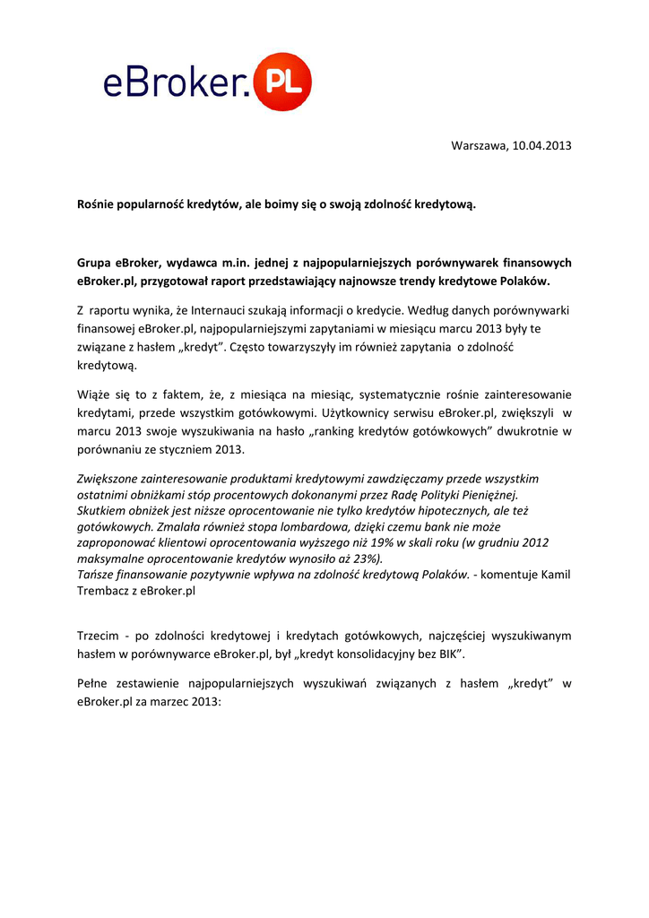 Warszawa, 10.04.2013 Rośnie popularność kredytów, ale boimy się o swoją zdolność kredytową. Grupa eBroker, wydawca m.in. jednej z najpopularniejszych porównywarek finansowych eBroker.pl, przygotował raport przedstawiający najnowsze trendy kredytowe Polaków. Z raportu wynika, że Internauci szukają informacji o kredycie. Według danych porównywarki finansowej eBroker.pl, najpopularniejszymi zapytaniami w miesiącu marcu 2013 były te związane z hasłem „kredyt”. Często towarzyszyły im również zapytania o zdolność kredytową. Wiąże się to z faktem, że, z miesiąca na miesiąc, systematycznie rośnie zainteresowanie kredytami, przede wszystkim gotówkowymi. Użytkownicy serwisu eBroker.pl, zwiększyli w marcu 2013 swoje wyszukiwania na hasło „ranking kredytów gotówkowych” dwukrotnie w porównaniu ze styczniem 2013. Zwiększone zainteresowanie produktami kredytowymi zawdzięczamy przede wszystkim ostatnimi obniżkami stóp procentowych dokonanymi przez Radę Polityki Pieniężnej. Skutkiem obniżek jest niższe oprocentowanie nie tylko kredytów hipotecznych, ale też gotówkowych. Zmalała również stopa lombardowa, dzięki czemu bank nie może zaproponować klientowi oprocentowania wyższego niż 19% w skali roku (w grudniu 2012 maksymalne oprocentowanie kredytów wynosiło aż 23%). Tańsze finansowanie pozytywnie wpływa na zdolność kredytową Polaków. - komentuje Kamil Trembacz z eBroker.pl Trzecim - po zdolności kredytowej i kredytach gotówkowych, najczęściej wyszukiwanym hasłem w porównywarce eBroker.pl, był „kredyt konsolidacyjny bez BIK”. Pełne zestawienie najpopularniejszych wyszukiwań związanych z hasłem „kredyt” w eBroker.pl za marzec 2013: zapytanie "kalkulator zdolności kredytowej zdolność kredytowa "LUB "zdolność kredytowa" "kredyt konsolidacyjny bez bik" "ranking kredytów gotówkowych" "kredyt firmowy" "porównywarka kredytów" "kredyty konsolidacyjne" inne % z sumy zapytań dot. kredytów 21,52 16,56 16,56 13,25 13,25 8,28 10,60 Próba: Marzec 2013: 48 857 unikalnych użytkowników Luty 2013: 40 835 unikalnych użytkowników Styczeń 2013: 40 858 unikalnych użytkowników Więcej informacji udzieli: Kinga Nurska [email protected] [email protected] tel. +48 22 465 96 00