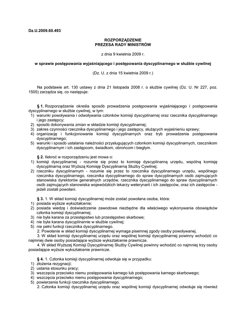 Dz.U.2009.60.493 ROZPORZĄDZENIE PREZESA RADY MINISTRÓW z dnia 9 kwietnia 2009 r. w sprawie postępowania wyjaśniającego i postępowania dyscyplinarnego w służbie cywilnej (Dz. U. z dnia 15 kwietnia 2009 r.) Na podstawie art. 130 ustawy z dnia 21 listopada 2008 r. o służbie cywilnej (Dz. U. Nr 227, poz. 1505) zarządza się, co następuje: § 1. Rozporządzenie określa sposób prowadzenia postępowania wyjaśniającego i postępowania dyscyplinarnego w służbie cywilnej, w tym: 1) warunki powoływania i odwoływania członków komisji dyscyplinarnej oraz rzecznika dyscyplinarnego i jego zastępcy; 2) sposób dokonywania zmian w składzie komisji dyscyplinarnej; 3) zakres czynności rzecznika dyscyplinarnego i jego zastępcy, służących wyjaśnieniu sprawy; 4) organizację i funkcjonowanie komisji dyscyplinarnych oraz tryb prowadzenia postępowania dyscyplinarnego; 5) warunki i sposób ustalania należności przysługujących członkom komisji dyscyplinarnych, rzecznikom dyscyplinarnym i ich zastępcom, świadkom, obrońcom i biegłym. § 2. Ilekroć w rozporządzeniu jest mowa o: 1) komisji dyscyplinarnej - rozumie się przez to komisję dyscyplinarną urzędu, wspólną komisję dyscyplinarną oraz Wyższą Komisję Dyscyplinarną Służby Cywilnej; 2) rzeczniku dyscyplinarnym - rozumie się przez to rzecznika dyscyplinarnego urzędu, wspólnego rzecznika dyscyplinarnego, rzecznika dyscyplinarnego do spraw dyscyplinarnych osób zajmujących stanowiska dyrektorów generalnych urzędów, rzecznika dyscyplinarnego do spraw dyscyplinarnych osób zajmujących stanowiska wojewódzkich lekarzy weterynarii i ich zastępców, oraz ich zastępców jeżeli zostali powołani. § 3. 1. W skład komisji dyscyplinarnej może zostać powołana osoba, która: 1) posiada wyższe wykształcenie; 2) posiada wiedzę i doświadczenie zawodowe niezbędne dla właściwego wykonywania obowiązków członka komisji dyscyplinarnej; 3) nie była karana za przestępstwo lub przestępstwo skarbowe; 4) nie była karana dyscyplinarnie w służbie cywilnej; 5) nie pełni funkcji rzecznika dyscyplinarnego. 2. Powołanie w skład komisji dyscyplinarnej wymaga pisemnej zgody osoby powoływanej. 3. W skład komisji dyscyplinarnej urzędu oraz wspólnej komisji dyscyplinarnej powinny wchodzić co najmniej dwie osoby posiadające wyższe wykształcenie prawnicze. 4. W skład Wyższej Komisji Dyscyplinarnej Służby Cywilnej powinny wchodzić co najmniej trzy osoby posiadające wyższe wykształcenie prawnicze. 1) 2) 3) 4) 5) § 4. 1. Członka komisji dyscyplinarnej odwołuje się w przypadku: złożenia rezygnacji; ustania stosunku pracy; wszczęcia przeciwko niemu postępowania karnego lub postępowania karnego skarbowego; wszczęcia przeciwko niemu postępowania dyscyplinarnego; powierzenia funkcji rzecznika dyscyplinarnego. 2. Członka komisji dyscyplinarnej urzędu oraz wspólnej komisji dyscyplinarnej odwołuje się również w przypadku powołania w skład Wyższej Komisji Dyscyplinarnej Służby Cywilnej. 3. Członka komisji dyscyplinarnej można odwołać w szczególnie uzasadnionych przypadkach, w tym w przypadku: 1) niewykonywania przez niego obowiązków członka komisji dyscyplinarnej; 2) niedbałego wykonywania obowiązków członka komisji dyscyplinarnej; 3) zachowania uchybiającego godności członka komisji dyscyplinarnej. § 5. 1. W przypadku odwołania członka komisji dyscyplinarnej przed upływem kadencji osoba uprawniona do powołania komisji dyscyplinarnej powołuje w jej skład osobę spełniającą warunki określone w § 3. 2. Członek komisji dyscyplinarnej powołany w skład komisji dyscyplinarnej w trybie określonym w ust. 1 pełni swoją funkcję do końca kadencji komisji dyscyplinarnej. § 6. 1. Rzecznika dyscyplinarnego powołuje się spośród osób, które: 1) posiadają wyższe wykształcenie; 2) posiadają wiedzę i doświadczenie zawodowe niezbędne dla właściwego wykonywania obowiązków rzecznika dyscyplinarnego; 3) nie były karane za przestępstwo lub przestępstwo skarbowe; 4) nie były karane dyscyplinarnie w służbie cywilnej. 2. Powierzenie funkcji rzecznika dyscyplinarnego wymaga pisemnej zgody osoby powoływanej. § 7. 1. Rzecznika dyscyplinarnego można odwołać w każdym czasie. 2. Rzecznika dyscyplinarnego odwołuje się w przypadku: 1) złożenia rezygnacji; 2) ustania stosunku pracy; 3) wszczęcia przeciwko niemu postępowania karnego lub postępowania karnego skarbowego; 4) powołania w skład komisji dyscyplinarnej. 3. Rzecznik dyscyplinarny podlega wyłączeniu od udziału w sprawie, jeżeli: 1) sprawa dotyczy go bezpośrednio, jego małżonka, krewnego lub powinowatego w linii prostej albo osoby pozostającej z nim w stosunku przysposobienia; 2) złożył pisemny wniosek o wyłączenie go od udziału w sprawie. 4. Rzecznik dyscyplinarny może zostać wyłączony od udziału w sprawie, jeżeli zostanie uprawdopodobnione istnienie między nim a obwinionym lub jego obrońcą okoliczności niewymienionych w ust. 3, które mogą wywołać wątpliwości co do jego bezstronności. 5. O wyłączeniu rzecznika dyscyplinarnego od udziału w sprawie decyduje osoba powołująca rzecznika dyscyplinarnego. 6. O powołaniu i odwołaniu rzecznika dyscyplinarnego oraz o wyłączeniu rzecznika dyscyplinarnego od udziału w sprawie niezwłocznie informuje się właściwą komisję dyscyplinarną. § 8. 1. W zawiadomieniu o wszczęciu postępowania wyjaśniającego rzecznik dyscyplinarny informuje osobę, której dotyczy postępowanie, o stawianych jej zarzutach oraz o przysługujących jej uprawnieniach. 2. W toku postępowania wyjaśniającego rzecznik dyscyplinarny powinien dążyć do szczegółowego wyjaśnienia sprawy i ustalenia, czy został popełniony czyn stanowiący naruszenie obowiązków członka korpusu służby cywilnej. W tym celu może on odbierać wyjaśnienia od osoby, której dotyczy postępowanie, przesłuchiwać świadków, zasięgać opinii biegłych