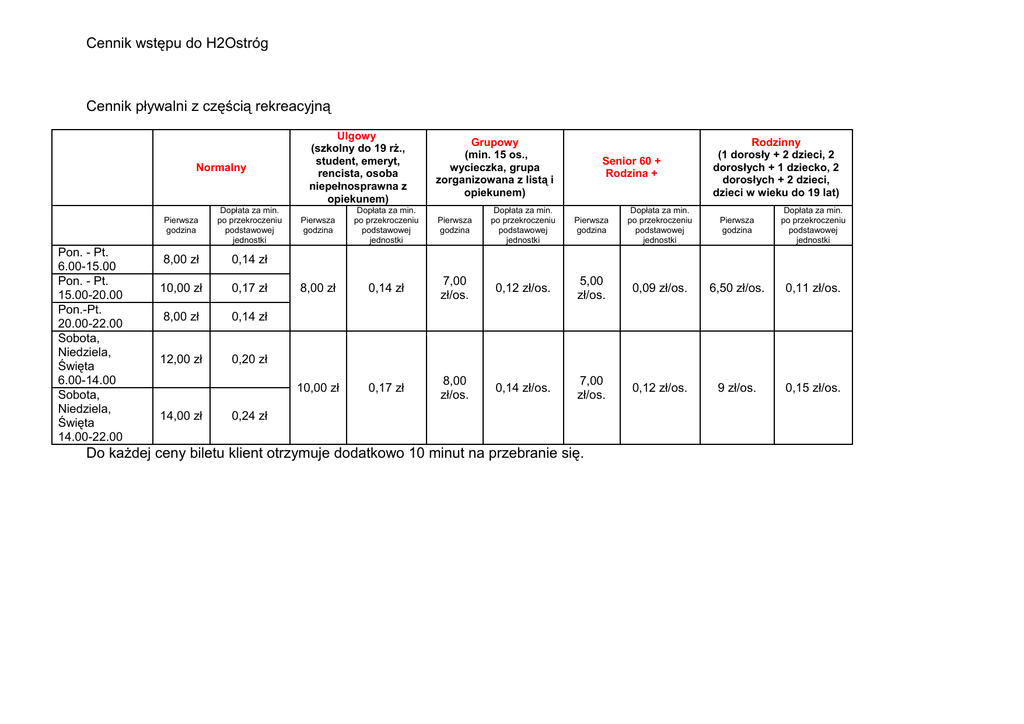 Cennik wstępu do H2Ostróg Cennik pływalni z częścią rekreacyjną Normalny Pon. - Pt. 6.00-15.00 Pon. - Pt. 15.00-20.00 Pon.-Pt. 20.00-22.00 Sobota, Niedziela, Święta 6.00-14.00 Sobota, Niedziela, Święta 14.00-22.00 Pierwsza godzina Dopłata za min. po przekroczeniu podstawowej jednostki 8,00 zł 0,14 zł 10,00 zł 0,17 zł 8,00 zł 0,14 zł 12,00 zł 0,20 zł 14,00 zł Ulgowy (szkolny do 19 rż., student, emeryt, rencista, osoba niepełnosprawna z opiekunem) Grupowy (min. 15 os., wycieczka, grupa zorganizowana z listą i opiekunem) Senior 60 + Rodzina + Rodzinny (1 dorosły + 2 dzieci, 2 dorosłych + 1 dziecko, 2 dorosłych + 2 dzieci, dzieci w wieku do 19 lat) Pierwsza godzina Dopłata za min. po przekroczeniu podstawowej jednostki Pierwsza godzina Dopłata za min. po przekroczeniu podstawowej jednostki Pierwsza godzina Dopłata za min. po przekroczeniu podstawowej jednostki Pierwsza godzina Dopłata za min. po przekroczeniu podstawowej jednostki 8,00 zł 0,14 zł 7,00 zł/os. 0,12 zł/os. 5,00 zł/os. 0,09 zł/os. 6,50 zł/os. 0,11 zł/os. 10,00 zł 0,17 zł 8,00 zł/os. 0,14 zł/os. 7,00 zł/os. 0,12 zł/os. 9 zł/os. 0,15 zł/os. 0,24 zł Do każdej ceny biletu klient otrzymuje dodatkowo 10 minut na przebranie się. Cennik pływalni z częścią rekreacyjną oraz dostępem do SPA Normalny Pon. - Pt. 6.00-15.00 Pon. - Pt. 15.00-20.00 Pon.-Pt. 20.00-22.00 Sobota, Niedziela, Święta 6.00-14.00 Sobota, Niedziela, Święta 14.00-22.00 Pierwsza godzina Dopłata za min. po przekroczeniu podstawowej jednostki 10,00 zł 0,17 zł 12,00 zł 0,20 zł 10,00 zł 0,17 zł 14,50 zł 0,25 zł 17,00 zł Ulgowy (szkolny do 19 rż., student, emeryt, rencista, osoba niepełnosprawna z opiekunem) Grupowy (min. 15 os., wycieczka, grupa zorganizowana z listą i opiekunem) Senior 60+ Rodzina + Rodzinny (1 dorosły + 2 dzieci, 2 dorosłych + 1 dziecko, 2 dorosłych + 2 dzieci, dzieci w wieku do 19 lat) Pierwsza godzina Dopłata za min. po przekroczeniu podstawowej jednostki Pierwsza godzina Dopłata za min. po przekroczeniu podstawowej jednostki Pierwsza godzina Dopłata za min. po przekroczeniu podstawowej jednostki Pierwsza godzina Dopłata za min. po przekroczeniu podstawowej jednostki 10,00 zł 0,17 zł 8,50 zł/os. 0,15 zł/os. 6,00 zł/os. 0,10 zł/os. 8,00 zł/os. 0,14 zł/os. 12,00 zł 0,20 zł 10,00 zł/os. 0,17 zł/os. 8,50 zł/os. 0,15 zł/os. 11,00zł/os. 0,19 zł/os. 0,29 zł Do każdej ceny biletu klient otrzymuje dodatkowo 10 minut na przebranie się. PROMOCJE: 1. Dzieci do lat 3: 1zł/h 2. Bilety wielogodzinne (dla jednej osoby) Cennik pływalni z częścią rekreacyjną Bilet wstępu Poniedziałek - Piątek Normalny (2h) 6.00-22.00 Bilet wstępu 6.00-22.00 Normalny (3h) Pierwsze 2 godziny Dopłata za min. po przekroczeniu podstawowej jednostki Pierwsze 3 godziny Dopłata za min. po przekroczeniu podstawowej jednostki 17,00 zł 0,15 zł 20,00 zł 0,12 zł Normalny (cały dzień) 30,00 zł Ulgowy (2h) Ulgowy (3h) Pierwsze 2 godziny Dopłata za min. po przekroczeniu podstawowej jednostki Pierwsze 3 godziny Dopłata za min. po przekroczeniu podstawowej jednostki 14,00 zł 0,12 zł 16,00 zł 0,09 zł Ulgowy (cały dzień) 24,00 zł Sobota, Niedziela, Święta Normalny (2h) Pierwsze 2 godziny Dopłata za min. po przekroczeniu podstawowej jednostki 24,00 zł 0,2 zł Normalny (3 h) Ulgowy (2h) Pierwsze 3 godziny Dopłata za min. po przekroczeniu podstawowej jednostki Normalny (cały dzień) 28,00 zł 0,16 zł 42,00 zł Ulgowy (3h) Pierwsze 2 godziny Dopłata za min. po przekroczeniu podstawowej jednostki Pierwsze 3 godziny Dopłata za min. po przekroczeniu podstawowej jednostki Ulgowy (cały dzień) 17,00 zł 0,15 zł 20,00 zł 0,12 zł 30,00 zł Cennik pływalni z częścią rekreacyjną oraz dostępem do SPA Bilet wstępu Poniedziałek - Piątek Normalny (2h) 6.00-22.00 Bilet wstępu 6.00-22.00 Normalny (3h) Pierwsze 2 godziny Dopłata za min. po przekroczeniu podstawowej jednostki Pierwsze 3 godziny Dopłata za min. po przekroczeniu podstawowej jednostki 20,00 zł 0,17 zł 24,00 zł 0,14 zł Normalny (cały dzień) 36,00 zł Ulgowy (2h) Ulgowy (3h) Pierwsze 2 godziny Dopłata za min. po przekroczeniu podstawowej jednostki Pierwsze 3 godziny Dopłata za min. po przekroczeniu podstawowej jednostki 17,00 zł 0,15 zł 19,00 zł 0,11 zł Ulgowy (cały dzień) 29,00 zł Sobota, Niedziela, Święta Normalny (2h) Normalny (3 h) Ulgowy (2h) Pierwsze 2 godziny Dopłata za min. po przekroczeniu podstawowej jednostki Pierwsze 3 godziny Dopłata za min. po przekroczeniu podstawowej jednostki Normalny (cały dzień) 29,00 zł 0,25 zł 34,00 zł 0,19 zł 50,00 zł Ulgowy (3h) Pierwsze 2 godziny Dopłata za min. po przekroczeniu podstawowej jednostki Pierwsze 3 godziny Dopłata za min. po przekroczeniu podstawowej jednostki Ulgowy (cały dzień) 20,00 zł 0,17 zł 24,00 zł 0,14 zł 36,00 zł 3. Bilety wielogodzinne rodzinne: (1+2, 2+1 oraz 2+2): Cennik pływalni z częścią rekreacyjną (białe tło) oraz z częścią rekreacyjną i dostępem do SPA (szare tło) Bilet wstępu 6.00-22.00 Bilet wstępu 6.00-22.00 Poniedziałek - Piątek Rodzinny (2h) Rodzinny (3 h) Pierwsze 2 godziny Dopłata za min. po przekroczeniu podstawowej jednostki Pierwsze 3 godziny Dopłata za min. po przekroczeniu podstawowej jednostki 11,00 zł/os. 0,09 zł/os. 13,00 zł/os 0,07 zł/os. Rodzinny (cały dzień) 20,00 zł/os. Rodzinny (2h) Rodzinny (3h) Pierwsze 2 godziny Dopłata za min. po przekroczeniu podstawowej jednostki Pierwsze 3 godziny Dopłata za min. po przekroczeniu podstawowej jednostki 13,00 zł/os 0,11 zł/os. 16,00 zł/os. 0,09 zł/os. Rodzinny (cały dzień) 24,00 zł/os. Sobota, Niedziela, Święta Rodzinny (2 h) Rodzinny (3 h) Pierwsze 2 godziny Dopłata za min. po przekroczeniu podstawowej jednostki Pierwsze 3 godziny Dopłata za min. po przekroczeniu podstawowej jednostki 15,00 zł/os. 0,13 zł/os. 18,00 zł/os 0,10 zł/os. Rodzinny (cały dzień) 27,00 zł/os. Rodzinny (2 h) Rodzinny (3 h) Pierwsze 2 god