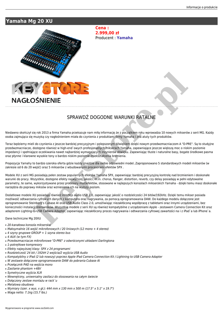 Informacje o produkcie Yamaha Mg 20 XU Cena : 2.999,00 zł or e. pl Producent : Yamaha SPRAWDŹ DOGODNE WARUNKI RATALNE Niedawno skończył się rok 2013 a firma Yamaha przekazuje nam miłą informację że z początkiem roku wprowadza 10 nowych mikserów z serii MG. Każdy osoba zajmująca się muzyką czy nagłośnieniem miała do czynienia z produktami firmy Yamaha i zna atuty tych produktów. St Teraz będziemy mieli do czynienia z jeszcze bardziej precyzyjnym i polepszonym dźwiękiem dzięki nowym przedwzmacniaczom A "D-PRE". Są to studyjne przedwzmacniacze, dostępne również w high-end`owych profesjonalnych mikserach Yamaha, zapewniające jeszcze większą moc o niskim poziomie impedancji i spełniające oczekiwania nawet najbardziej wymagających inżynierów dźwięku. Zapewniając tłuste i naturalne basy, bogate środkowe pasma oraz płynne i klarowne wysokie tony o bardzo niskim poziomie zniekształcenia brzmienia. Propozycja Yamahy to bardzo szeroka oferta gdzie każdy znajdzie dla siebie odpowiedni model..Zaproponowano 5 standardowych modeli mikserów (w zakresie od 6 do 20 wejść) oraz 5 mikserów z wbudowanymi procesorami efektów SPX . ey Modele XU z serii MG posiadają pełen zestaw popularnych efektów Yamaha SPX, zapewniając bardziej precyzyjną kontrolę nad brzmieniem i doskonałe warunki do pracy. Wszystkie, dostępne efekty najwyższej jakości, m.in. chorus, flanger, distortion, reverb, czy delay posiadają w pełni edytowalne parametry, te same, wykorzystywane przez procesory multiefektów, stosowane w najlepszych konsolach mikserskich Yamaha - dzięki temu masz doskonałe narzędzia do poprawy miksów oraz wzniesienia ich na wyższy poziom. K Dodatkowe modele XU posiadają również interfejs audio USB 2.0, zapewniając jakość o rozdzielczości 24 bitów/192kHz. Dzięki temu mikser posiada możliwość odtwarzania cyfrowych danych z komputera oraz nagrywania, za pomocą oprogramowania DAW. Do każdego modelu dołączone jest oprogramowanie Steinberg’s Cubase AI oraz USB Audio Class 2.0, umożliwiając niezakłóconą współpracę z tabletami oraz innymi urządzeniami, bez konieczności instalacji sterowników. Wszystkie modele z serii XU są również kompatybilne z urządzeniami Apple - zestawem Camera Connection Kit oraz adapterem Lighting-to-USB Camera Adapter, zapewniając niezakłócony proces nagrywania i odtwarzania cyfrowej zawartości na i z iPad`a lub iPhone`a. Dane techniczne Mg 20XU ● ● ● ● ● ● ● ● ● ● ● ● ● ● ● ● ● ● 20-kanałowa konsola mikserska Maksymalnie 16 wejść mikrofonowych / 20 liniowych (12 mono + 4 stereo) 4 szyny grupowe GROUP + 1 szyna stereo bus 4 AUX (w tym FX) Przedwzmacniacze mikrofonowe "D-PRE" z odwróconymi układami Darlingtona 1-pokrętłowe kompresory Efekty najwyższej klasy: SPX z 24 programami Rozdzielczość 24 bit / 192kH 2 wejścia/2 wyjścia USB Audio Kompatybilny z iPad (2 lub nowszy) poprzez Apple iPad Camera Connection Kit / Lightning to USB Camera Adapter W zestawie dołączone oprogramowanie DAW do pobrania Cubase AI Przełącznik PAD na wejścia mono Zasilanie phantom +48V Symetryczne wyjścia XLR Wewnętrzny, uniwersalny zasilacz do stosowania na całym świecie Dołączony zestaw montażu w rack`u Metalowa obudowa Wymiary (szer. x wys. x gł.): 444 mm x 130 mm x 500 m (17.5" x 5.1" x 19.7") Waga netto: 7.1kg (15.7 lbs.) Wygenerowano w programie www.oscGold.com Firma KeyStor pragnie poinformować że pierwsza dostaw już niebawem będzie dostępna w naszym salonie-Zapraszamy na testy. __ K ey St or e. pl MG-Promo