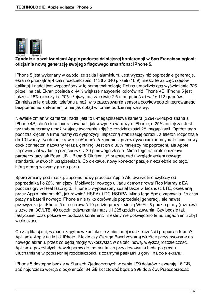 TECHNOLOGIE: Apple ogłasza iPhone 5 Zgodnie z oczekiwaniami Apple podczas dzisiejszej konferencji w San Francisco ogłosił oficjalnie nową generację swojego flagowego smartfona: iPhone 5. iPhone 5 jest wykonany w całości ze szkła i aluminium. Jest wyższy niż poprzednie generacje, ekran o przekątnej 4 cali i rozdzielczości 1136 x 640 pikseli (16:9) mieści teraz pięć rzędów aplikacji i nadal jest wyposażony w tę samą technologię Retina umożliwiającą wyświetlenie 326 pikseli na cal. Ekran posiada o 44% większe nasycenie kolorów niż iPhone 4S. iPhone 5 jest także o 18% cieńszy i o 20% lżejszy, ma zaledwie 7,6 mm grubości i waży 112 gramów. Zmniejszenie grubości telefonu umożliwiło zastosowanie sensora dotykowego zintegrowanego bezpośrednio z ekranem, a nie jak dotąd w formie oddzielnej warstwy. Niewiele zmian w kamerze: nadal jest to 8-megapikselowa kamera (3264x2448px) znana z iPhone 4S, choć nieco podrasowana i, jak wszystko w nowym iPhonie, o 25% mniejsza. Jest też tryb panoramy umożliwiający tworzenie zdjęć o rozdzielczości 28 megapikseli. Oprócz tego podczas kręcenia filmu mamy do dyspozycji ulepszoną stabilizację obrazu, a telefon rozpoznaje do 10 twarzy. Na dolnej krawędzi iPhone'a 5 zgodnie z przewidywaniami mamy natomiast nowy dock connector, nazwany teraz Lightning. Jest on o 80% mniejszy niż poprzedni, ale Apple zapowiedział wydanie przejściówki z 30-pinowego złącza. Mimo tego naturalnie czołowi partnerzy tacy jak Bose, JBL, Bang & Olufsen już pracują nad uwzględnieniem nowego standardu w swoich urządzeniach. Co ciekawe, nowy konektor pasuje niezależnie od tego, którą stroną włożymy go do portu. Spore zmiany pod maską: zupełnie nowy procesor Apple A6, dwukrotnie szybszy od poprzednika i o 22% mniejszy. Możliwości nowego układu demonstrował Rob Murray z EA podczas gry w Real Racing 3. iPhone 5 wyposażony został także w łączność LTE, określaną przez Apple mianem 4G, jak również HSPA+ i DC-HSDPA. Mimo tego Apple zapewnia, że czas pracy na baterii nowego iPhone'a nie tylko dorównuje poprzedniej generacji, ale nawet przewyższa ją. iPhone 5 ma oferować 10 godzin pracy z siecią Wi-Fi i 8 godzin pracy (rozmów) z użyciem 3G/LTE, 40 godzin odtwarzania muzyki i 225 godzin czuwania. Czy będzie tak faktycznie, czas pokaże — podczas konferencji niestety nie poświęcono temu zagadnieniu zbyt wiele czasu. Co z aplikacjami, wypada zapytać w kontekście zmienionej rozdzielczości i proporcji ekranu? Aplikacje Apple takie jak iPhoto, iMovie czy Garage Band zostaną wkrótce przystosowane do nowego ekranu, przez co będą mogły wykorzystać w całości nową, większą rozdzielczość. Aplikacje pozostałych deweloperów do momentu ich przystosowania będa po prostu uruchamiane w poprzedniej rozdzielczości, z czarnymi paskami u góry i na dole ekranu. iPhone 5 dostępny będzie w Stanach Zjednoczonych w cenie 199 dolarów za wersję 16 GB, zaś najdroższa wersja o pojemności 64 GB kosztować będzie 399 dolarów. Przedsprzedaż 1/2 TECHNOLOGIE: Apple ogłasza iPhone 5 rusza tam już w ten piątek, a rozpoczęcie sprzedaży nastąpi tydzień później, 21 października. W Polsce nowy smartfon Apple pojawi się nieco później. Jednocześnie obniżona zostaje cena iPhone'a 4S 16 GB — do 99 dolarów. Premiera nowego systemu operacyjnego iOS 6 nastąpi 19 października. Będą mogli pobrać go użytkownicy iPhone'ów 3GS i nowszych, a także naturalnie wszystkich generacji iPadów oraz czwartej generacji iPodów touch. 12.09.2012 Dobreprogramy.pl 2/2