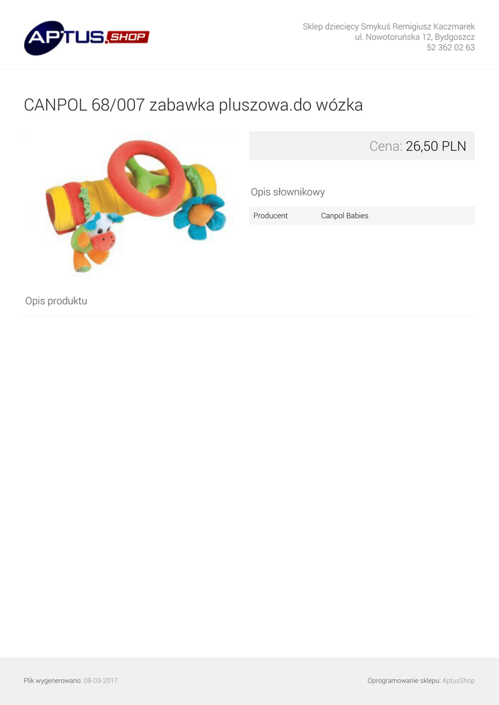 Sklep dziecięcy Smykuś Remigiusz Kaczmarek ul. Nowotoruńska 12, Bydgoszcz 52 362 02 63 CANPOL 68/007 zabawka pluszowa.do wózka Cena: 26,50 PLN Opis słownikowy Producent Canpol Babies Opis produktu Plik wygenerowano: 08-03-2017 Powered by TCPDF (www.tcpdf.org) Oprogramowanie sklepu: AptusShop