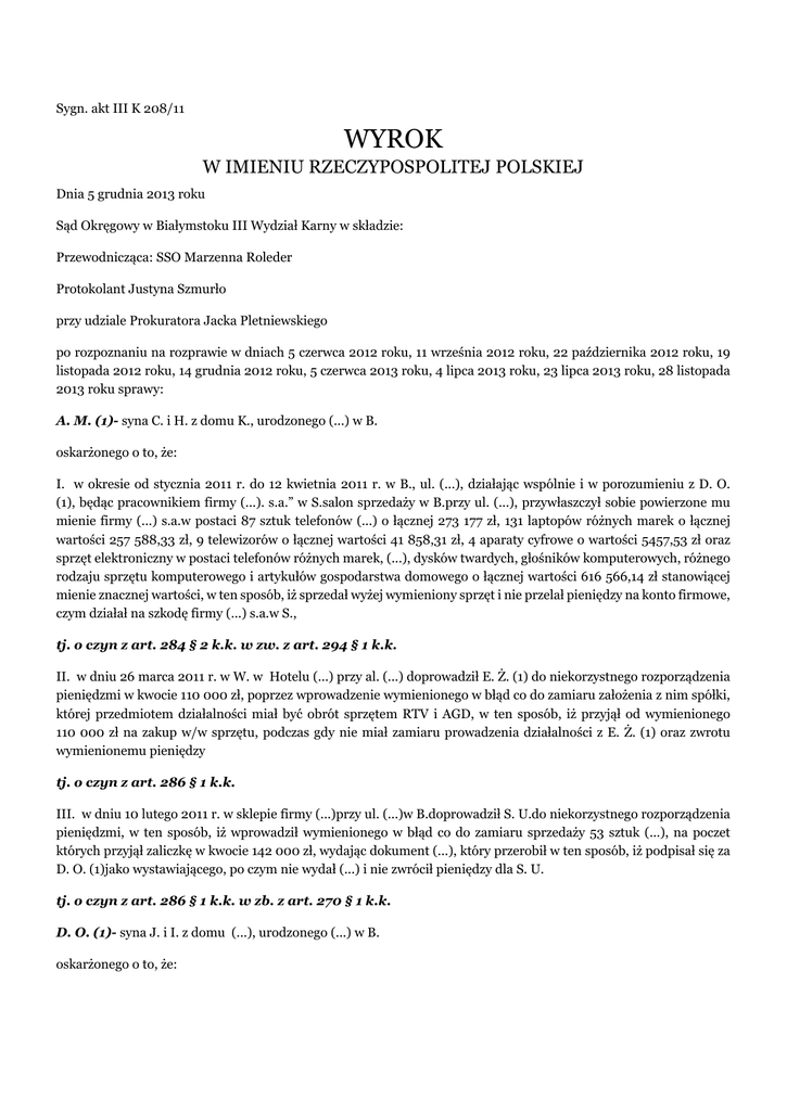 Sygn. akt III K 208/11 WYROK W IMIENIU RZECZYPOSPOLITEJ POLSKIEJ Dnia 5 grudnia 2013 roku Sąd Okręgowy w Białymstoku III Wydział Karny w składzie: Przewodnicząca: SSO Marzenna Roleder Protokolant Justyna Szmurło przy udziale Prokuratora Jacka Pletniewskiego po rozpoznaniu na rozprawie w dniach 5 czerwca 2012 roku, 11 września 2012 roku, 22 października 2012 roku, 19 listopada 2012 roku, 14 grudnia 2012 roku, 5 czerwca 2013 roku, 4 lipca 2013 roku, 23 lipca 2013 roku, 28 listopada 2013 roku sprawy: A. M. (1)- syna C. i H. z domu K., urodzonego (...) w B. oskarżonego o to, że: I. w okresie od stycznia 2011 r. do 12 kwietnia 2011 r. w B., ul. (...), działając wspólnie i w porozumieniu z D. O. (1), będąc pracownikiem firmy (...). s.a.” w S.salon sprzedaży w B.przy ul. (...), przywłaszczył sobie powierzone mu mienie firmy (...) s.a.w postaci 87 sztuk telefonów (...) o łącznej 273 177 zł, 131 laptopów różnych marek o łącznej wartości 257 588,33 zł, 9 telewizorów o łącznej wartości 41 858,31 zł, 4 aparaty cyfrowe o wartości 5457,53 zł oraz sprzęt elektroniczny w postaci telefonów różnych marek, (...), dysków twardych, głośników komputerowych, różnego rodzaju sprzętu komputerowego i artykułów gospodarstwa domowego o łącznej wartości 616 566,14 zł stanowiącej mienie znacznej wartości, w ten sposób, iż sprzedał wyżej wymieniony sprzęt i nie przelał pieniędzy na konto firmowe, czym działał na szkodę firmy (...) s.a.w S., tj. o czyn z art. 284 § 2 k.k. w zw. z art. 294 § 1 k.k. II. w dniu 26 marca 2011 r. w W. w Hotelu (...) przy al. (...) doprowadził E. Ż. (1) do niekorzystnego rozporządzenia pieniędzmi w kwocie 110 000 zł, poprzez wprowadzenie wymienionego w błąd co do zamiaru założenia z nim spółki, której przedmiotem działalności miał być obrót sprzętem RTV i AGD, w ten sposób, iż przyjął od wymienionego 110 000 zł na zakup w/w sprzętu, podczas gdy nie miał zamiaru prowadzenia działalności z E. Ż. (1) oraz zwrotu wymienionemu pieniędzy tj. o czyn z art. 286 § 1 k.k. III. w dniu 10 lutego 2011 r. w sklepie firmy (...)przy ul. (...)w B.doprowadził S. U.do niekorzystnego rozporządzenia pieniędzmi, w ten sposób, iż wprowadził wymienionego w błąd co do zamiaru sprzedaży 53 sztuk (...), na poczet których przyjął zaliczkę w kwocie 142 000 zł, wydając dokument (...), który przerobił w ten sposób, iż podpisał się za D. O. (1)jako wystawiającego, po czym nie wydał (...) i nie zwrócił pieniędzy dla S. U. tj. o czyn z art. 286 § 1 k.k. w zb. z art. 270 § 1 k.k. D. O. (1)- syna J. i I. z domu (...), urodzonego (...) w B. oskarżonego o to, że: IV. w okresie od stycznia 2011 r. do 12 kwietnia 2011 r. w B.działając wspólnie i w porozumieniu z A. M. (1), będąc kierownikiem salonu sprzedaży przy ul. (...)w B.firmy (...) s.a.w S.przywłaszczył sobie powierzone mu firmy (...) s.a.w postaci 87 sztuk telefonów (...) o łącznej 273 177 zł, 131 laptopów różnych marek o łącznej wartości 257 588,33 zł, 9 telewizorów o łącznej wartości 41 858,31 zł, 4 aparaty cyfrowe o wartości 5457,53 zł oraz sprzęt elektroniczny w postaci telefonów różnych marek, (...), dysków twardych, głośników komputerowych, różnego rodzaju sprzętu komputerowego i artykułów gospodarstwa domowego o łącznej wartości 616 566,14 zł stanowiącej mienie znacznej wartości, w ten sposób, iż sprzedał wyżej wymieniony sprzęt i nie przelał pieniędzy na konto firmowe, czym działał na szkodę firmy (...) s.a.w S., tj. o czyn z art. 284 § 1 k.k. w zw. z art. 294 § 1 k.k. V. w dniu 10 lutego 2011 r. w sklepie firmy (...)przy ul. (...)w B.działając wspólnie i w porozumieniu z A. M. (1)doprowadził S. U.do niekorzystnego rozporządzenia pieniędzmi, w ten sposób, iż wprowadził wymienionego w błąd co do zamiaru sprzedaży 53 sztuk (...), na poczet których przyjął zaliczkę w kwocie 142 000 zł, po czym nie wydał(...) i nie zwrócił pieniędzy, tj. o czyn z art. 286 § 1 k.k. VI. bliżej nieustalonego dnia w okresie od 14 stycznia 2011 r. do 13 kwietnia 2011 r. w B.działając w celu osiągnięcia korzyści majątkowej, bez zgody firmy (...)uzyskał na dysk twardy w swoim komputerze m-ki (...)o nr (...)system operacyjny (...)o wartości 1300 zł oraz oprogramowanie „(...)o wartości 1853 zł czym działał na szkodę firmy (...) tj. o czyn z art. 278 § 2 k.k. 1. oskarżonego A. M. (1)uznaje za winnego tego, że w okresie od stycznia 2011 r. do 12 kwietnia 2011 r. w B., ul. (...), działając wspólnie i w porozumieniu z D. O. (1), będąc pracownikiem firmy (...). s.a.” w S.salon sprzedaży w B.przy ul. (...), przywłaszczył sobie powierzone mu mienie firmy (...) s.a.w postaci: telefonów różnych (...), laptopów różnych marek, telewizorów, aparatów cyfrowych oraz sprzętu elektronicznego w postaci (...), dysków twardych, głośników komputerowych, różnego rodzaju sprzętu komputerowego i artykułów gospodarstwa domowego o łącznej wartości 542323,49 zł stanowiącej mienie znacznej wartości, w ten sposób, iż sprzedał wyżej wymieniony sprzęt i nie przelał pieniędzy na konto firmowe, czym działał na szkodę firmy (...) s.a.w S., tj. czynu z art. 284 § 2 k.k. w zw. z art. 294 § 1 k.k. i za to na mocy art. art. 284 § 2 k.k. w zw. z art. 294 § 1 k.k. skazuje go i wymierza mu karę 2(dwóch) lat pozbawienia wolności; 2. oskarżonego A. M. (1) uznaje za winnego czynu z punktu II i za to na mocy art. 286§1 kk skazuje go i wymierza mu karę 1(jednego) roku pozbawienia wolności; 3. oskarżonego A. M. (1) uznaje za winnego czynu z punktu III i za to na mocy art. 286§1 kk w zb. z art.270§1 kk w zw. z art.11§2 kk skazuje go, zaś na mocy art. 286§1 kk w zw. z art.11§3 kk wymierza mu karę 1(jednego) roku pozbawienia wolności; 4. na mocy art. 85kk, art.86§1 kk wymierza oskarżonemu A. M. (1) łączną karę 3(trzech) lat pozbawienia wolności; 5. 