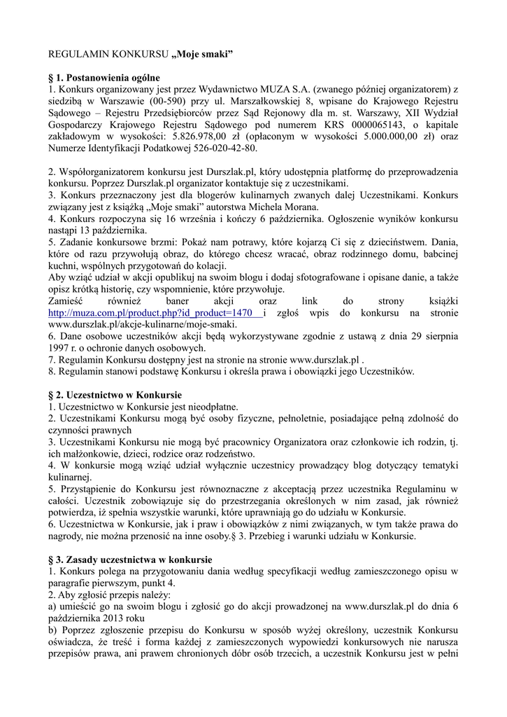 REGULAMIN KONKURSU „Moje smaki” § 1. Postanowienia ogólne 1. Konkurs organizowany jest przez Wydawnictwo MUZA S.A. (zwanego później organizatorem) z siedzibą w Warszawie (00-590) przy ul. Marszałkowskiej 8, wpisane do Krajowego Rejestru Sądowego – Rejestru Przedsiębiorców przez Sąd Rejonowy dla m. st. Warszawy, XII Wydział Gospodarczy Krajowego Rejestru Sądowego pod numerem KRS 0000065143, o kapitale zakładowym w wysokości: 5.826.978,00 zł (opłaconym w wysokości 5.000.000,00 zł) oraz Numerze Identyfikacji Podatkowej 526-020-42-80. 2. Współorganizatorem konkursu jest Durszlak.pl, który udostępnia platformę do przeprowadzenia konkursu. Poprzez Durszlak.pl organizator kontaktuje się z uczestnikami. 3. Konkurs przeznaczony jest dla blogerów kulinarnych zwanych dalej Uczestnikami. Konkurs związany jest z książką „Moje smaki” autorstwa Michela Morana. 4. Konkurs rozpoczyna się 16 września i kończy 6 października. Ogłoszenie wyników konkursu nastąpi 13 października. 5. Zadanie konkursowe brzmi: Pokaż nam potrawy, które kojarzą Ci się z dzieciństwem. Dania, które od razu przywołują obraz, do którego chcesz wracać, obraz rodzinnego domu, babcinej kuchni, wspólnych przygotowań do kolacji. Aby wziąć udział w akcji opublikuj na swoim blogu i dodaj sfotografowane i opisane danie, a także opisz krótką historię, czy wspomnienie, które przywołuje. Zamieść również baner akcji oraz link do strony książki http://muza.com.pl/product.php?id_product=1470 i zgłoś wpis do konkursu na stronie www.durszlak.pl/akcje-kulinarne/moje-smaki. 6. Dane osobowe uczestników akcji będą wykorzystywane zgodnie z ustawą z dnia 29 sierpnia 1997 r. o ochronie danych osobowych. 7. Regulamin Konkursu dostępny jest na stronie na stronie www.durszlak.pl . 8. Regulamin stanowi podstawę Konkursu i określa prawa i obowiązki jego Uczestników. § 2. Uczestnictwo w Konkursie 1. Uczestnictwo w Konkursie jest nieodpłatne. 2. Uczestnikami Konkursu mogą być osoby fizyczne, pełnoletnie, posiadające pełną zdolność do czynności prawnych 3. Uczestnikami Konkursu nie mogą być pracownicy Organizatora oraz członkowie ich rodzin, tj. ich małżonkowie, dzieci, rodzice oraz rodzeństwo. 4. W konkursie mogą wziąć udział wyłącznie uczestnicy prowadzący blog dotyczący tematyki kulinarnej. 5. Przystąpienie do Konkursu jest równoznaczne z akceptacją przez uczestnika Regulaminu w całości. Uczestnik zobowiązuje się do przestrzegania określonych w nim zasad, jak również potwierdza, iż spełnia wszystkie warunki, które uprawniają go do udziału w Konkursie. 6. Uczestnictwa w Konkursie, jak i praw i obowiązków z nimi związanych, w tym także prawa do nagrody, nie można przenosić na inne osoby.§ 3. Przebieg i warunki udziału w Konkursie. § 3. Zasady uczestnictwa w konkursie 1. Konkurs polega na przygotowaniu dania według specyfikacji według zamieszczonego opisu w paragrafie pierwszym, punkt 4. 2. Aby zgłosić przepis należy: a) umieścić go na swoim blogu i zgłosić go do akcji prowadzonej na www.durszlak.pl do dnia 6 października 2013 roku b) Poprzez zgłoszenie przepisu do Konkursu w sposób wyżej określony, uczestnik Konkursu oświadcza, że treść i forma każdej z zamieszczonych wypowiedzi konkursowych nie narusza przepisów prawa, ani prawem chronionych dóbr osób trzecich, a uczestnik Konkursu jest w pełni uprawniony do zgłoszenia każdej z wypowiedzi konkursowych. c) Uczestnik Konkursu zobowiązuje się umieścić na swoim blogu baner akcji, który będzie można pobrać na stronie www.durszlak.pl/akcje-kulinarne/moje-smaki. Baner akcji musi pozostać na blogu do zakończenia Konkursu. 3. Z tytułu złożonego powyżej oświadczenia Uczestnik przyjmuje na siebie pełną odpowiedzialność prawną. W przypadku jakichkolwiek roszczeń ze strony osób trzecich Uczestnik, po zawiadomieniu go przez Organizatora, nie uchyli się od niezwłocznego przystąpienia do wyjaśnienie wyjaśnienia sprawy oraz wystąpi przeciwko takim roszczeniom na własny koszt i ryzyko, a nadto zaspokoi wszelkie uzasadnione roszczenia, a w razie ich zasądzenia od Organizatora, regresowo zwróci całość pokrytych roszczeń oraz wszelkie związane z tym wydatki i opłaty, włączając w to koszty procesu i obsługi prawnej, a także naprawi wszelkie inne szkody wynikające z wyżej opisanych roszczeń osób trzecich. 4. Można dodać maksymalnie 4 wpisy z jednego bloga. § 4. Zasady wyłaniania zwycięzców 1. Laureatów Konkursu wybiera jury konkursowe w składzie jednoosobowym :Michel Moran. 2. Konkurs rozpoczyna się 16 września, a kończy 6 października 2013 roku. 3. Laureaci zostaną ogłoszeni 13 października 2013 roku i poinformowani o tym przez stronę www.durszlak.pl 4. W skład jury wchodzi Michel Moran. 5. Ocenie w konkursie podlegać będą: zgodność przepisów z treścią zadania, jego jakość (język, stylistyka, dokładność opisania czynności), kreatywność, estetyka przedstawionego przepisu. 6. Decyzja jury jest niepodważalna i ostateczna. § 5. Nagrody 1. Laureat główny otrzyma dwuosobowe zaproszenie na kolację w restauracji Bistro de Paris (pl. Piłsudskiego 9, 00-078 Warszawa). W przypadku wygranej osoby zamieszkałej poza terenem Warszawy koszty podróży oraz noclegu pokrywa Wydawnictwo MUZA S.A. 2. Dziesięciu (10) wyróżnionych blogerów w konkursie od Wydawnictwa MUZA S.A. otrzyma bony o wartości 100 złotych do wykorzystania w sklepie internetowym Wydawnictwa MUZA S.A. oaz egzemplarz książki „Moje smaki” Michela Morana. 3. Laureaci zostaną powiadomieni o wygranej przez serwis durszlak.pl. 4. Organizator nie ponosi odpowiedzialności za nieprawidłowości związane z opóźnieniem lub niedoręczeniem powiadomienia o wygranej wynikające z błędnego podania przez nagrodzonego uczestnika konkursu numeru telefonu oraz adresu, na który zostało wysłane powiadomienie o nagrodzie. 5. Organizator nie p