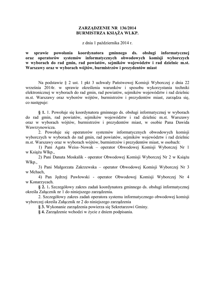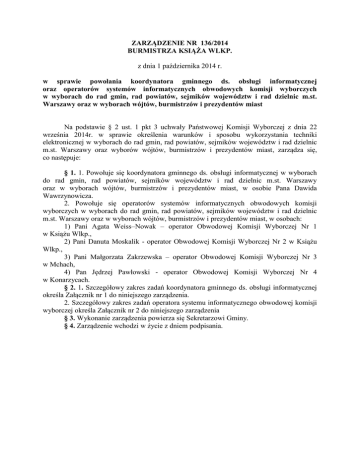 ZARZĄDZENIE NR 136/2014 BURMISTRZA KSIĄŻA WLKP. z dnia 1 października 2014 r. w sprawie powołania koordynatora gminnego ds. obsługi informatycznej oraz operatorów systemów informatycznych obwodowych komisji wyborczych w wyborach do rad gmin, rad powiatów, sejmików województw i rad dzielnic m.st. Warszawy oraz w wyborach wójtów, burmistrzów i prezydentów miast Na podstawie § 2 ust. 1 pkt 3 uchwały Państwowej Komisji Wyborczej z dnia 22 września 2014r. w sprawie określenia warunków i sposobu wykorzystania techniki elektronicznej w wyborach do rad gmin, rad powiatów, sejmików województw i rad dzielnic m.st. Warszawy oraz wyborów wójtów, burmistrzów i prezydentów miast, zarządza się, co następuje: § 1. 1. Powołuje się koordynatora gminnego ds. obsługi informatycznej w wyborach do rad gmin, rad powiatów, sejmików województw i rad dzielnic m.st. Warszawy oraz w wyborach wójtów, burmistrzów i prezydentów miast, w osobie Pana Dawida Wawrzynowicza. 2. Powołuje się operatorów systemów informatycznych obwodowych komisji wyborczych w wyborach do rad gmin, rad powiatów, sejmików województw i rad dzielnic m.st. Warszawy oraz w wyborach wójtów, burmistrzów i prezydentów miast, w osobach: 1) Pani Agata Weiss–Nowak – operator Obwodowej Komisji Wyborczej Nr 1 w Książu Wlkp., 2) Pani Danuta Moskalik - operator Obwodowej Komisji Wyborczej Nr 2 w Książu Wlkp., 3) Pani Małgorzata Zakrzewska – operator Obwodowej Komisji Wyborczej Nr 3 w Mchach, 4) Pan Jędrzej Pawłowski - operator Obwodowej Komisji Wyborczej Nr 4 w Konarzycach. § 2. 1. Szczegółowy zakres zadań koordynatora gminnego ds. obsługi informatycznej określa Załącznik nr 1 do niniejszego zarządzenia. 2. Szczegółowy zakres zadań operatora systemu informatycznego obwodowej komisji wyborczej określa Załącznik nr 2 do niniejszego zarządzenia § 3. Wykonanie zarządzenia powierza się Sekretarzowi Gminy. § 4. Zarządzenie wchodzi w życie z dniem podpisania. Załącznik nr 1do Zarządzenia Nr 136/2014 Burmistrza Książa Wlkp. z dnia 1 października 2014 r. Do zadań koordynatora gminnego ds. obsługi informatycznej należy: 1) udział w szkoleniach organizowanych przez koordynatora właściwego dla obszaru komisarza wyborczego; 2) wsparcie wprowadzania i aktualizacji w systemie informatycznym przez właściwe komórki organizacyjne U rzędu Miejskiego danych dotyczących obwodów głosowania i ich granic, liczby uprawnionych do głosowania na obszarze gminy oraz danych o liczbie udzielonych pełnomocnictw i liczbie wysłanych pakietów wyborczych, 3) nadzór nad wprowadzeniem do systemu danych członków (kandydatów na członków) obwodowych komisji wyborczych i aktualizacją składów przez właściwe komórki organizacyjne Urzędu Miejskiego; 4) prowadzenie ewidencji informacji operatorów obsługi informatycznej OKW zawierającej dane kontaktowe i ustalony sposób przekazywania haseł, oprogramowania oraz danych definiujących obwody głosowania, okręgi wyborcze i listy kandydatów; 5) przeprowadzenie szkolenia dla operatorów OKW na obszarze gminy w zakresie obsługi informatycznej wyborów samorządowych w obwodzie głosowania; 6) prowadzenie ewidencji wersji zainstalowanego oprogramowania i wersji danych definiujących wykaz obwodów, list i kandydatów; 7) przekazanie przewodniczącym OKW oraz operatorom obsługi informatycznej OKW loginów i haseł do pobrania licencji, a w sytuacji szczególnej przekazanie loginu i hasła dla pobrania licencji zastępcy przewodniczącego OKW; 8) dystrybucja oprogramowania oraz danych definicyjnych dla każdego obwodu głosowania bez dostępu do sieci Internet (poprzez pobranie ze stron internetowych i utworzenie nośników), także w przypadku testów, o którym mowa w punkcie 13; 9) dystrybucja aktualizowanych plików definicyjnych uwzględniających uzyskane od koordynatora komisarza wyborczego zmiany danych o kandydatach do rad oraz kandydatów na burmistrza dla obwodów nieposiadających dostępu do sieci Internet; 10) przyjmowanie uwag dotyczących działania programu oraz udzielanie wsparcia technicznego operatorom obsługi informatycznej OKW; 11) zgłaszanie uwag dotyczących działania programu koordynatorowi komisarza; 12) w przypadkach awaryjnych nawiązanie kontaktu i przekazanie informacji koordynatorowi komisarza; 13) udział w przygotowaniu i przeprowadzeniu testów ogólnokrajowych przekazywania danych testowych o wynikach głosowania ze wszystkich komisji obwodowych korzystających ze wsparcia informatycznego oraz organizacja wprowadzania i przekazywania danych testowych z obwodów nieposiadających obsługi informatycznej; 14) przekazanie do koordynatora komisarza wyborczego wniosków i spostrzeżeń w formie raportu podsumowującego przebieg testów ogólnokrajowych; 15) przygotowanie wydruków formularzy protokołów wyników głosowania w obwodzie (dla ewentualnego ręcznego sporządzenia protokołów); 16) w dniu głosowania – dwukrotne przekazanie danych o liczbie osób ujętych w spisie wyborców oraz o liczbie wydanych kart do głosowania (tzw. frekwencji) w sytuacji, o której mowa w pkt. 15 załącznika uchwały Państwowej Komisji Wyborczej z września 2014 r. w sprawie trybu i sposobu przekazywania przez komisarzy wyborczych obwodowe komisje wyborcze Państwowej Komisji Wyborczej w trakcie głosowania danych o liczbie osób uprawnionych do głosowania oraz o liczbie wyborców, którym wydano karty do głosowania w stałych obwodach głosowania w wyborach do rad gmin, rad powiatów, sejmików województw i rad dzielnic m. st. Warszawy oraz wyborów wójtów, burmistrzów i prezydentów miast w 2014 r.; 17) prowadzenie dziennika zdarzeń, w którym są odnotowywane wykonane czynności: a) przeprowadzenie szkolenia operatorów OKW z potwierdzeniem uczestnictwa, b) zgłaszanie z poziomu gminy uwag do działania programu do koordynatora komisarza wyborczego właściwego dla gminy, c) przygotowanie i otrzym